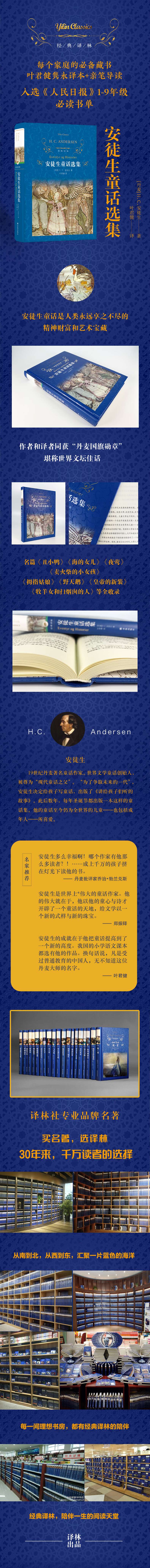 安徒生生前因创作童话曾被授予“丹麦国旗勋章”,而叶君健则因翻译安徒生童话,成为全世界至今*的获此殊荣的翻译家。安徒生与叶君健先后获得相同的勋章,被世界翻译界传为佳话。叶君健本人也因此被世界译坛誉为“中国的安徒生”。“经典译林”版《安徒生童话》附叶君健先生亲笔导读,安徒生名篇《丑小鸭》《海的女儿》《夜莺》《卖火柴的小女孩》《拇指姑娘》《野天鹅》《皇帝的新装》《牧羊女和扫烟囱的人》等全收录。