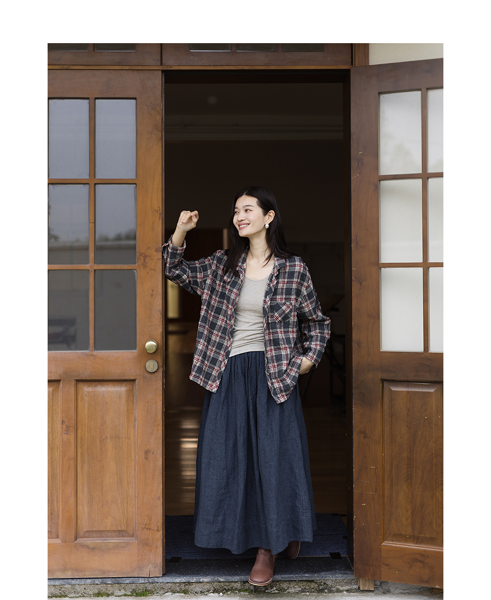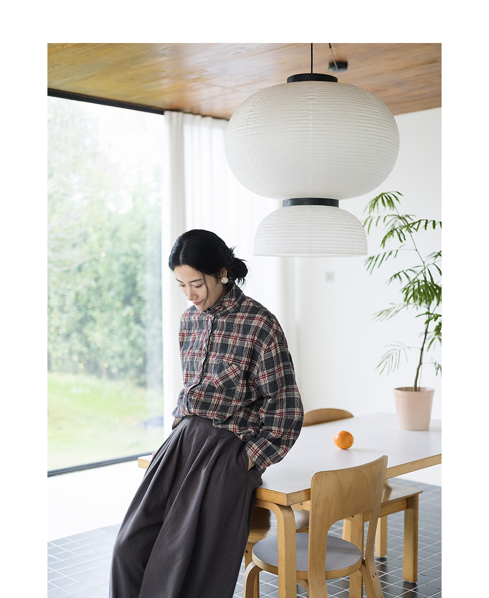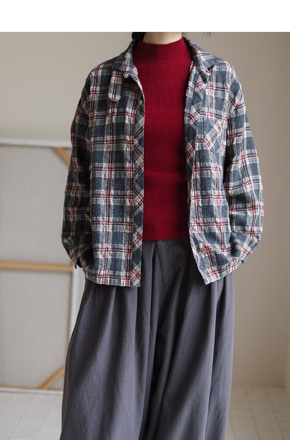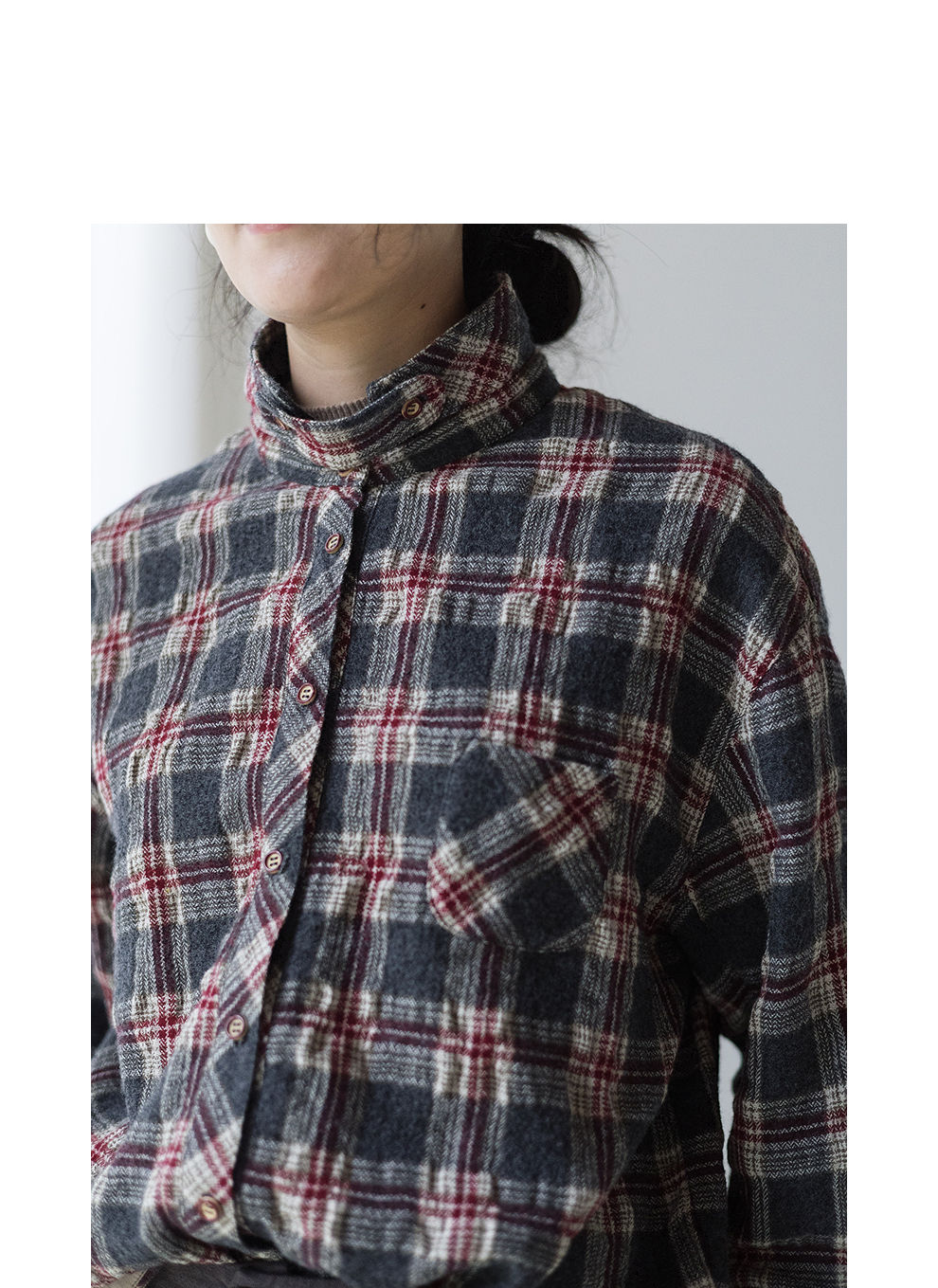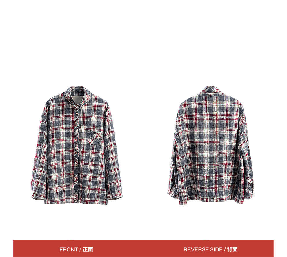 绽放839朵/羊毛棉撞色格纹微皱肌理感长袖衬衫女文艺百搭立领衬衣