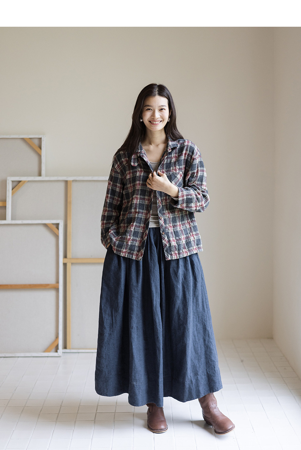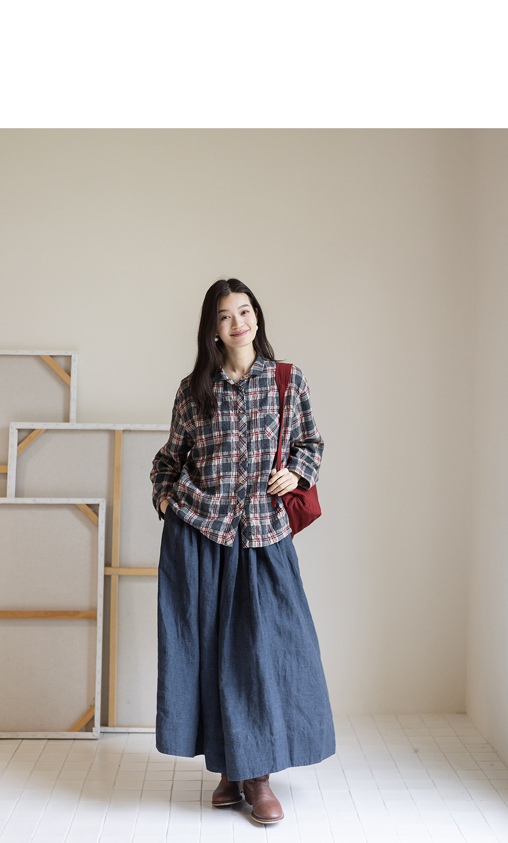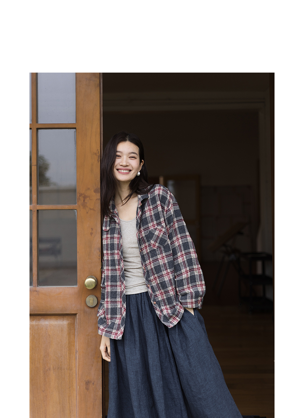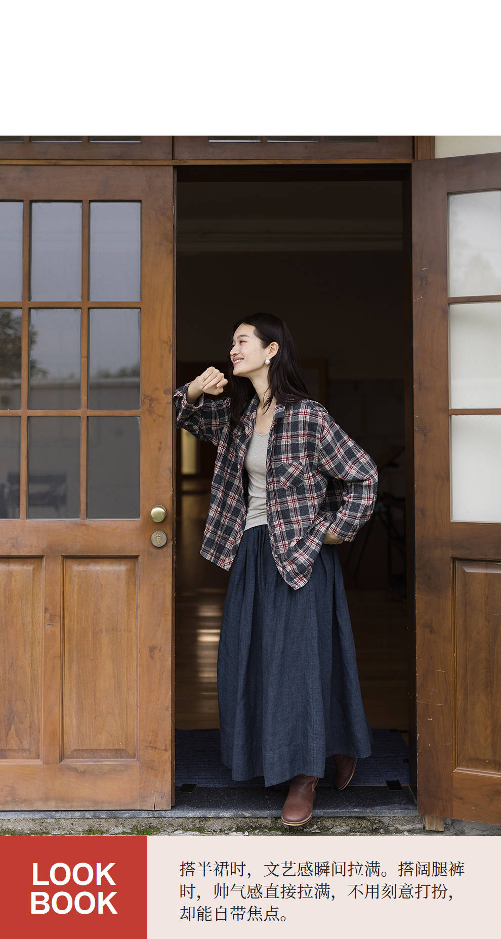 绽放839朵/羊毛棉撞色格纹微皱肌理感长袖衬衫女文艺百搭立领衬衣