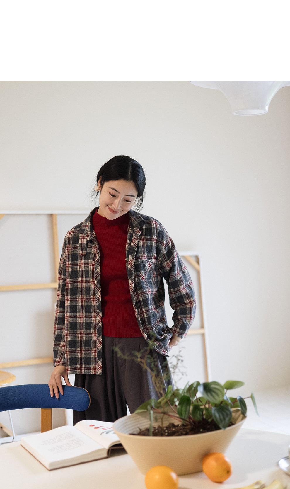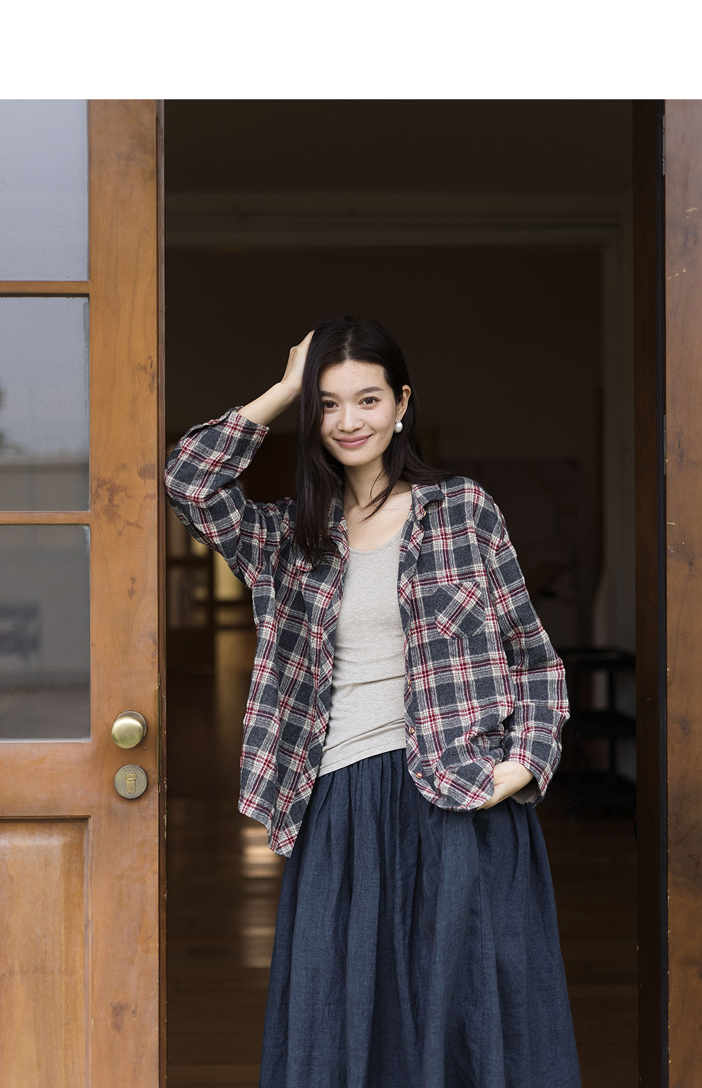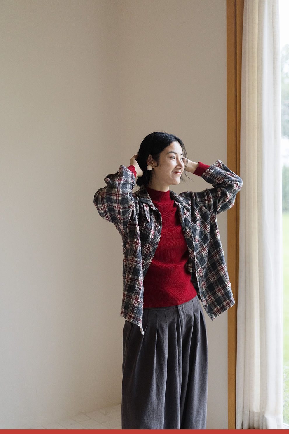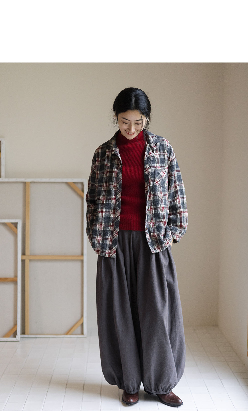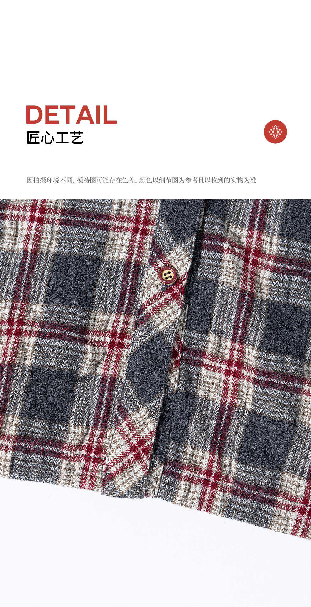 绽放839朵/羊毛棉撞色格纹微皱肌理感长袖衬衫女文艺百搭立领衬衣