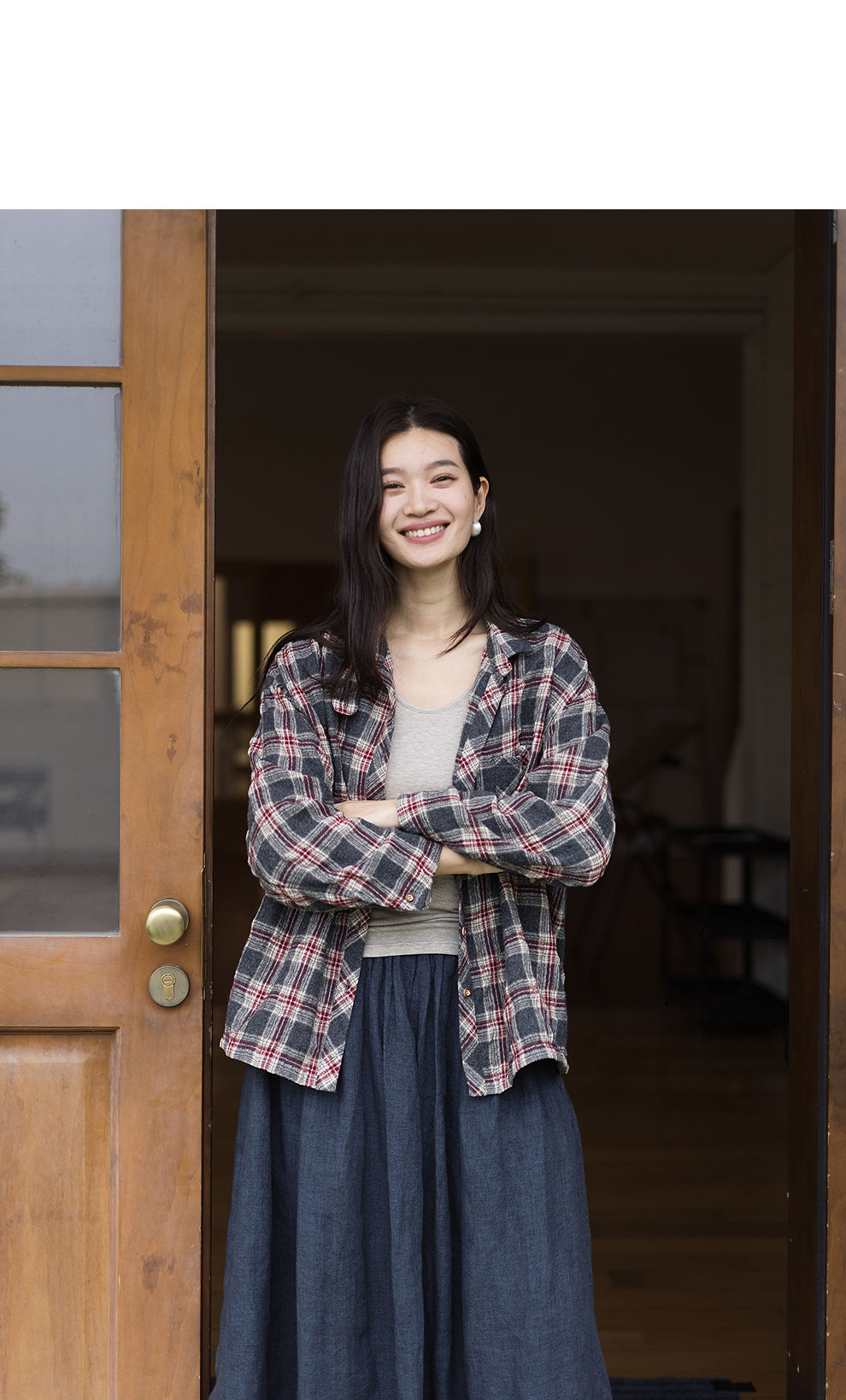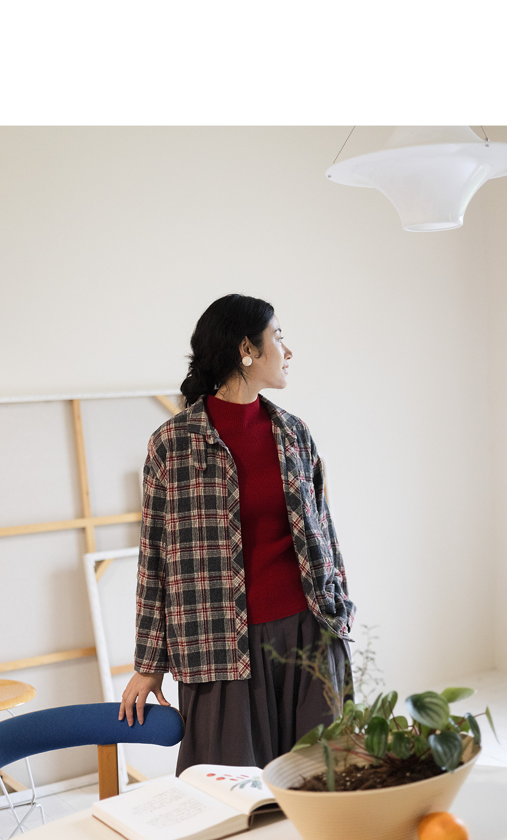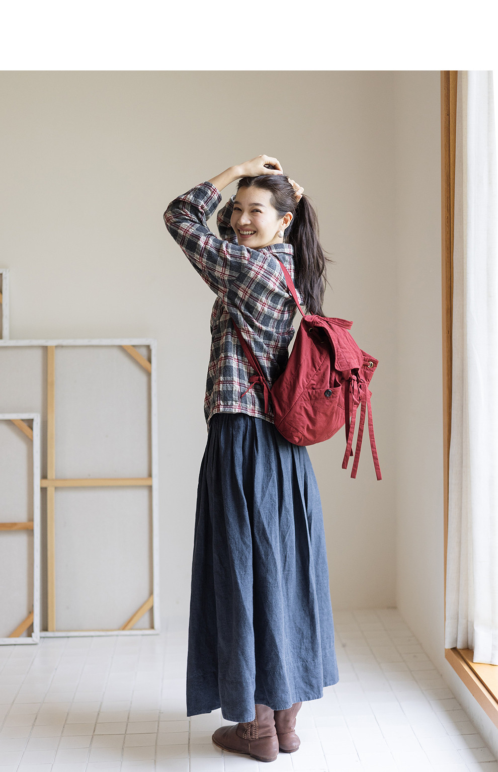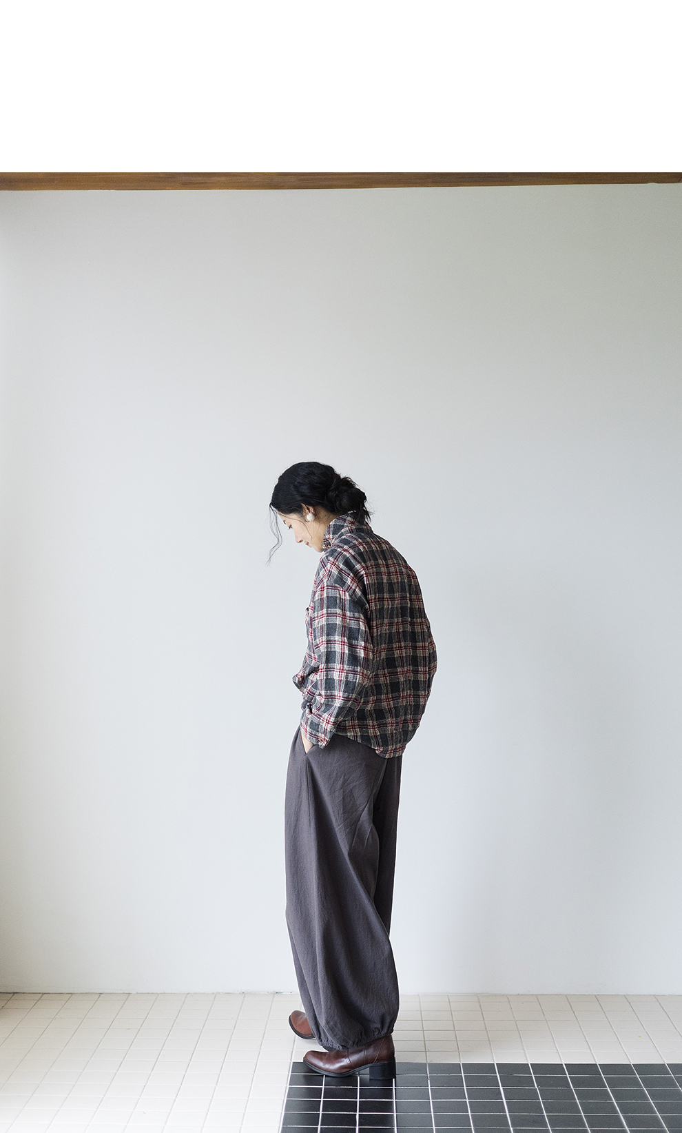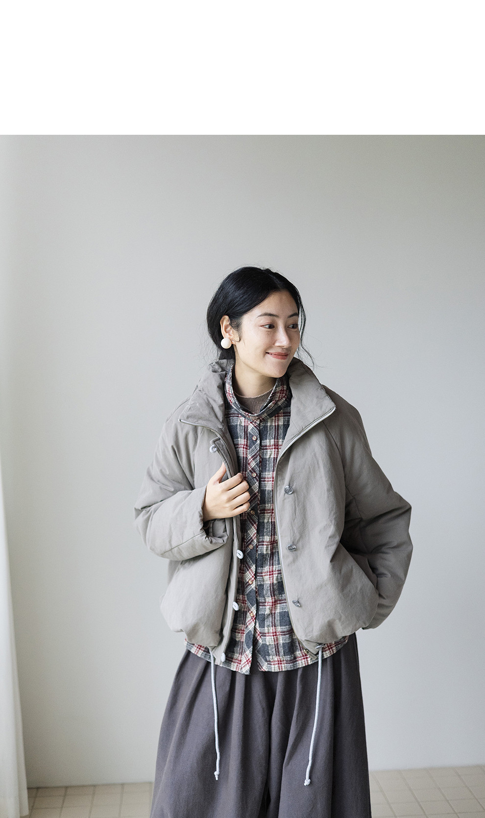 绽放839朵/羊毛棉撞色格纹微皱肌理感长袖衬衫女文艺百搭立领衬衣