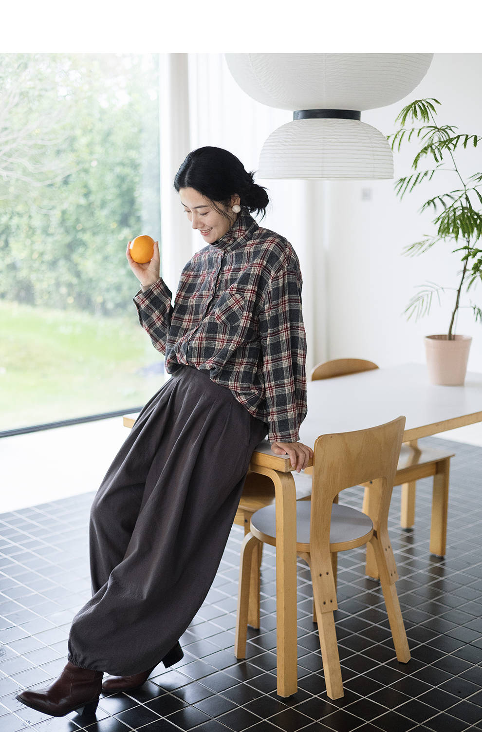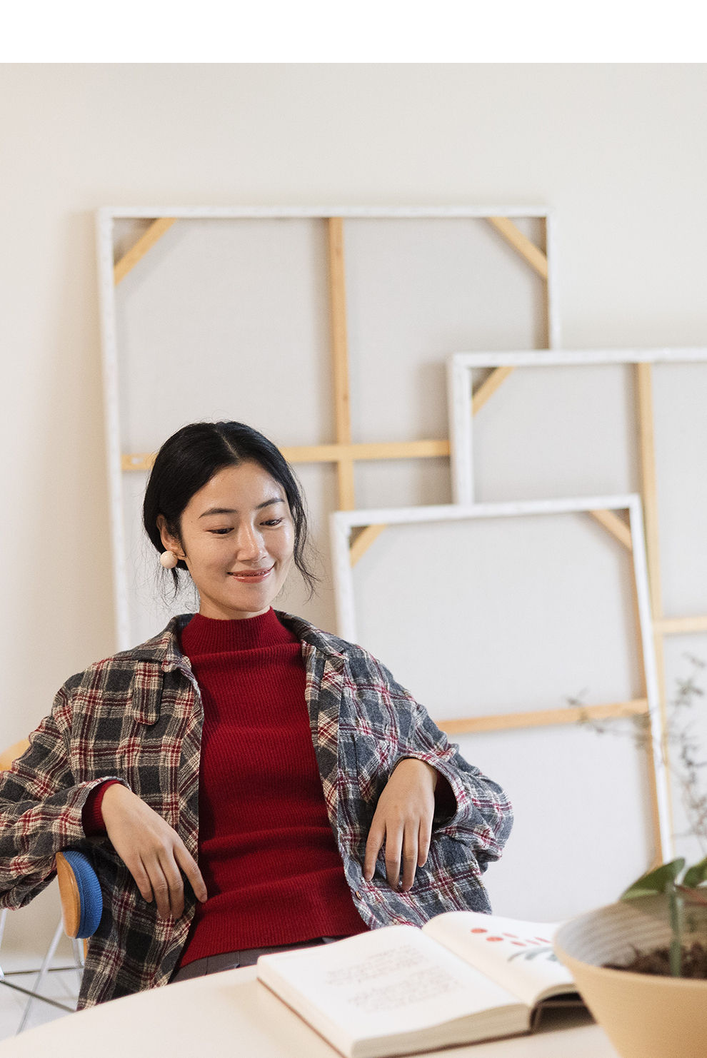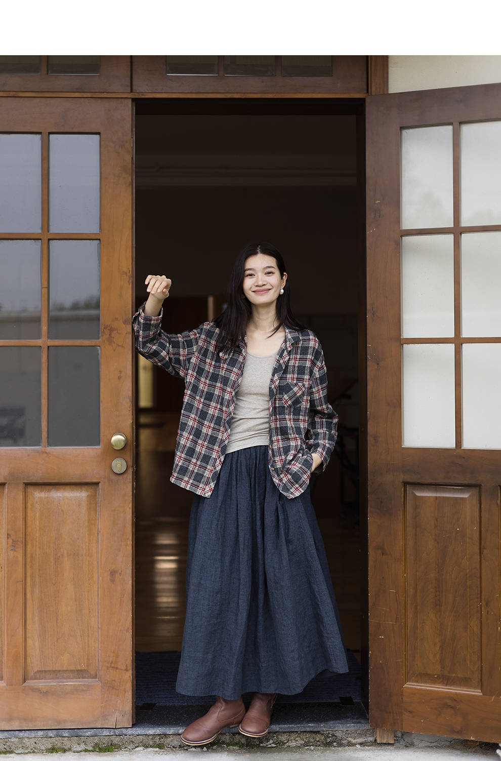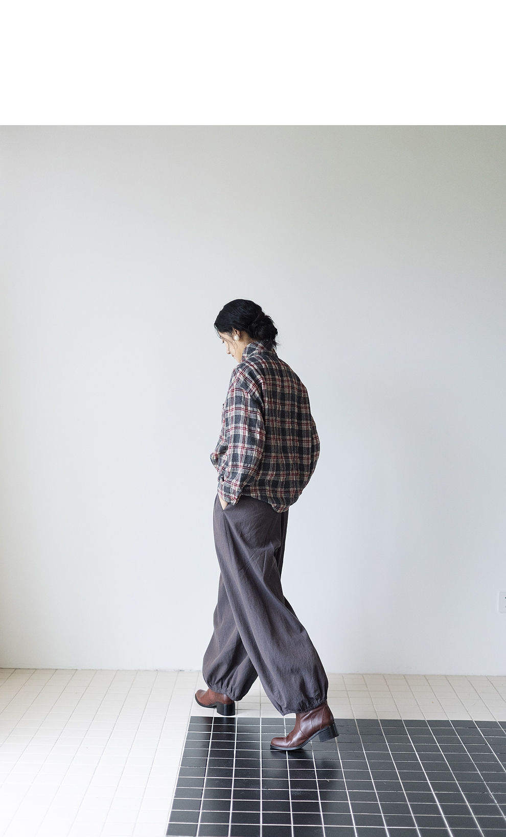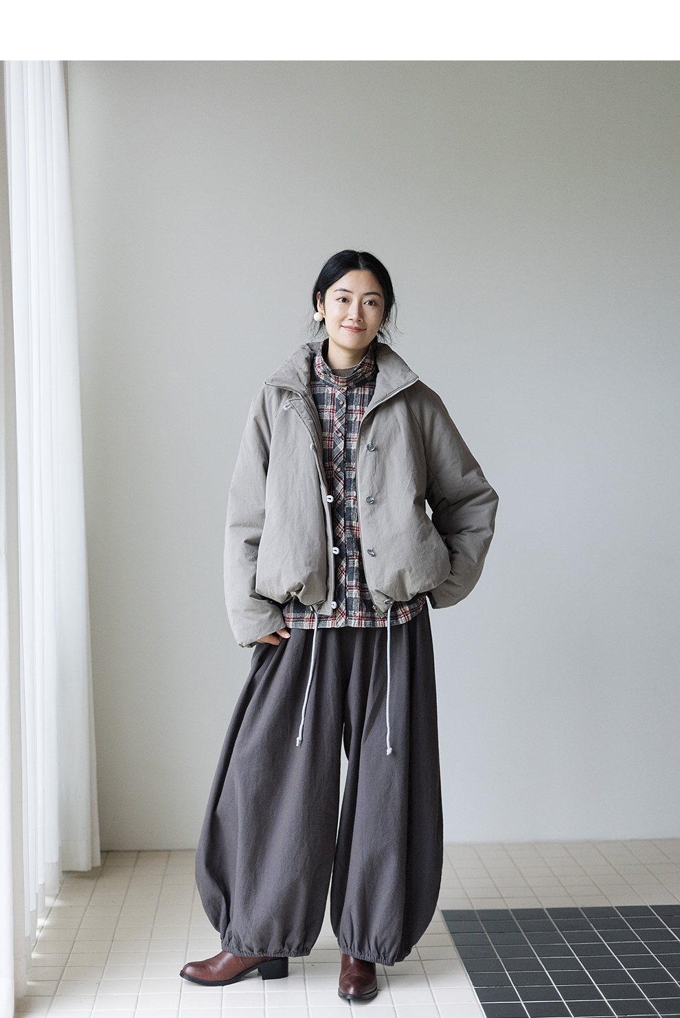 绽放839朵/羊毛棉撞色格纹微皱肌理感长袖衬衫女文艺百搭立领衬衣