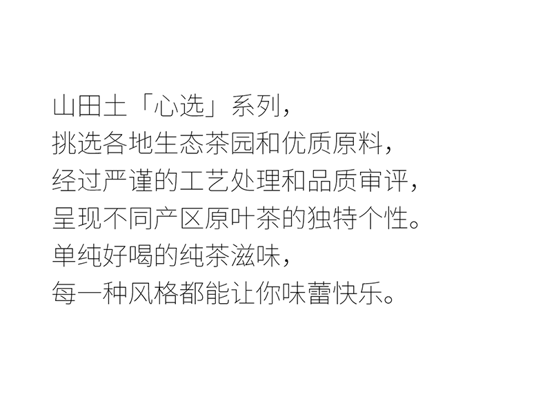 山田土是一个茶品牌。致力于走访茶区,寻找地方茶。亲眼看,亲口尝,将心比心挑选优质原料、把关工艺、审评质量,以有趣的方式呈现一杯干净好茶,让你饮用安心,感官愉悦。 产品包括:日常口粮茶,节庆茶礼,茶器
