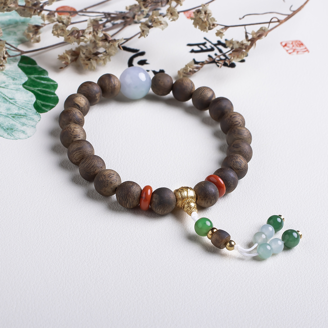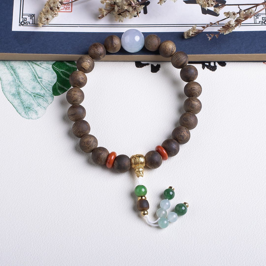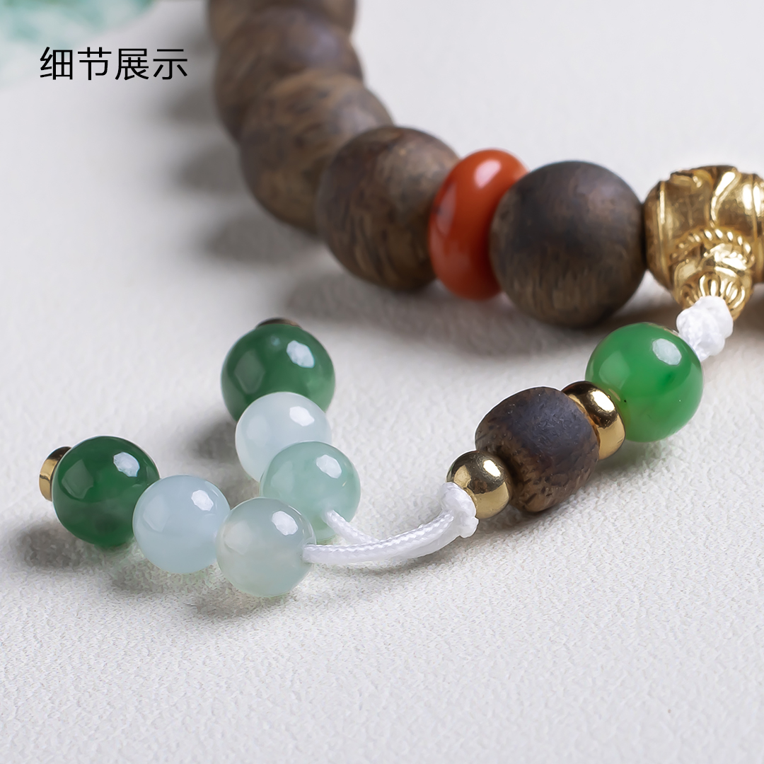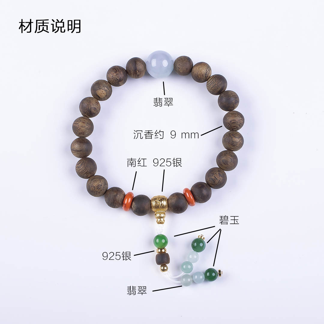 xy0514沉香+翡翠南红手持手串.银,天然沉香约9mm,原色原味,香味自然清甜,一颗糯冰底翡翠大圆珠,搭南红碧玉,国风设计流苏款式,手持手串两用,国潮时尚穿搭。