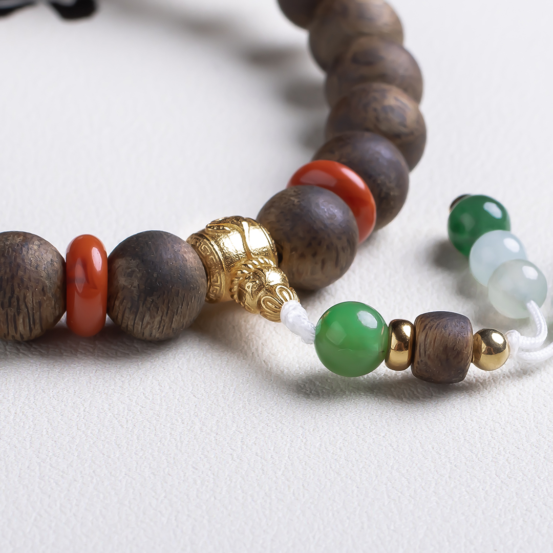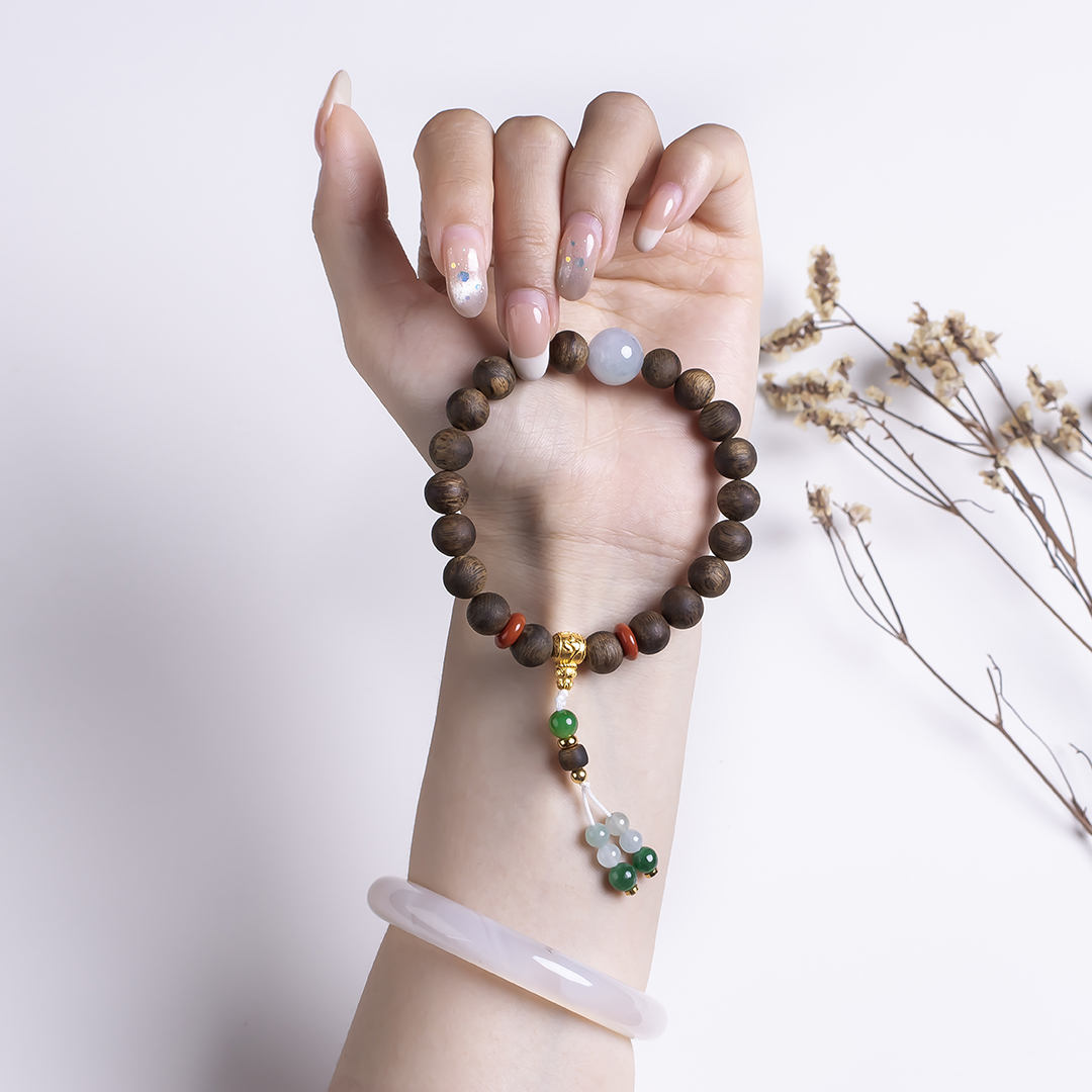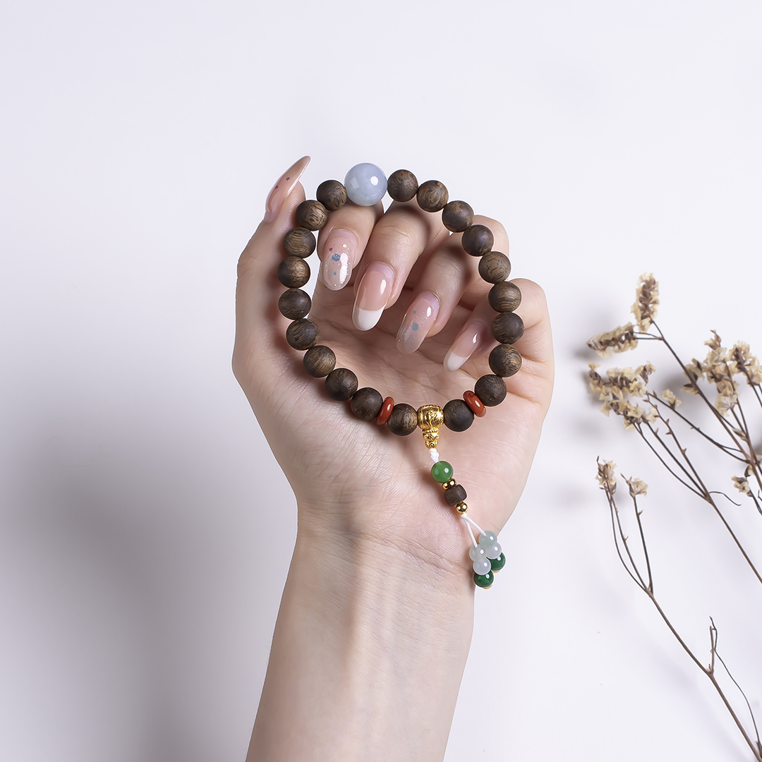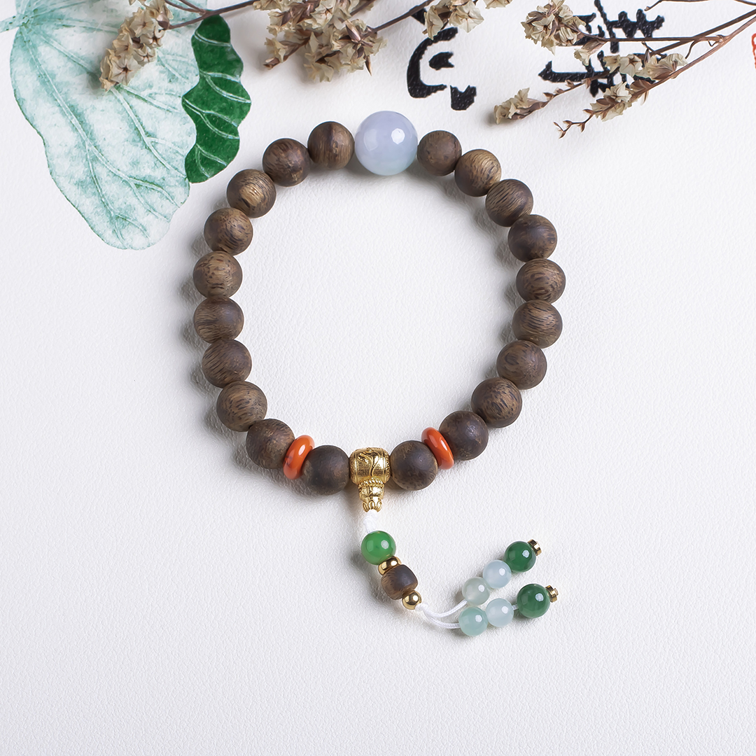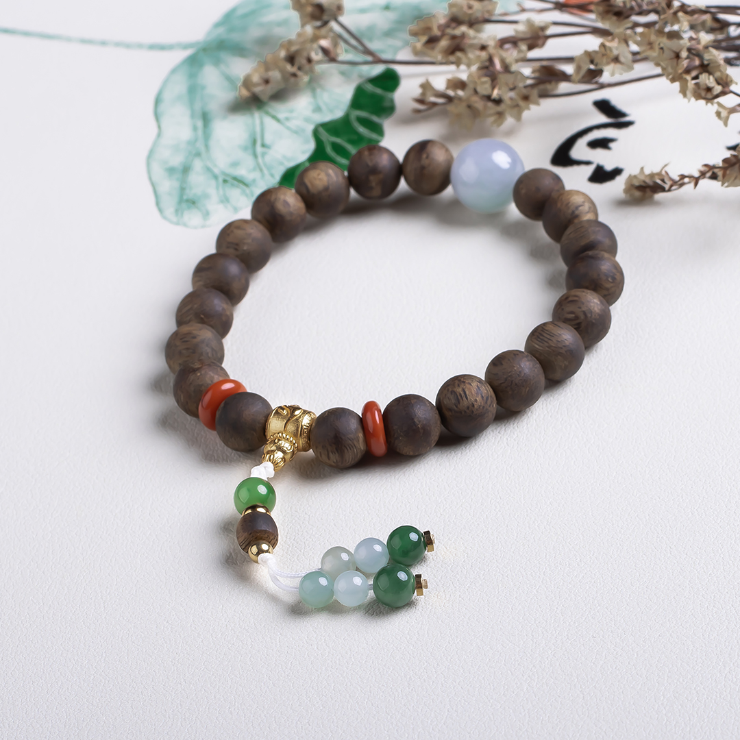 xy0514沉香+翡翠南红手持手串.银,天然沉香约9mm,原色原味,香味自然清甜,一颗糯冰底翡翠大圆珠,搭南红碧玉,国风设计流苏款式,手持手串两用,国潮时尚穿搭。