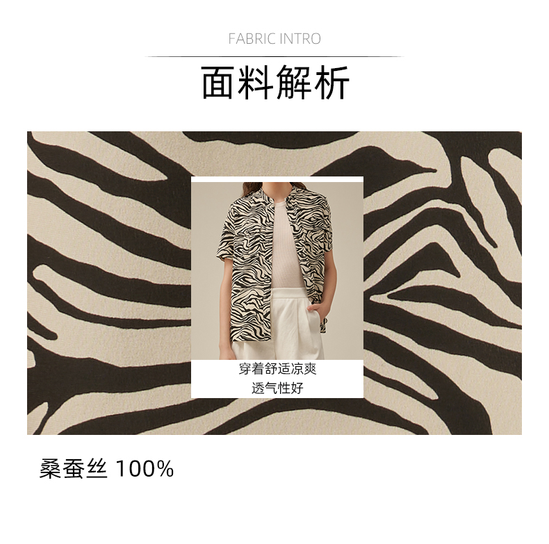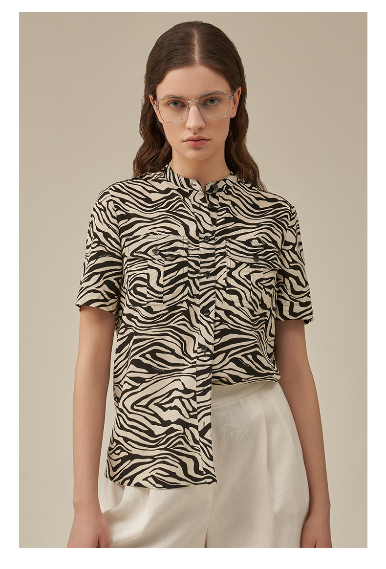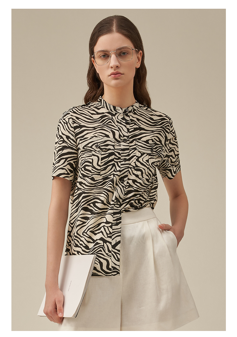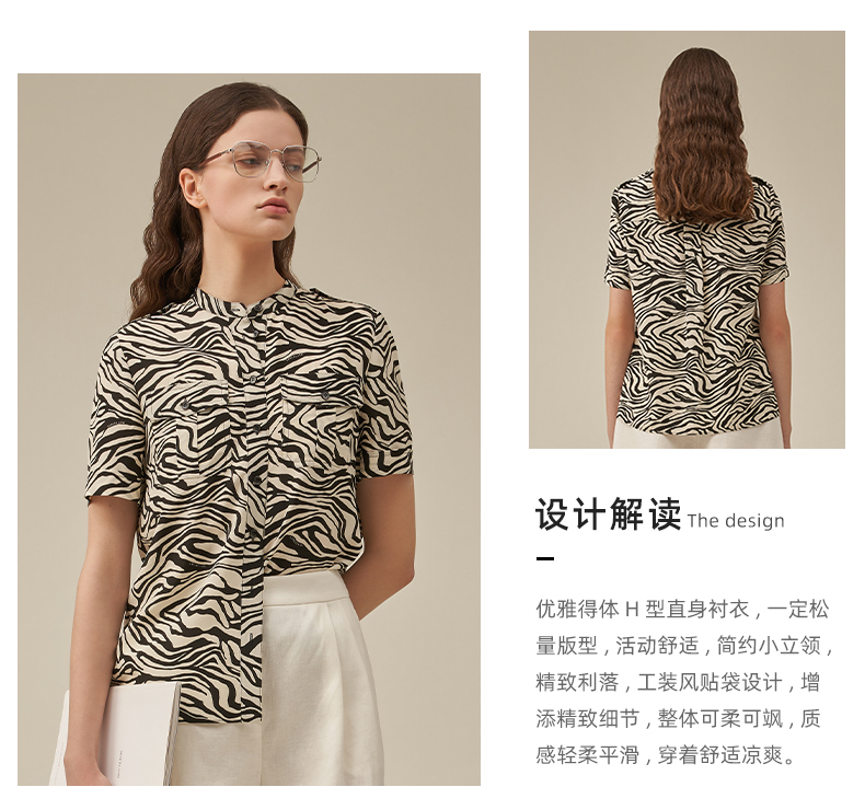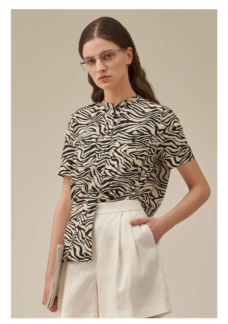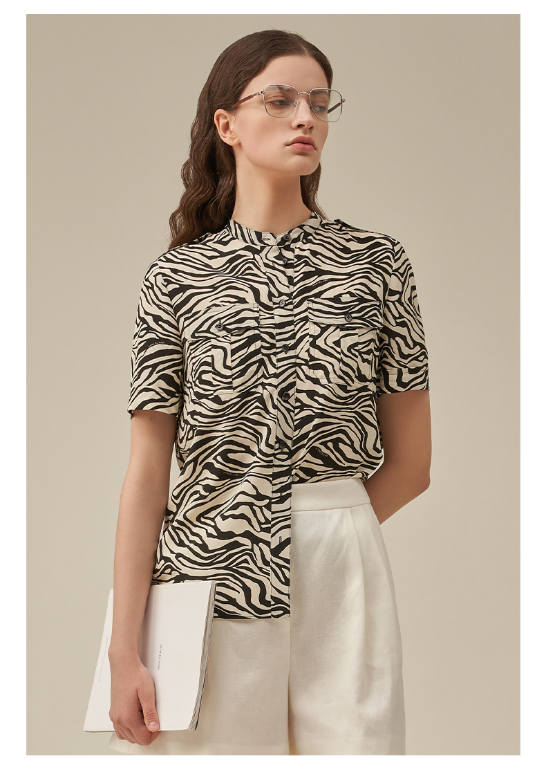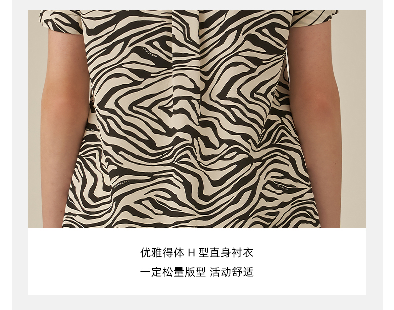 【2F】SANCELAND三石一澜23春双绉真丝衬衣短袖黑白印花衬衫SH11101082