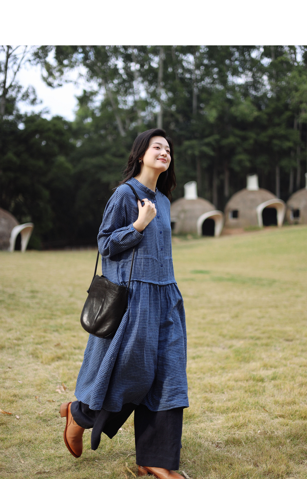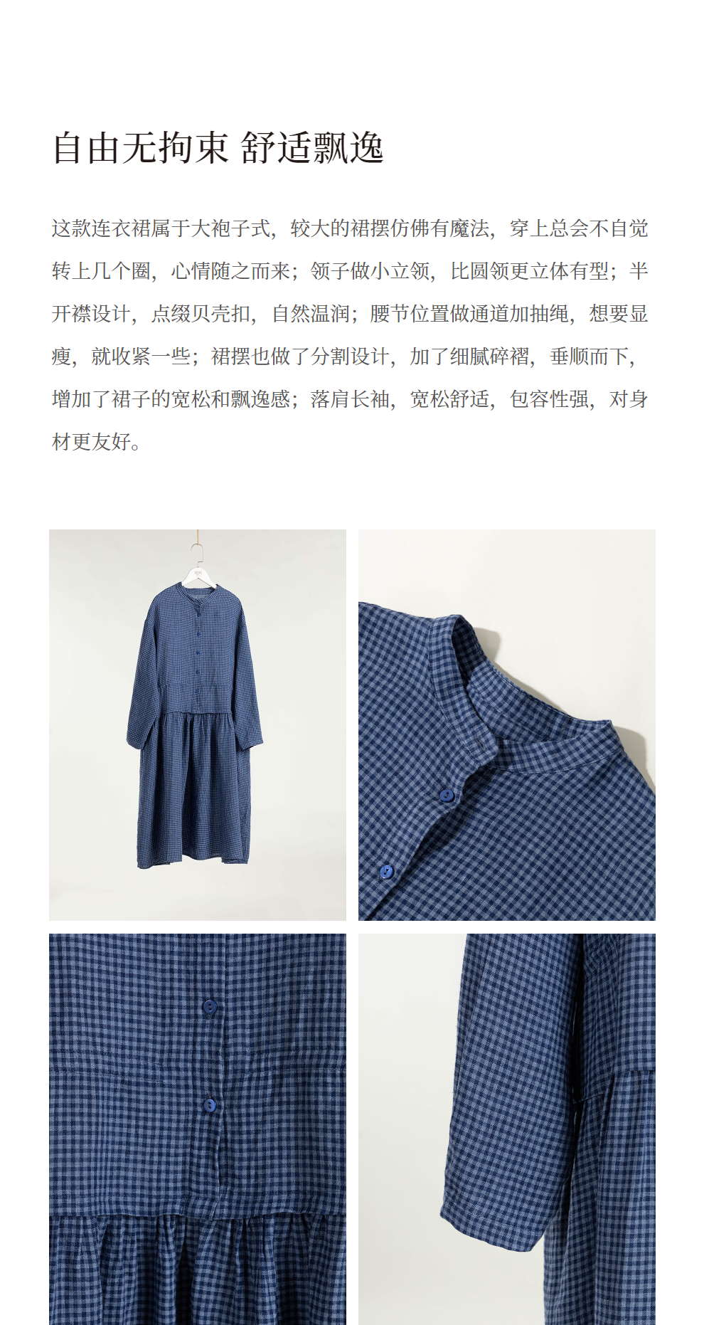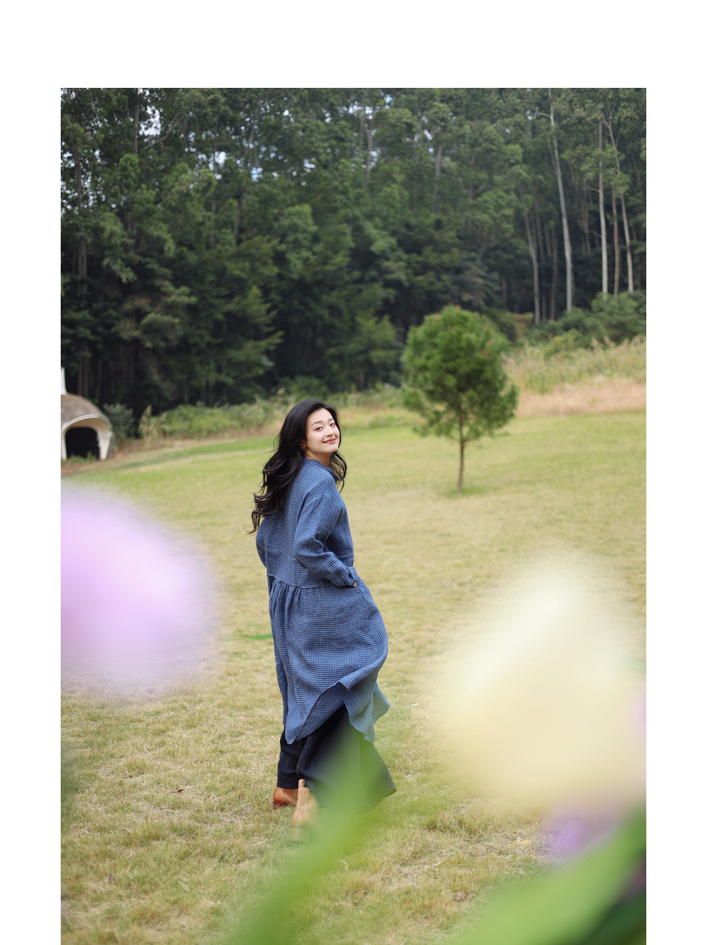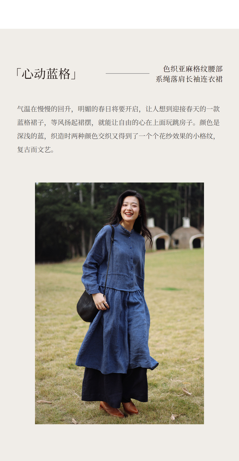 绽放065朵/2024早春新款天然色织亚麻格子腰间系绳旅游穿搭连衣裙