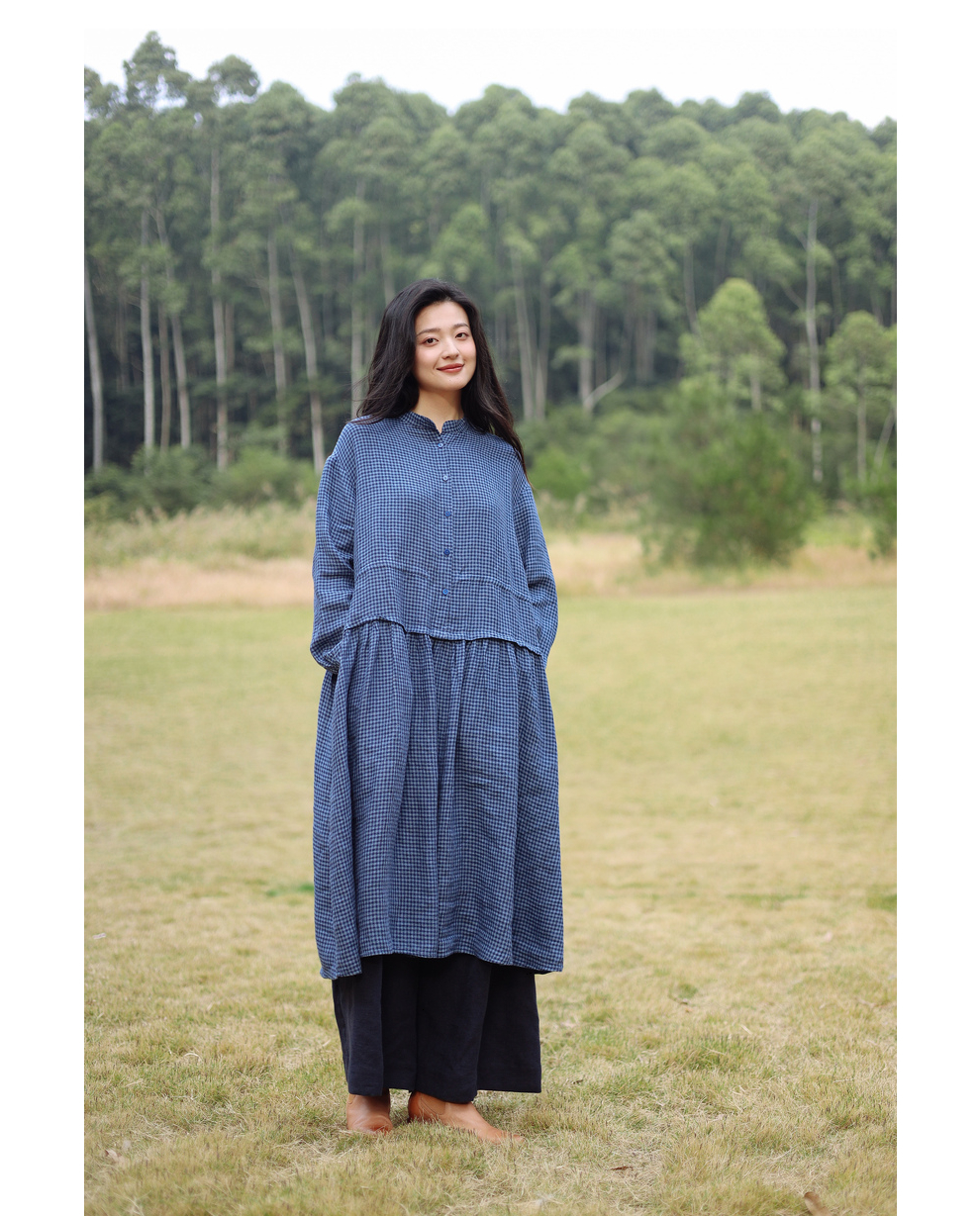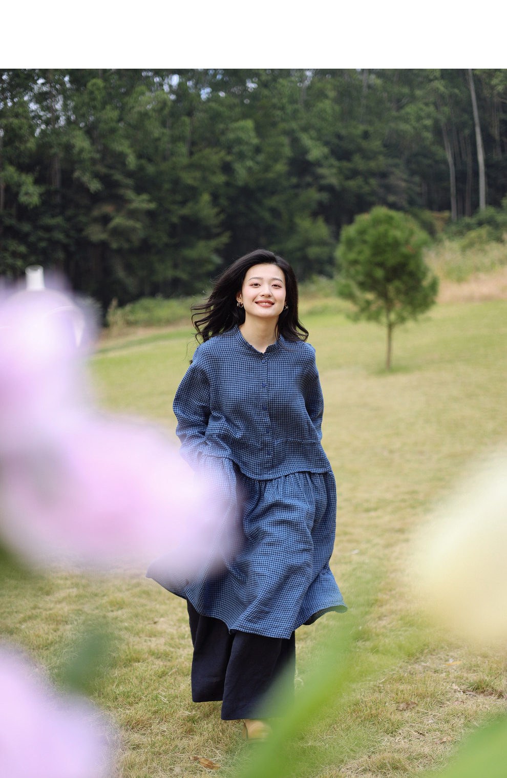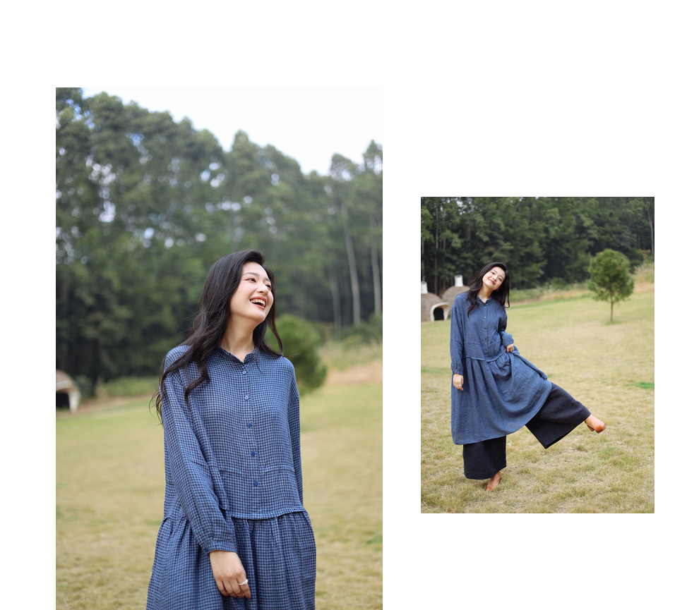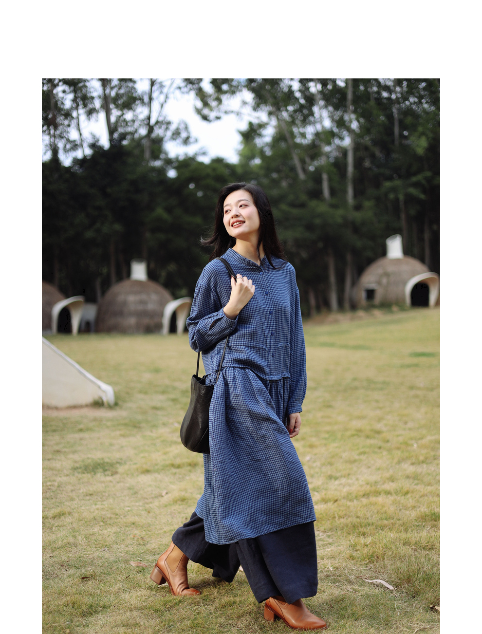 绽放065朵/2024早春新款天然色织亚麻格子腰间系绳旅游穿搭连衣裙