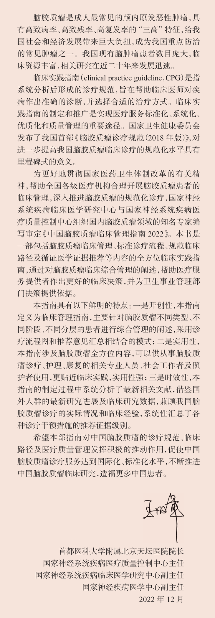 本指南受国家神经系统疾病临床医学研究中心与国家神经系统疾病医疗质量控制中心委托,以国家卫生健康委员会颁布的《脑胶质瘤诊疗规范(2018年版)》与《脑胶质瘤诊疗指南(2022 年版)》为框架,以国内外脑胶质瘤领域各类指南与共识为依据,围绕各级各类脑胶质瘤单病种综合管理横向展开,并以临床管理、流程图、临床路径、循证医学证据与临床新药试验等核心环节纵向延伸,旨在帮助医疗服务提供者作出更好的临床决策,并为卫生事业管理部门提供决策依据。指南制定过程中,特设立指南学术委员会与编写委员会,邀请中国医师协会脑胶质瘤专业委员会与中国抗癌协会脑胶质瘤专业委员会资深专家、青年骨干学者共同参与编写,体现了集体智慧的结晶。本指南具有以下鲜明的特点:一是开创性,本指南定义为临床管理指南,主要针对脑胶质瘤不同类型、不同阶段、不同分层的患者进行综合管理的阐述,采用诊疗流程图和推荐意见汇总相结合的模式;二是实用性,本指南涉及脑胶质瘤全方位内容,可以供从事脑胶质瘤诊疗、护理、康复的相关专业人员、社会工作者及照护者使用,更贴近临床实践,实用性强;三是时效性,本指南的制定过程中系统分析了最新相关文献,借鉴国外人群的最新研究进展及临床研究数据,兼顾我国脑胶质瘤诊疗的实际情况和临床经验,系统性汇总了各种诊疗干预措施的推荐证据级别。