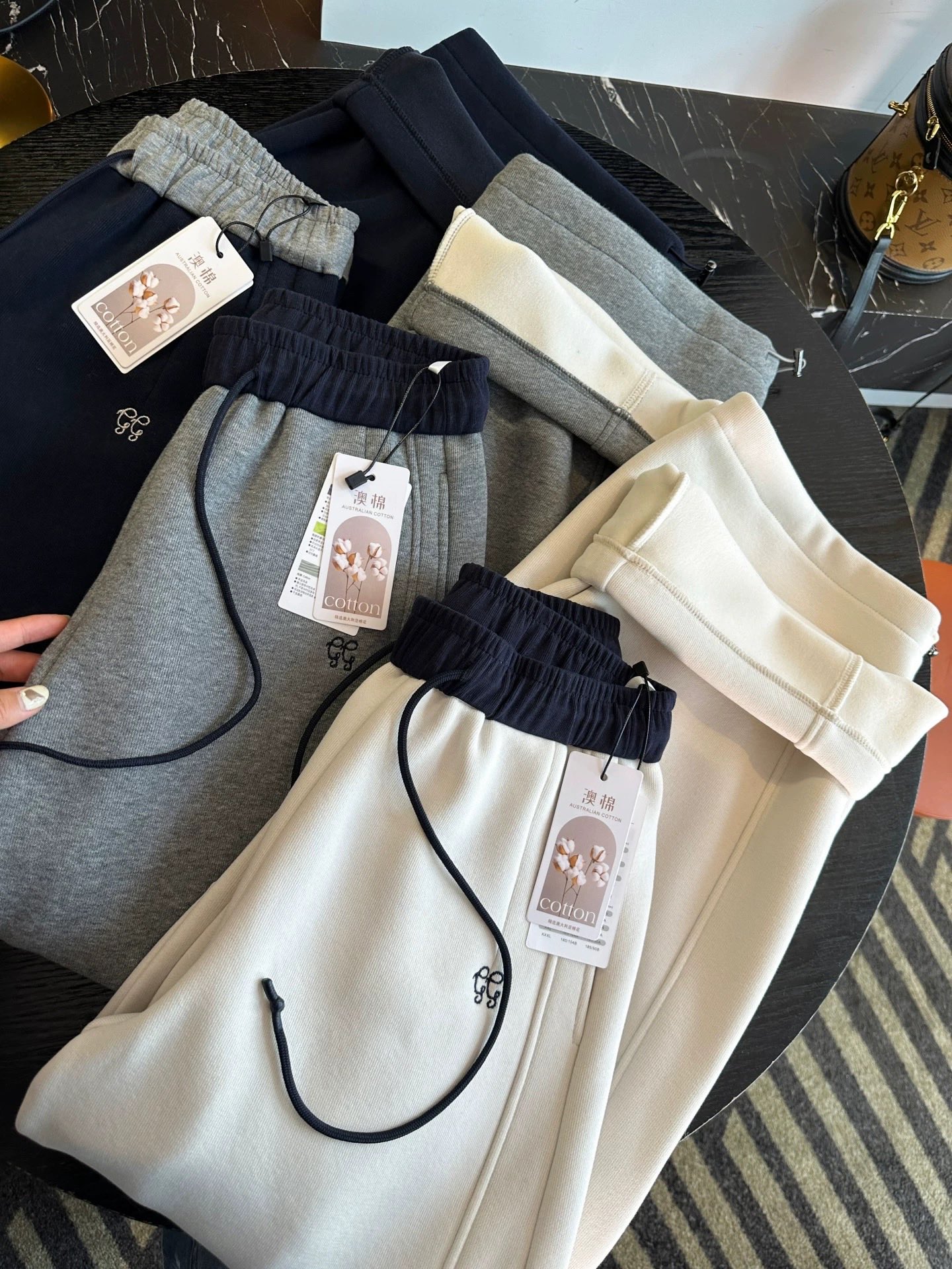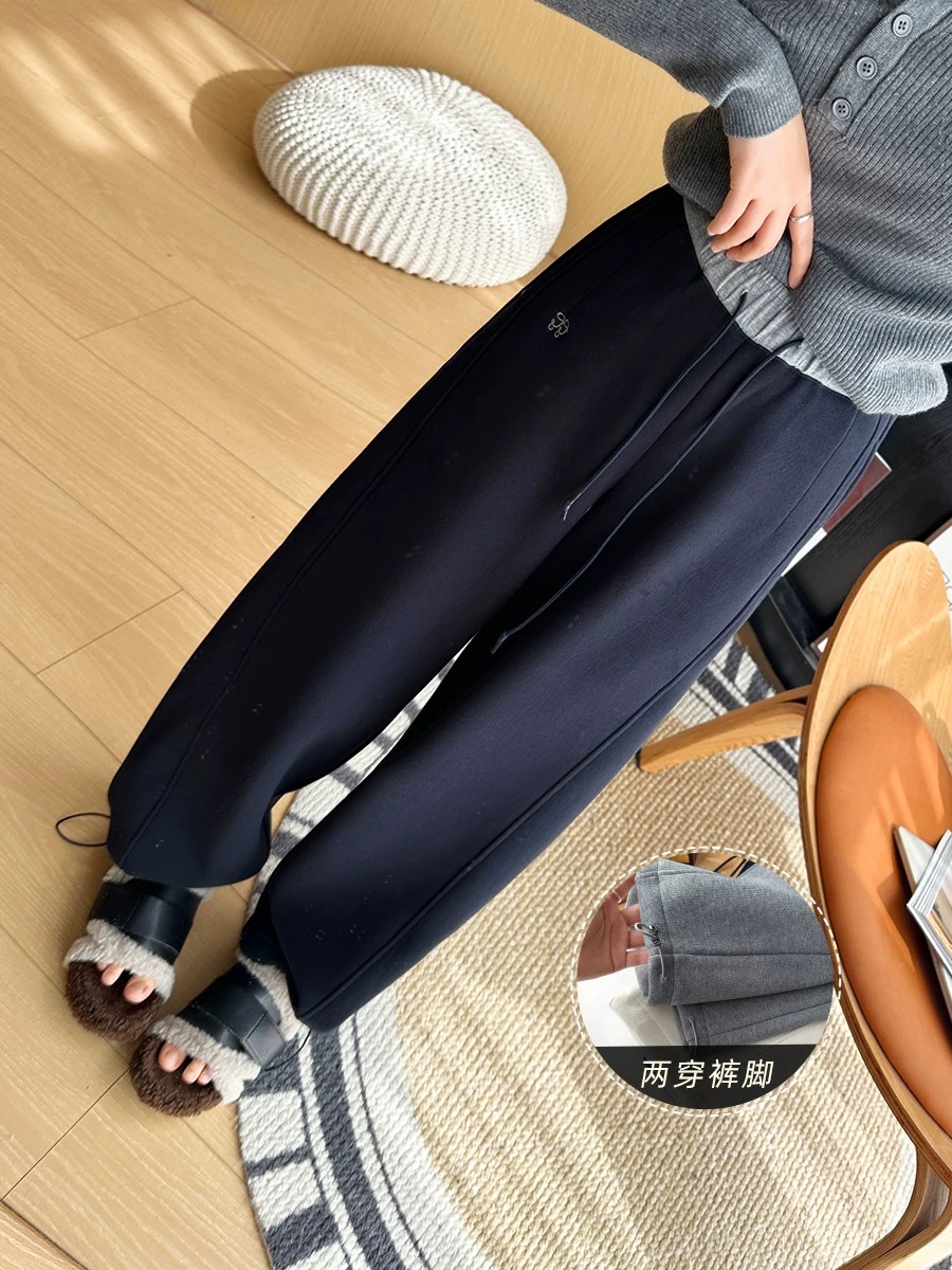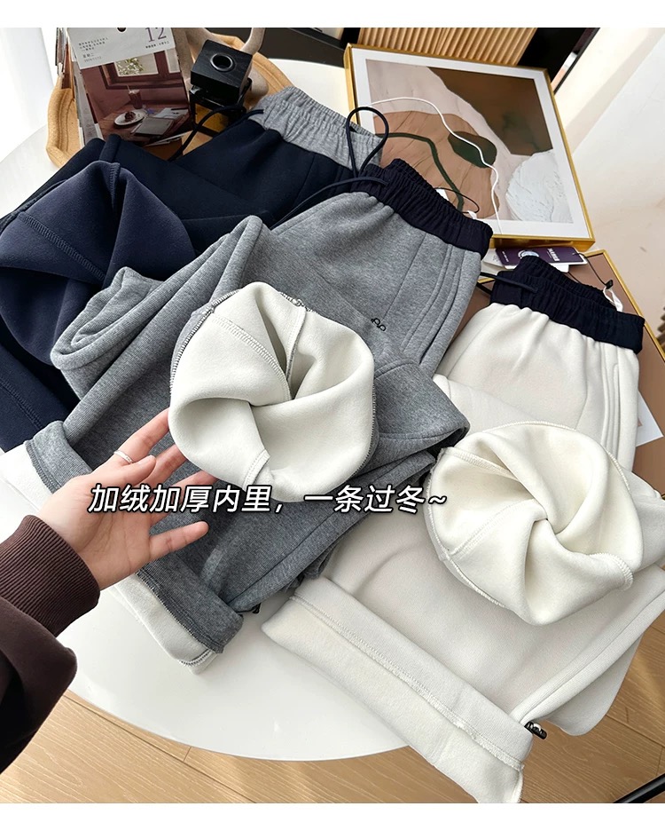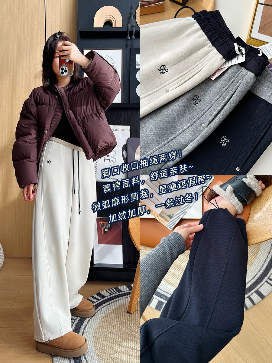 加绒裤过冬裤!秋冬季米白色显瘦加绒阔腿休闲裤女 软糯保暖加厚卫裤,推荐!脚口收口抽绳两穿!我真的疯狂打call~