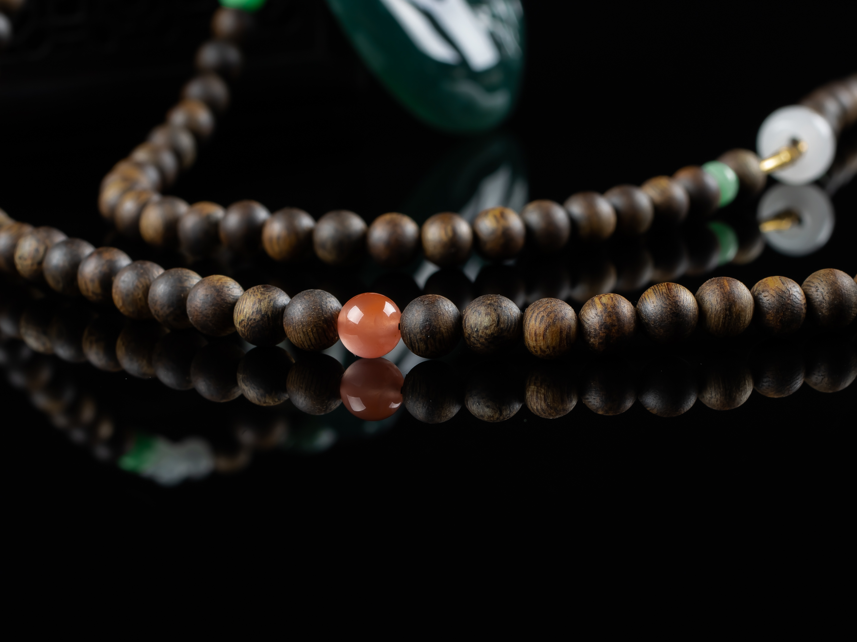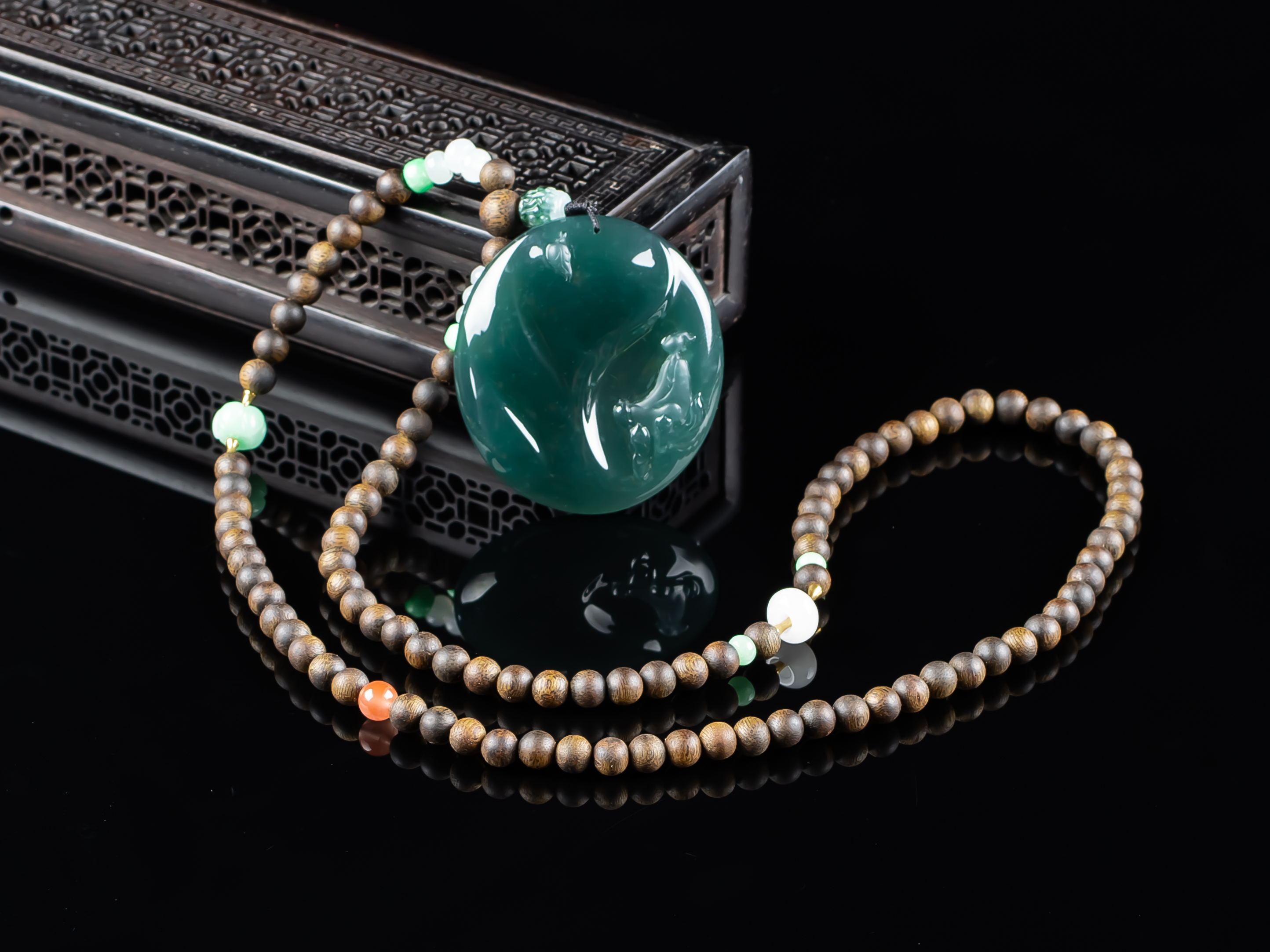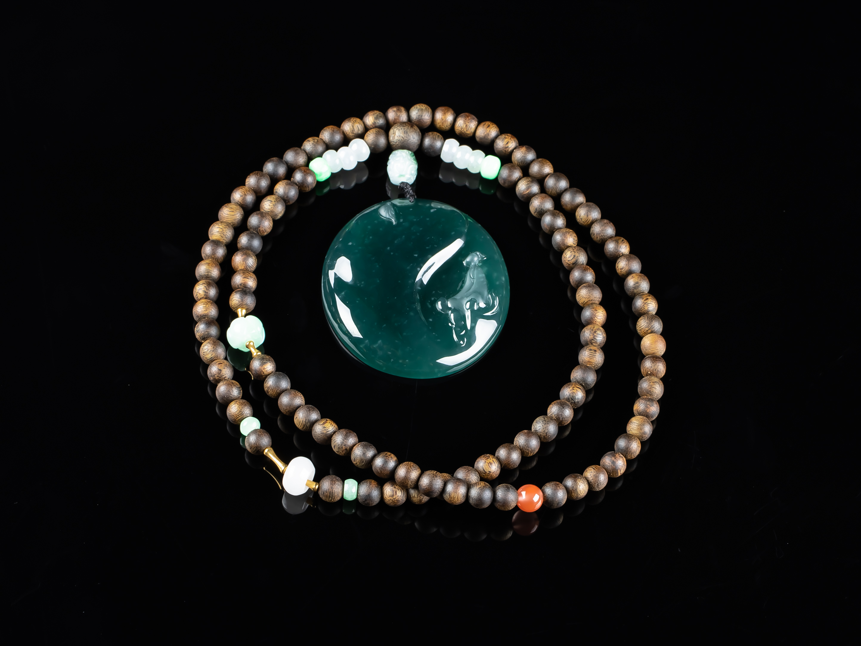 原创沉香翡翠悟道牌挂件,天然沉香6.3mm,原色原味,香气清甜舒凉。配件:翡翠、南红、18K金。天然蓝水翡翠牌子,上雕一佛陀静坐仰望上方一片叶子,几外流线型顺其自然,透光可见雪花棉,意境静谧幽远,一叶一菩提,款式更是精心采取不对称设计,感悟天地万物,得其智慧于心。牌子47.6*52.2*7.2mm