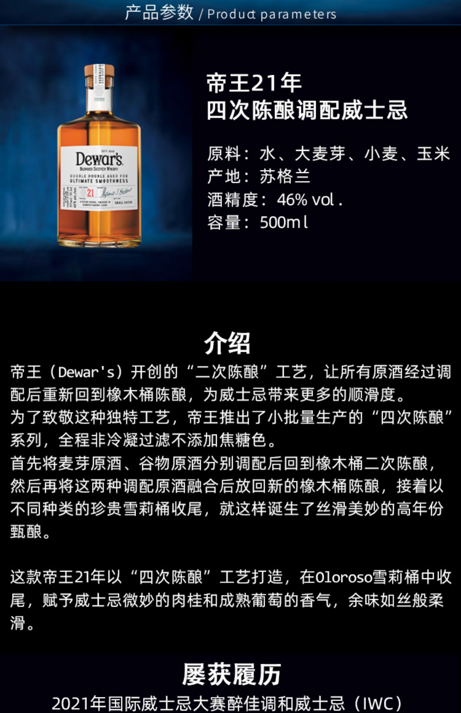 【行货】帝王21年 调配苏格兰威士忌 500ml 46%vol