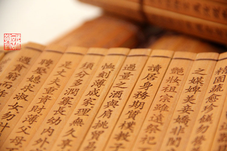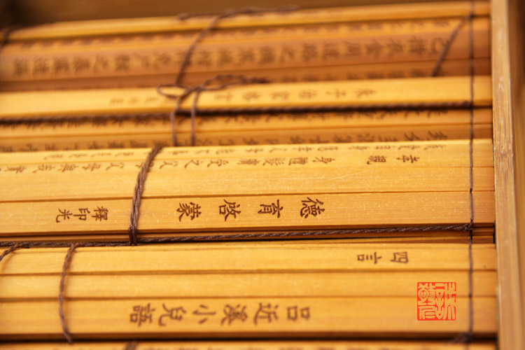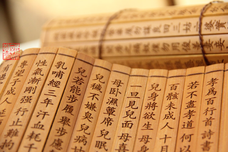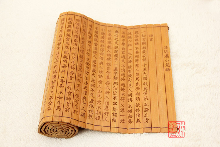 中华国学经典诵读简册 传承国学经典 卷一:德育启蒙(印光大师著) 卷二:劝孝歌、八反歌 卷三:朱子治家格言、朱子家训 卷四:吕近溪小儿语、吕新语好人歌 卷五:文昌帝君阴鸷文、劝敬惜字纸文 【竹简介绍】: 竹简多用竹片制成,每片写字一行,将一篇文章的所有竹片编联起来,称为“简牍”。这是我国古代最早的书籍形式,用于书写文字的木片称 木牍,多用于书写短文。