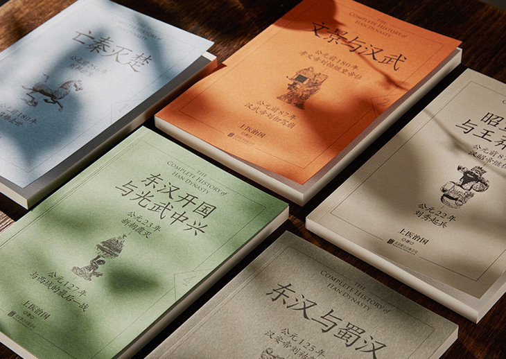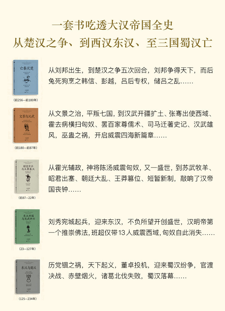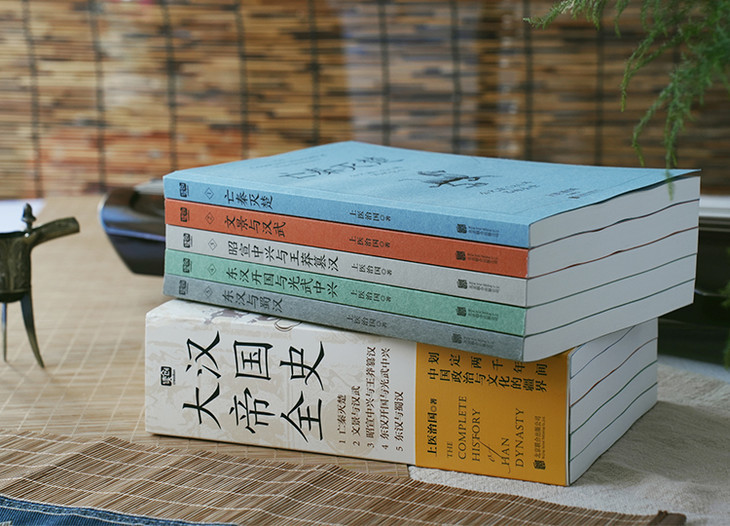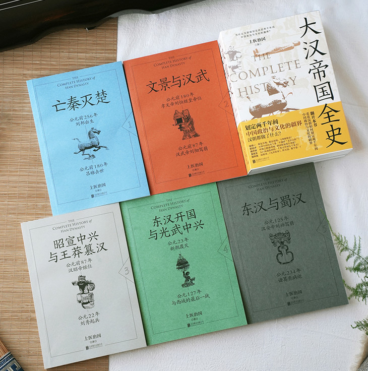 五本书五个颜色,表现汉朝由盛及衰的不同阶段。