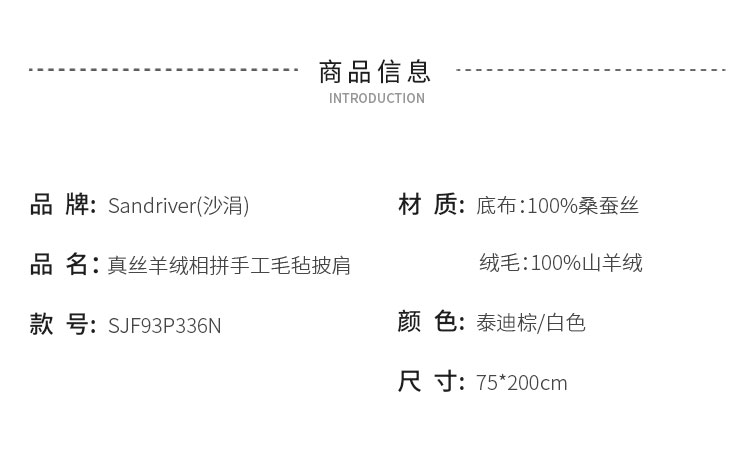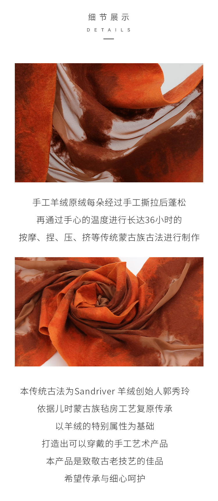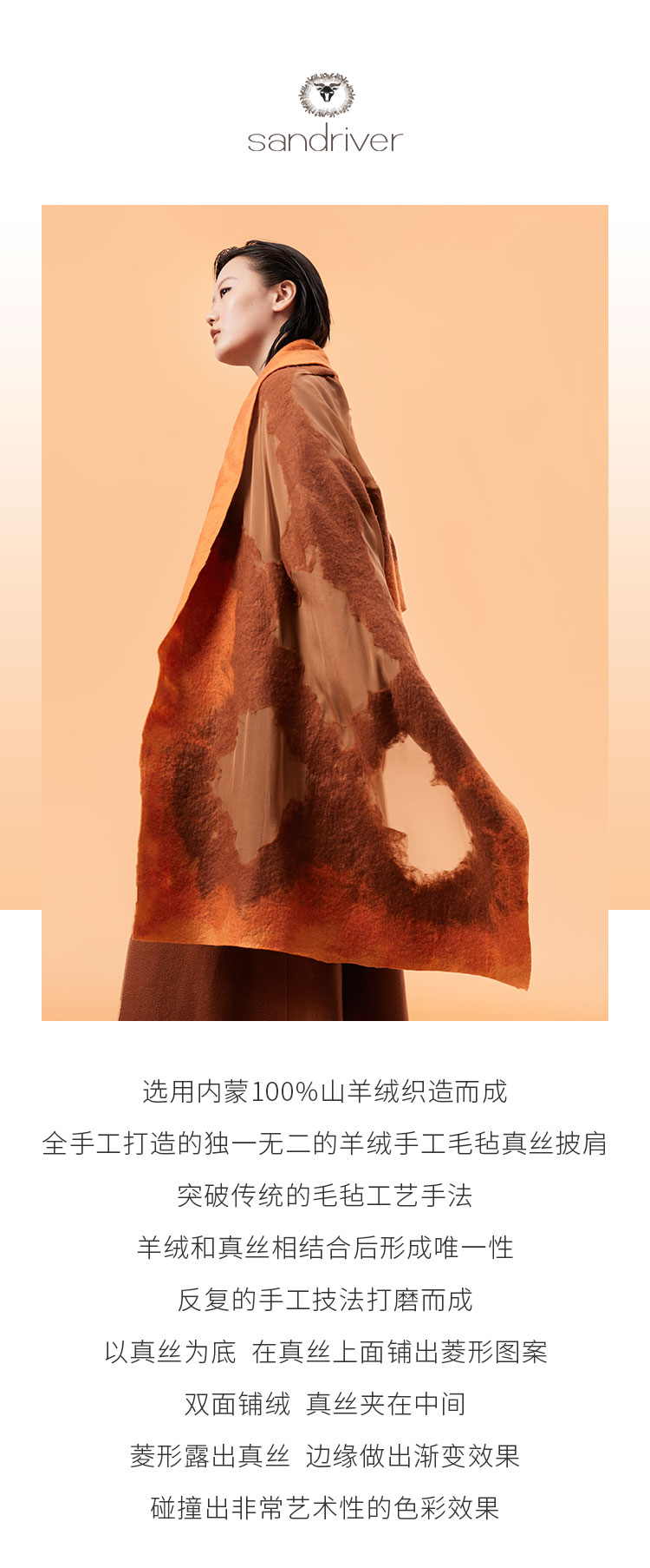 历年在巴黎时装周亮相,享誉世界的艺术羊绒品牌[Sandriver 沙涓]由羊绒布道者郭秀玲女士创立。阿拉善自有牧场纯种羔羊绒,日本国宝设计师小筱顺子,上海自有基地精工细作。承载羊绒情怀,坚持匠人品质。