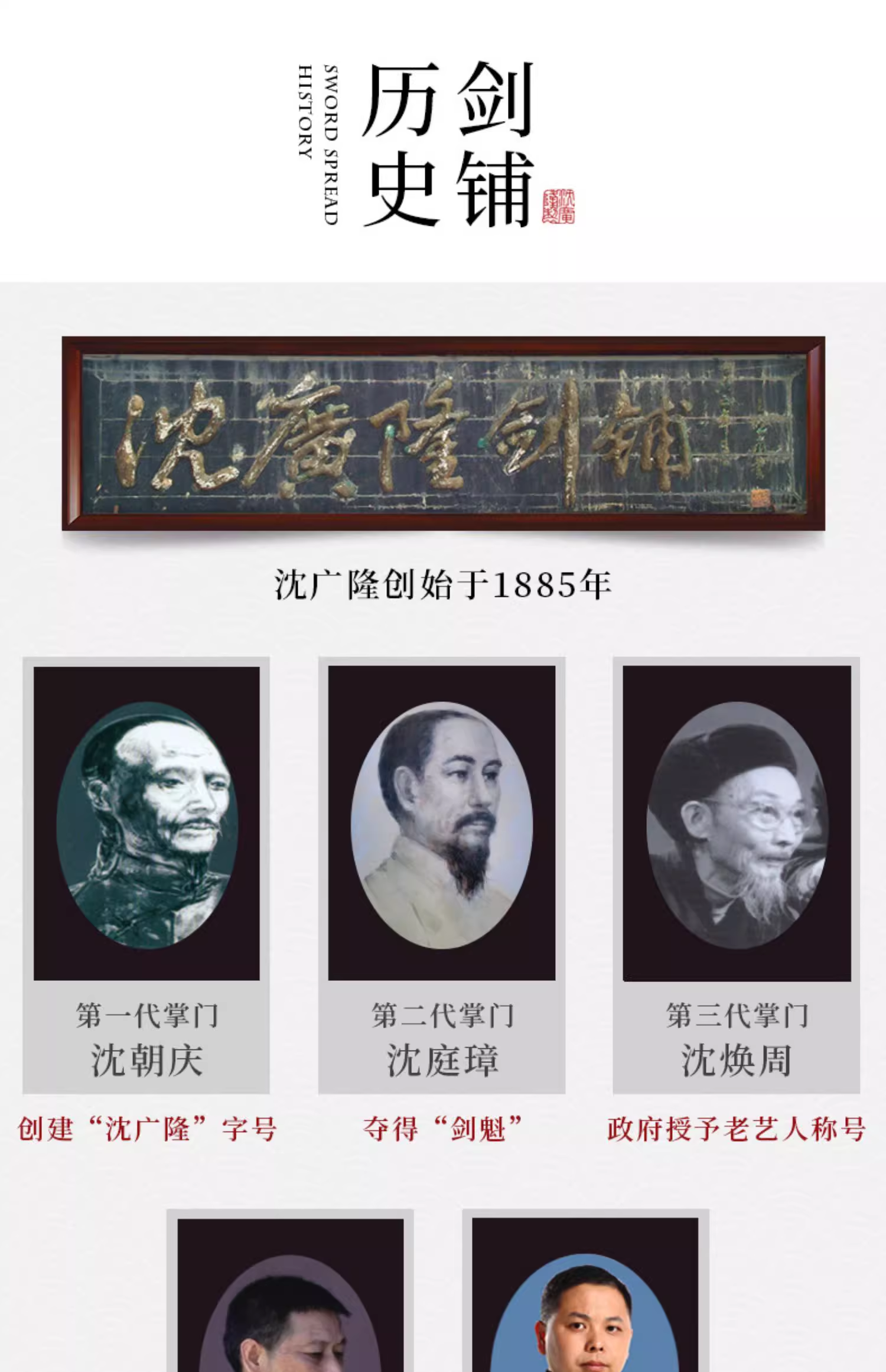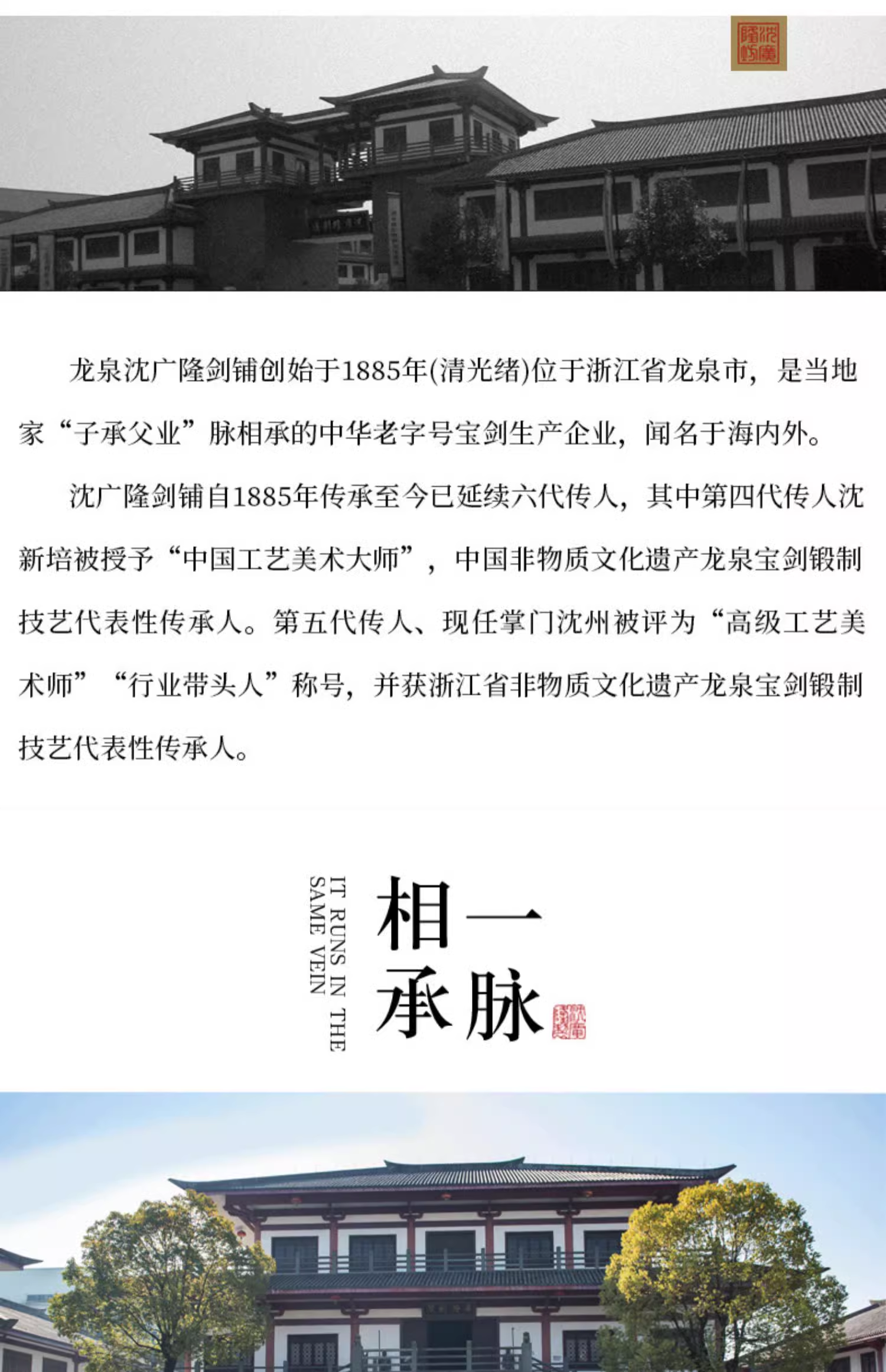 相传春秋末期,越国铸剑师欧冶子在龙泉秦溪山铸成龙渊、泰阿、工布三把名剑。并以龙渊为乡名。后因避唐高祖李渊讳,改称龙泉。唐乾元二年设龙泉县。从此,龙泉就成为剑的宝名,誉满天下。沈广隆剑铺位于浙江省龙泉市