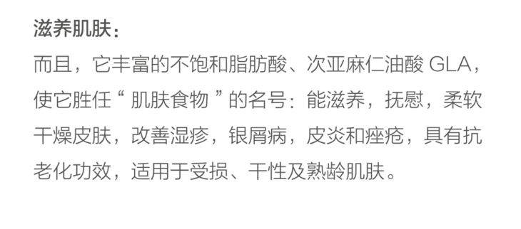 同时,黑种草籽油的不饱和脂肪酸含量异常丰富,含有约50-60%的亚油酸及次亚麻仁油酸(GLA),并富含谷甾醇、15种氨基酸、生物碱及多种维生素,被称为“肌肤食物”。它能滋养及抚慰柔软干燥的皮肤,改shan湿疹、银屑病、皮炎和痤疮。正确且规律的使用对提高肌肤整体状况,增加皮肤细密和柔软度有很好的帮助。