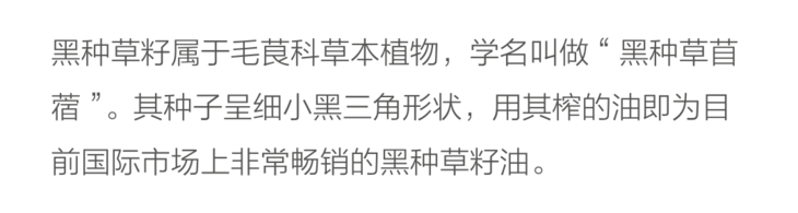 除此之外,黑种草籽油还含有许多有益的成分,包括氨基酸、脂肪酸、粗纤维和矿物质(包括钾、钠、铁、钙)等。因此对消化、免疫、呼吸,以及肝胆胰肾方面都有比较正向的影响。同时,还具有补肾健脑、通经、通乳、利尿的作用。