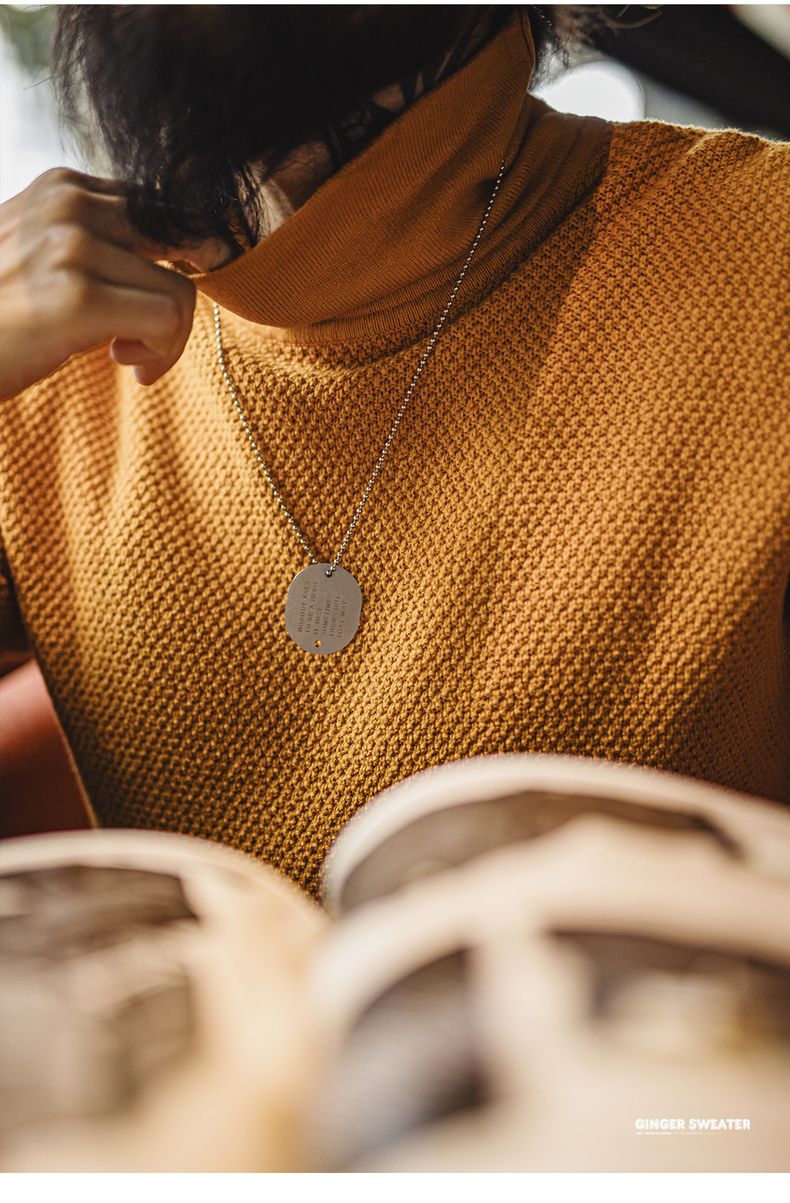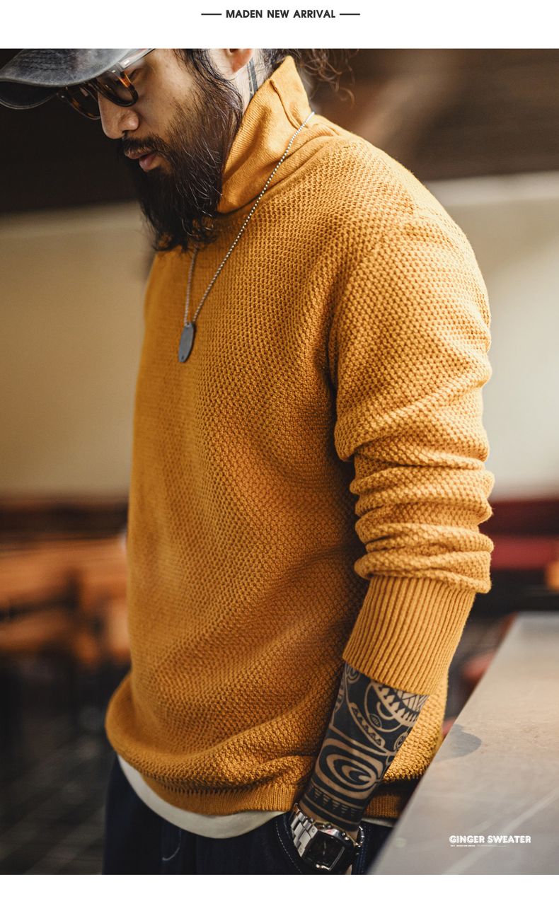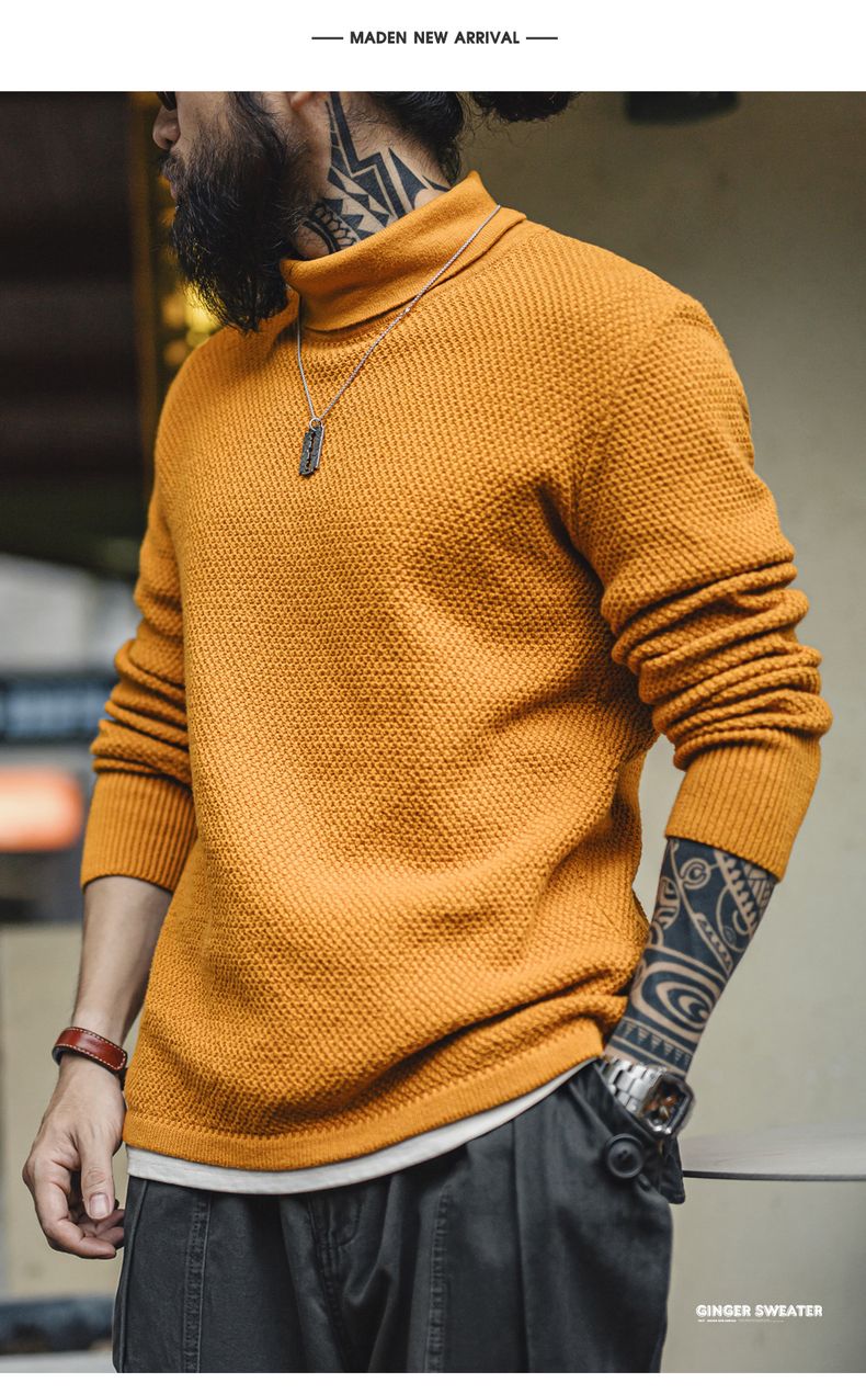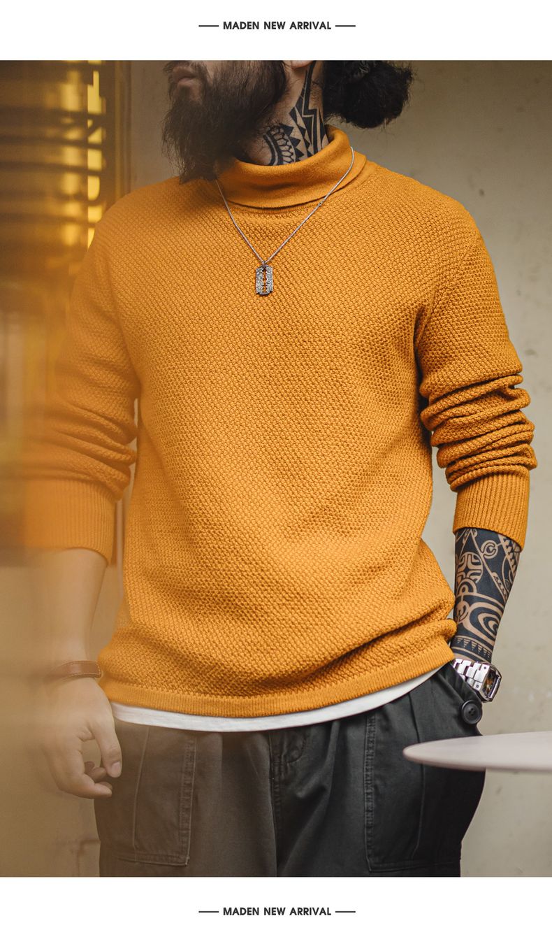 工装优选美式复古半高领菠萝纹毛衣黄色打底套头内搭针织衫男秋冬