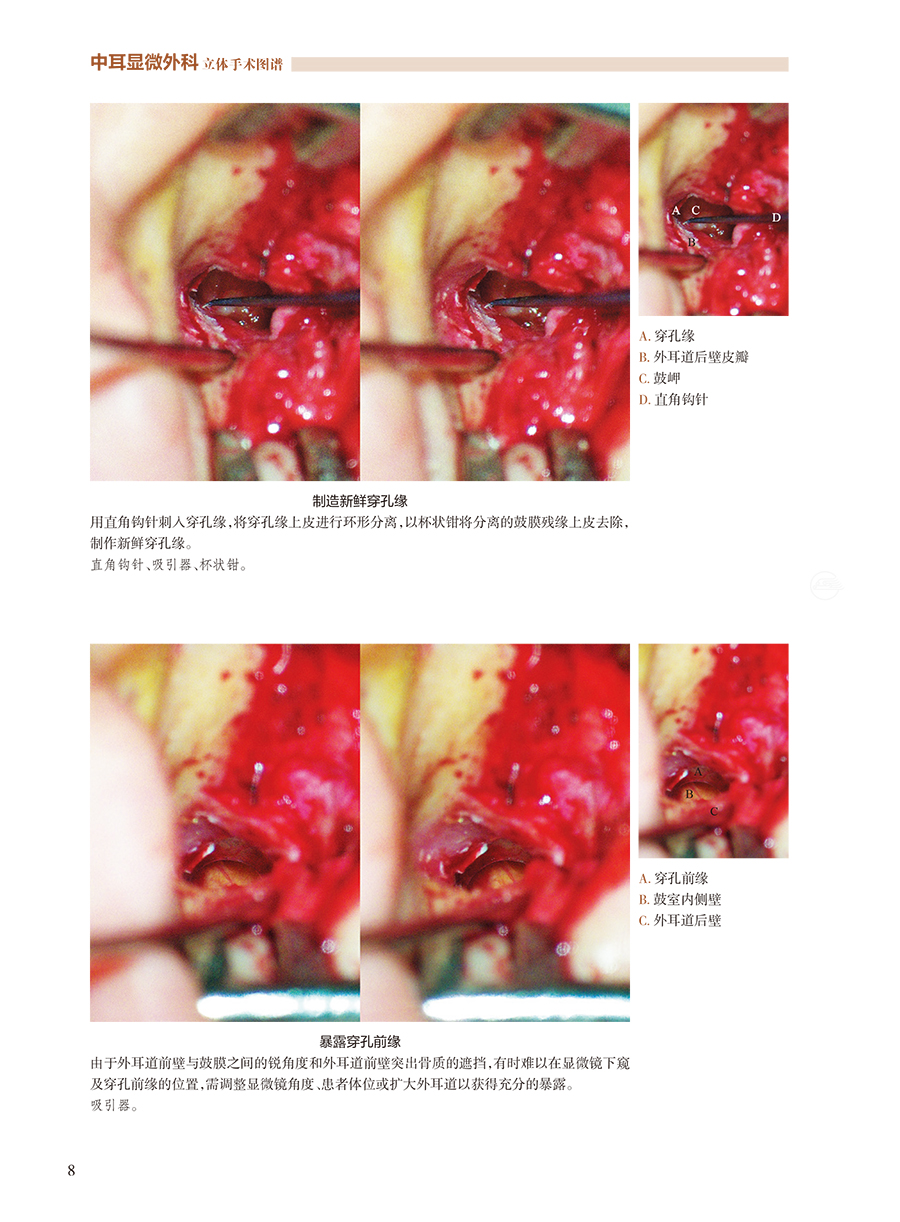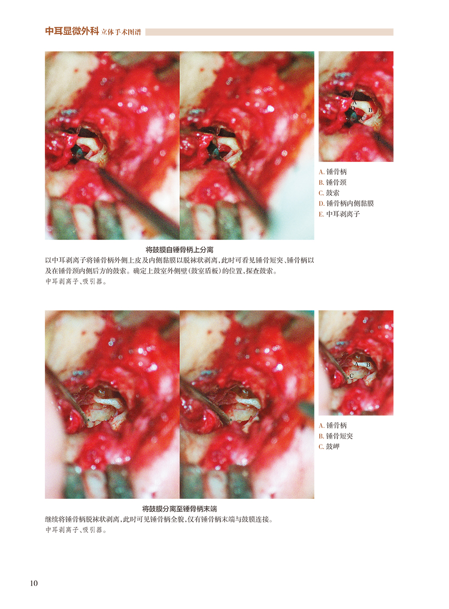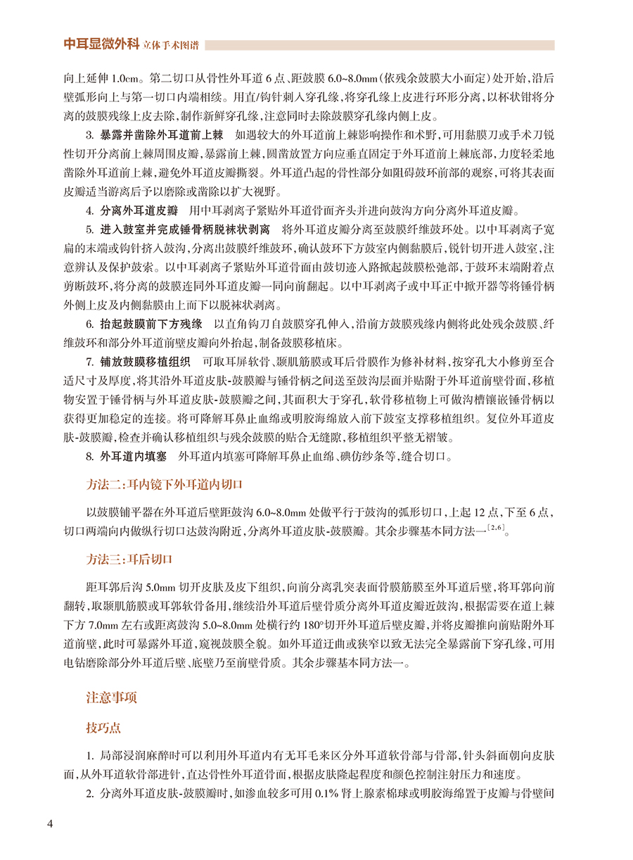 本书选择照相的手术都是解放军总医院耳外科的经典病例、由著名耳外科专家主刀。本书术式涵盖了中耳乳突常见病的显微外科手术(各型鼓室成型、乳突手术)、眩晕外科(内淋巴囊减压、半规管填塞)、镫骨外科(足板开窗)、面神经外科(面神经减压、面神经肿瘤切除神经移植)、人工耳蜗植入等。立体照片使狭窄的手术视野变得明亮、清晰、层次分明。手术照相采用拥有自主知识产权的4K3D屏前手术系统,获得极为清晰、完全立体效果的彩色图片近800张。通过附书的可折叠双眼立体镜,读者可以获得与耳科主刀术者完全一样的立体视觉效果,配合详尽的图注和文字说明,此书将成为耳科医生学习、教学的重要工具。