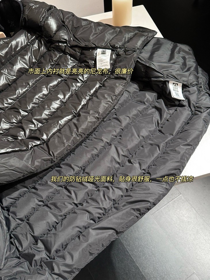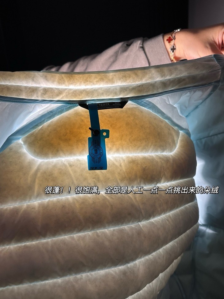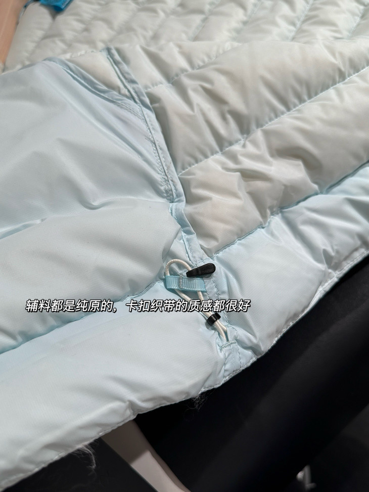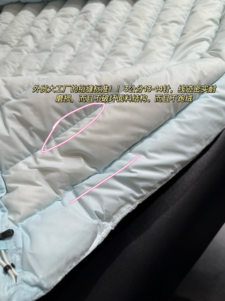 内里510T超高密度结合防绒轧光工艺所以根本不必担心跑绒!!!这种充绒量真的和良心了,全都是大朵绒,顶好顶好的