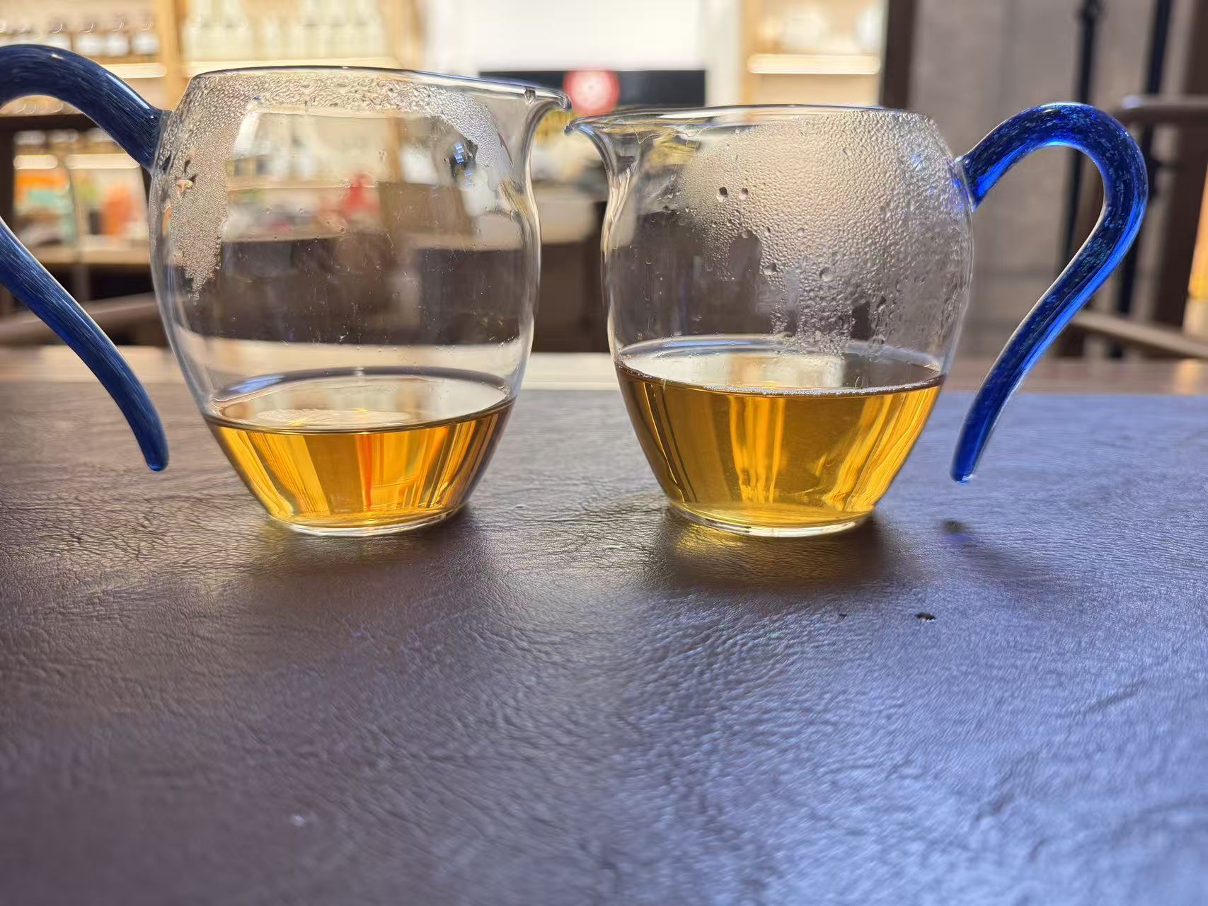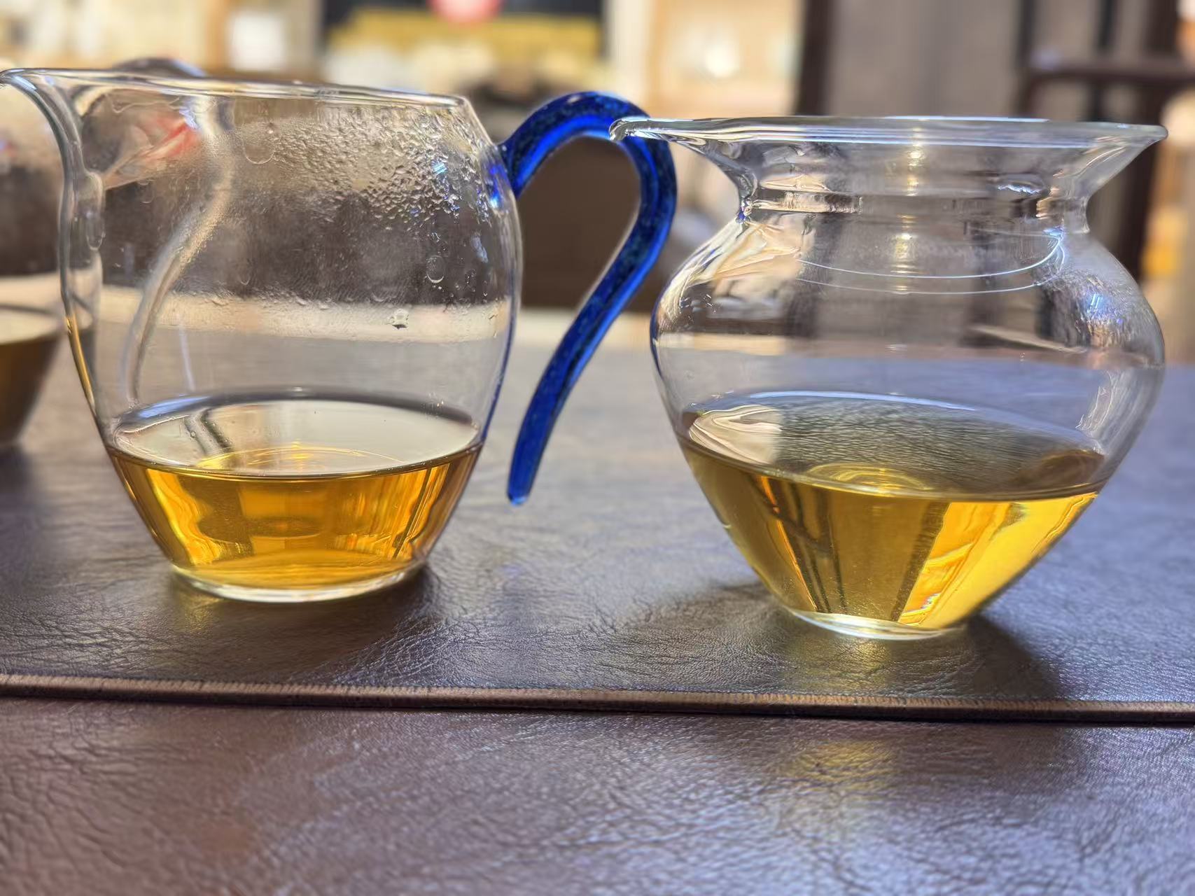 大家看,上面是3、4道的汤色,第四道稍微金黄了一些,这就是三道审评法的高明之处,在第四道的时候已经发生了变化,汤色颜色变浅了一点点,但是茶味还特别好,底韵也还很足。