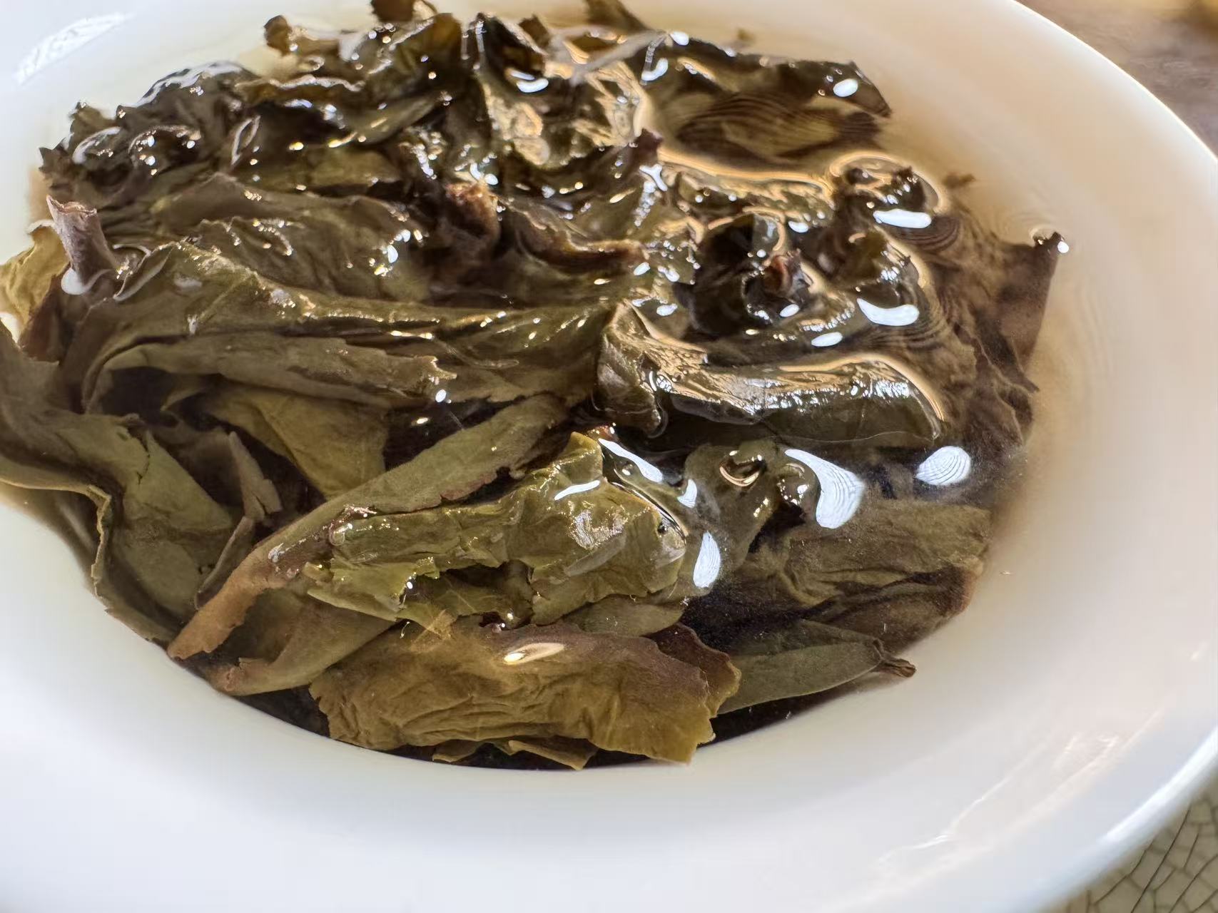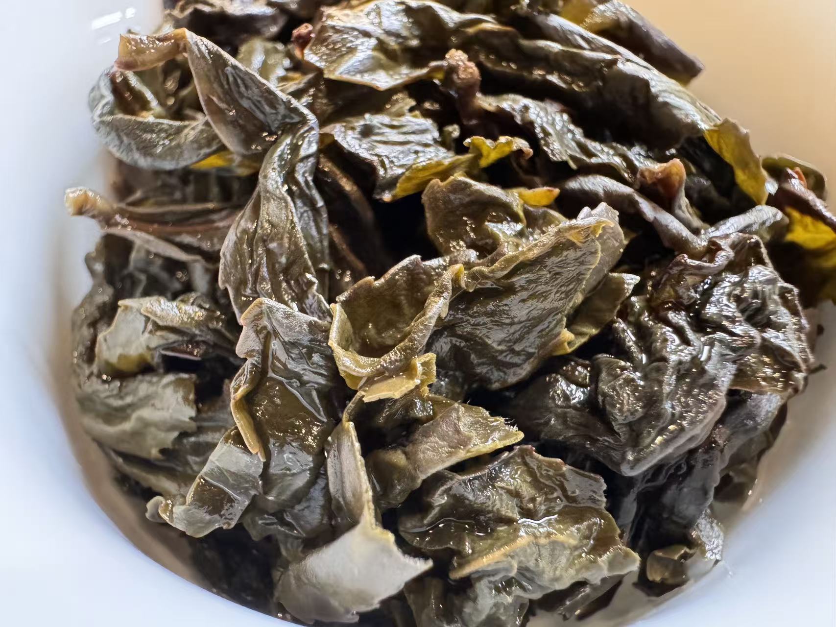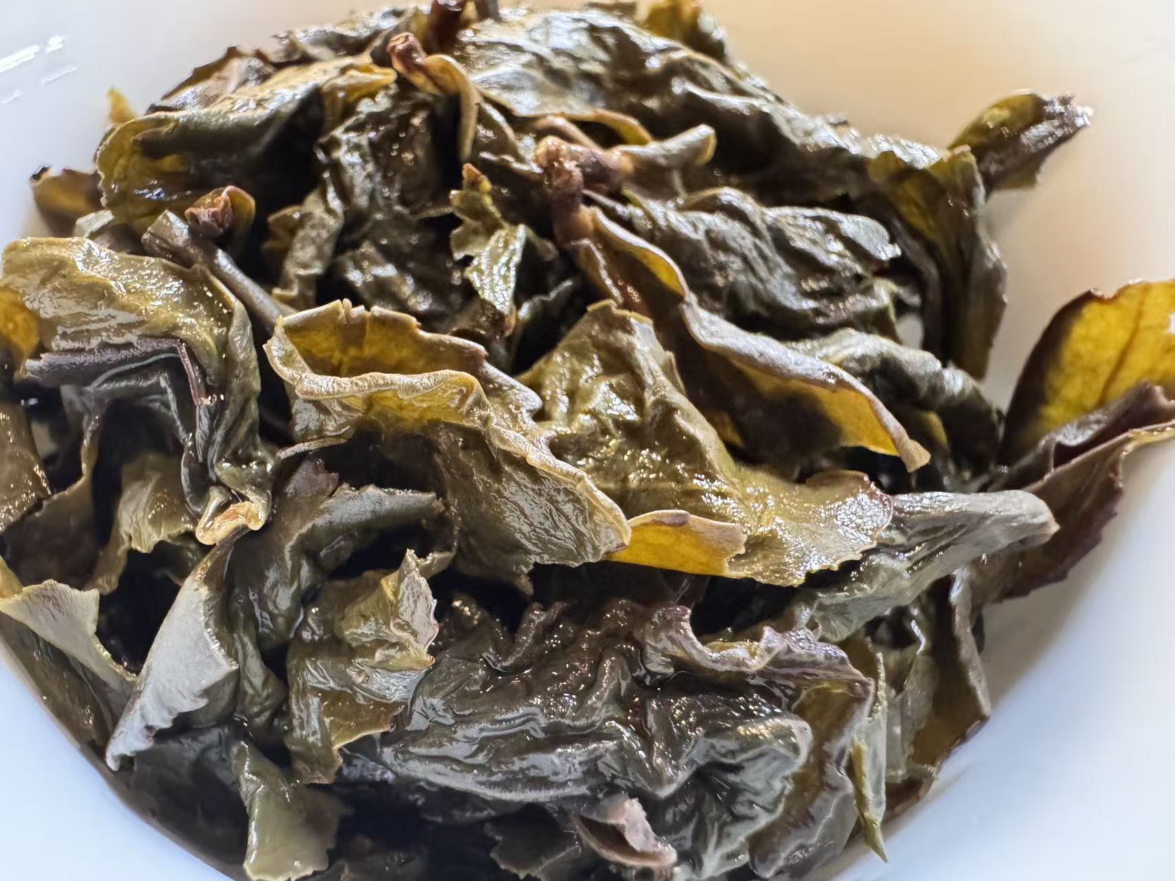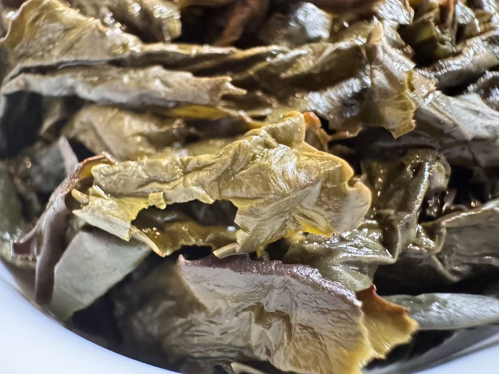 第三道闷泡5分钟出汤后的叶底,木耳感很足,叶底复活后,活性很好且有杏黄感,这就是走水好,发酵通透的表现。
