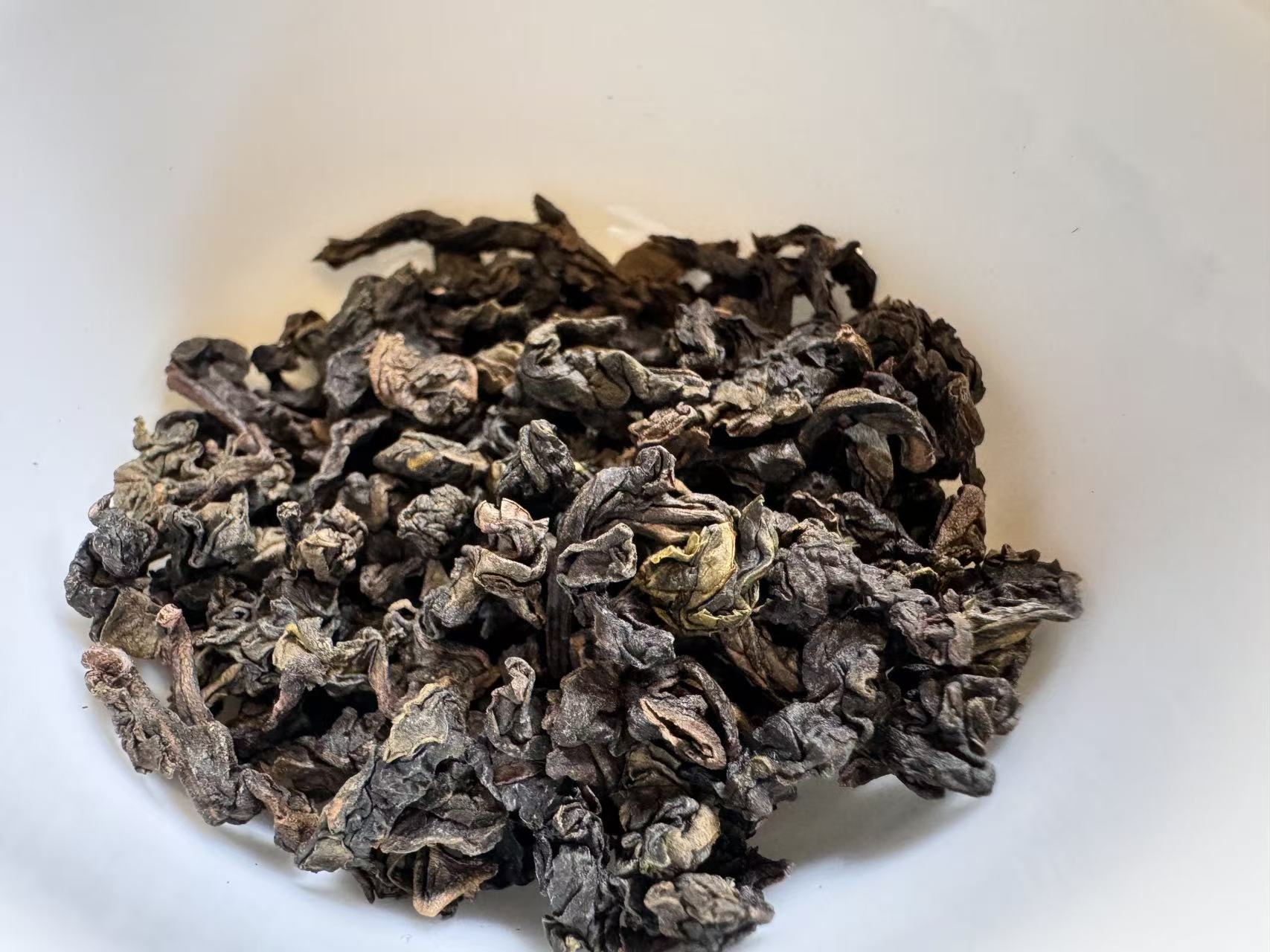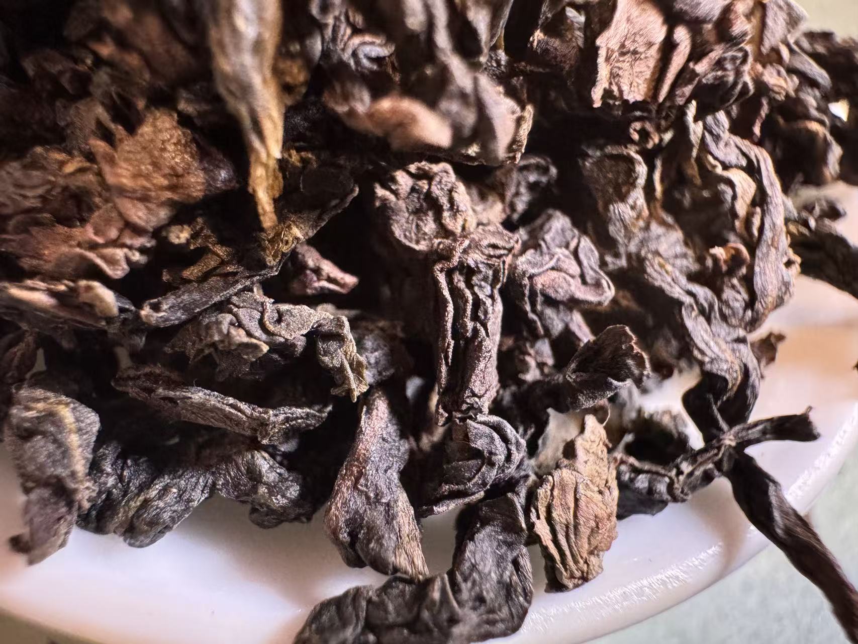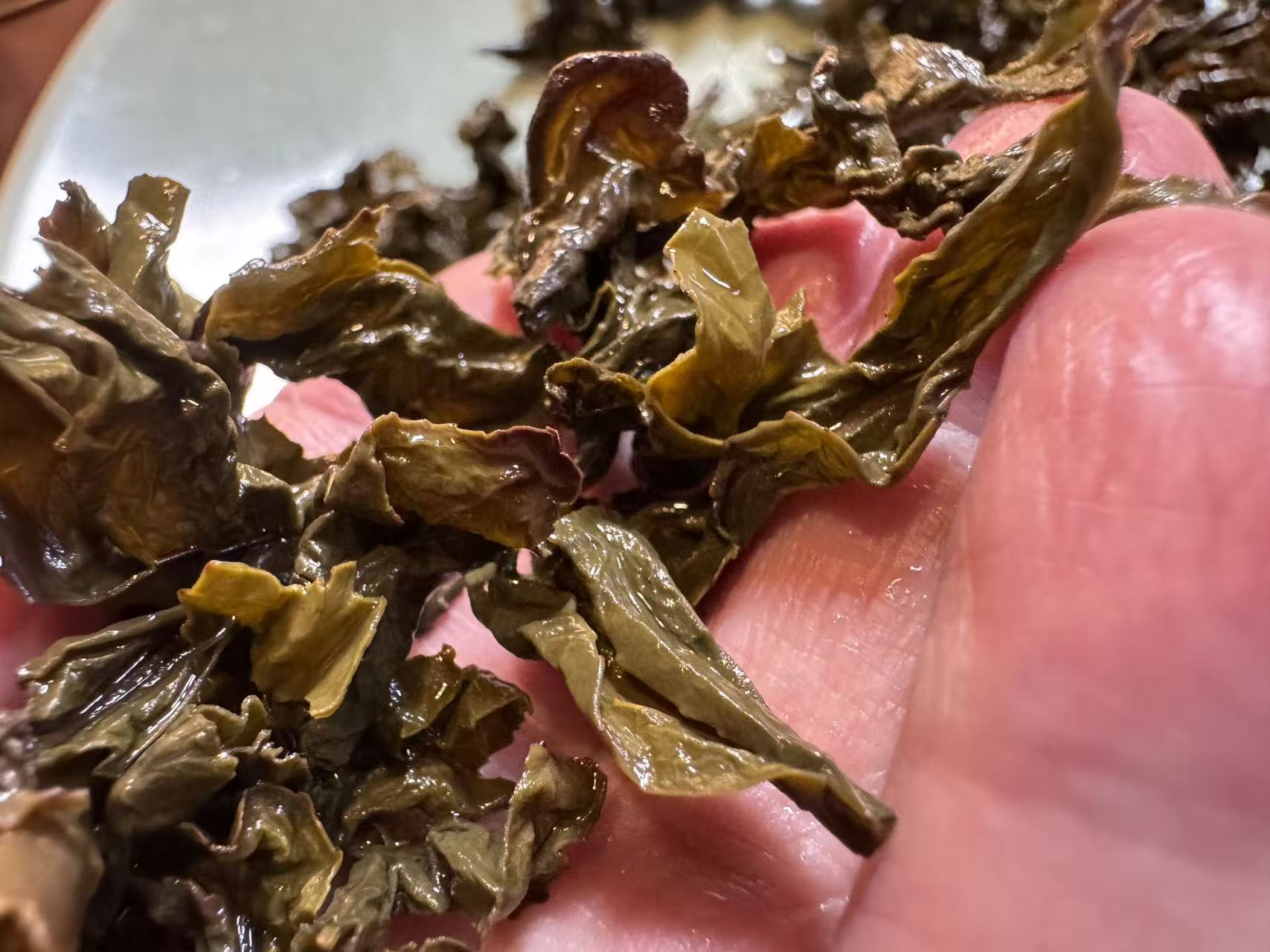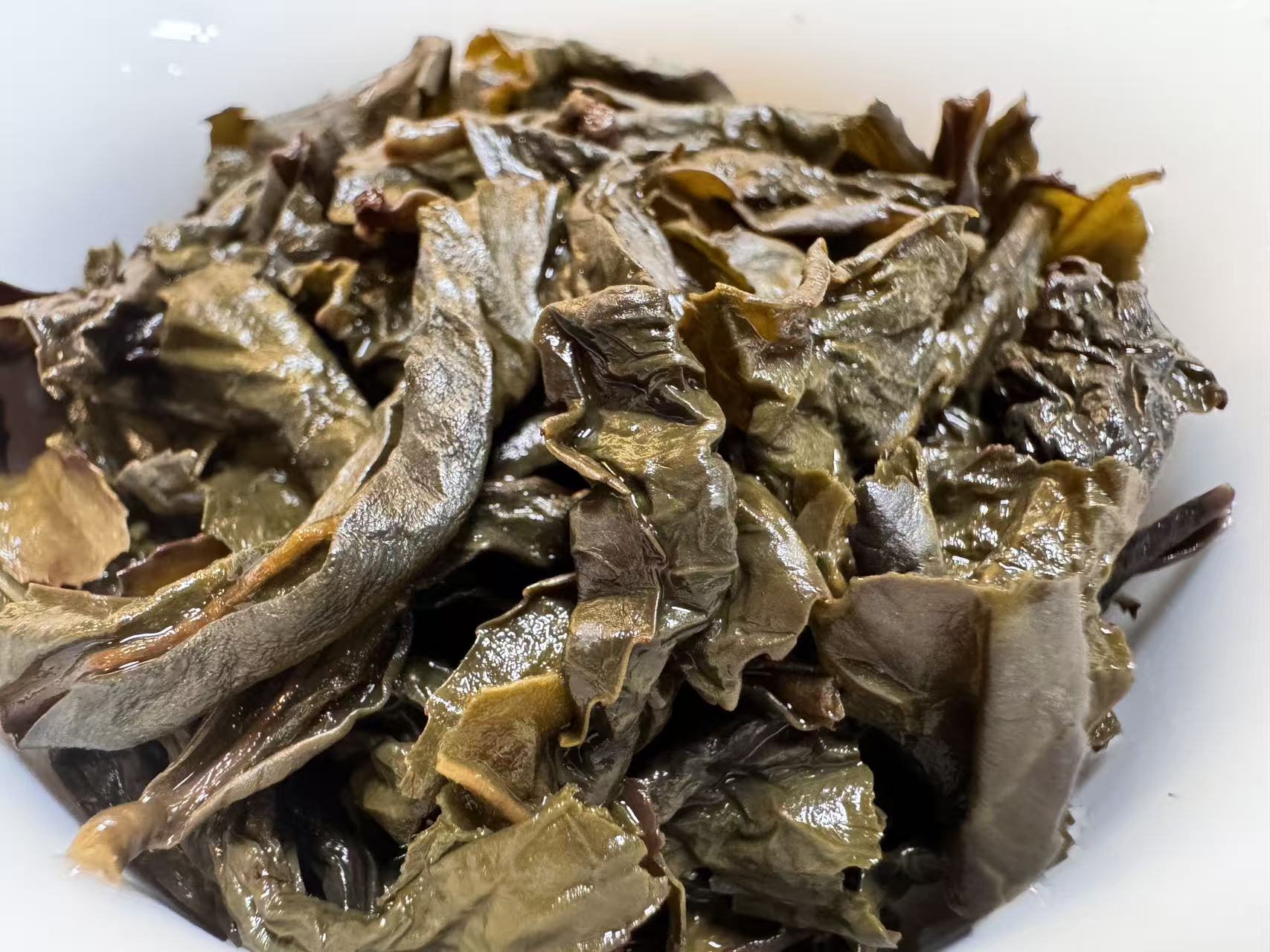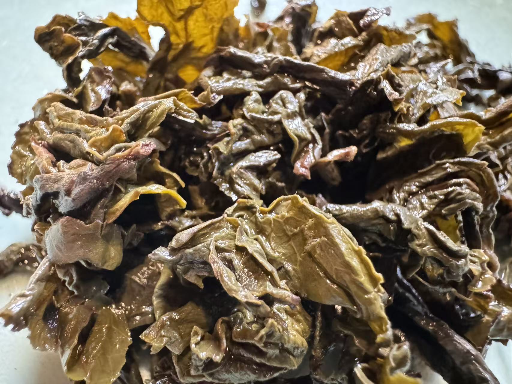 第三道闷泡5分钟出汤后的叶底,木耳感很足,叶底复活后,活性很好且有杏黄感,这就是走水好,发酵通透的表现。
