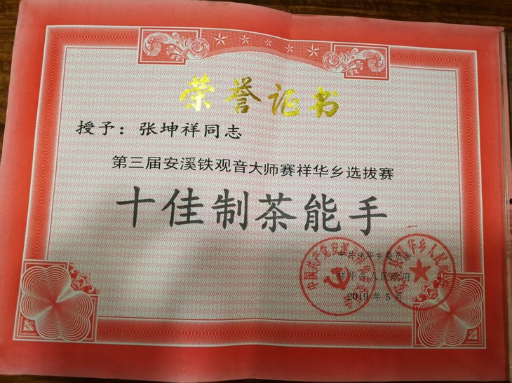 2019年获祥华乡十佳制茶能手,祥华乡是安溪铁观音的核心产区,拥有超多制茶高手,当时全乡20多个村,各自选出村里代表性制茶人参加比赛,比赛过程中,参赛选手全程独立完成,采用相同的鲜叶,同一制茶环境,同时开始,限时结束,邀请县里评委库专家做评委,评出前十,这个比赛颇具挑战性与说服力。