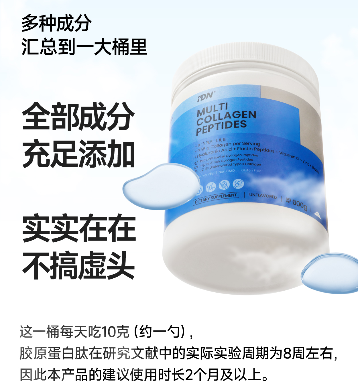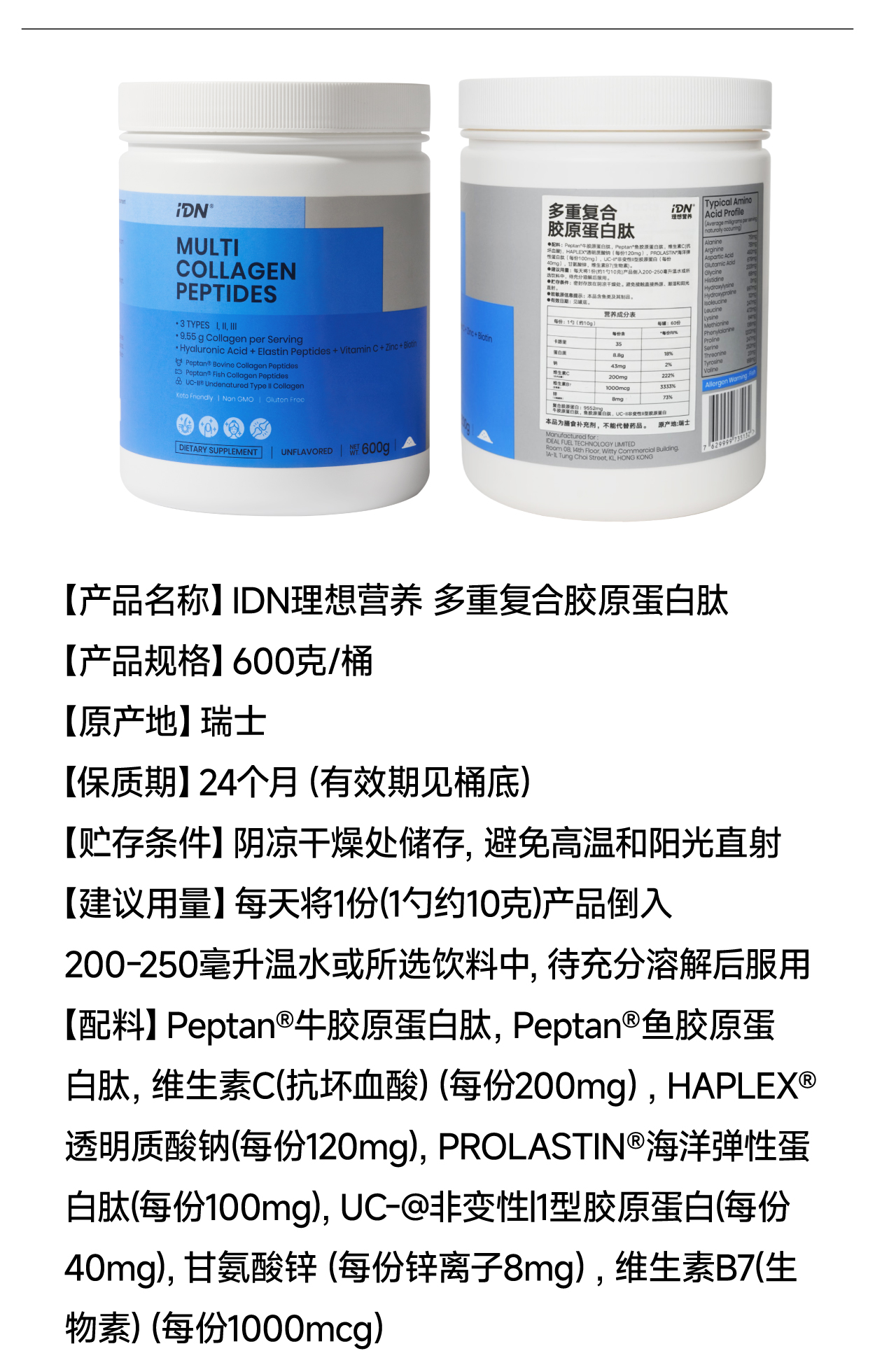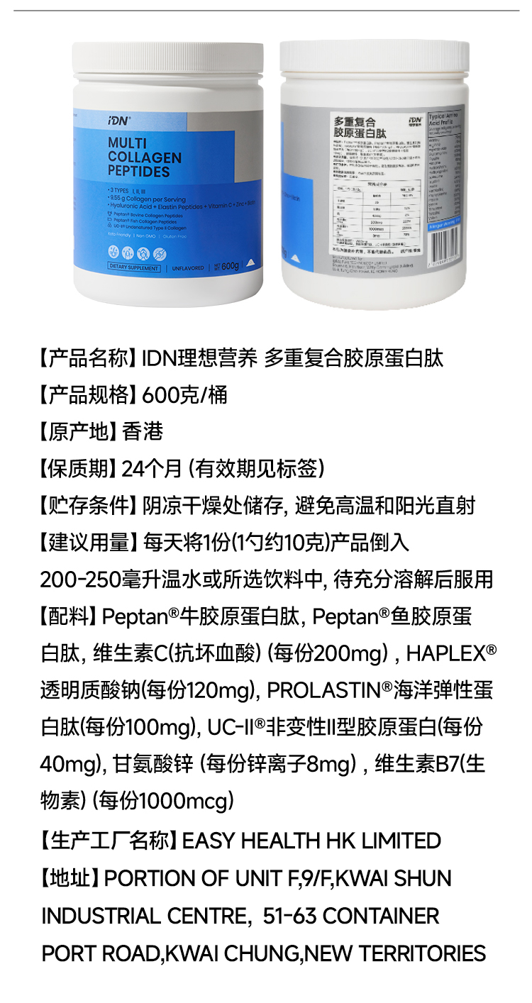 IDN理想营养 | 多重复合胶原蛋白肽600g/桶 大规格(跨境海淘商品不支持7天无理由退换)