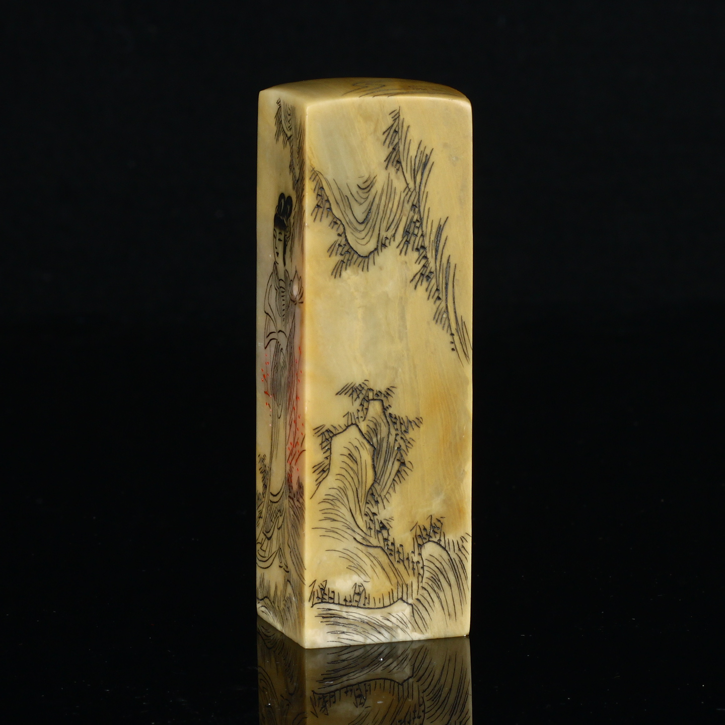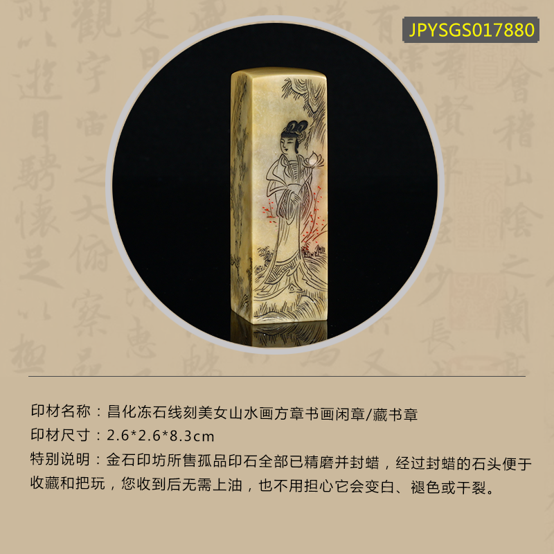 孤品17880昌化冻石线刻美女山水画方章书画闲章/藏书章2.6*2.6*8.3cm
