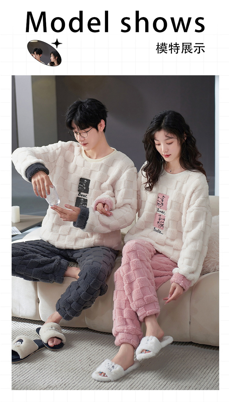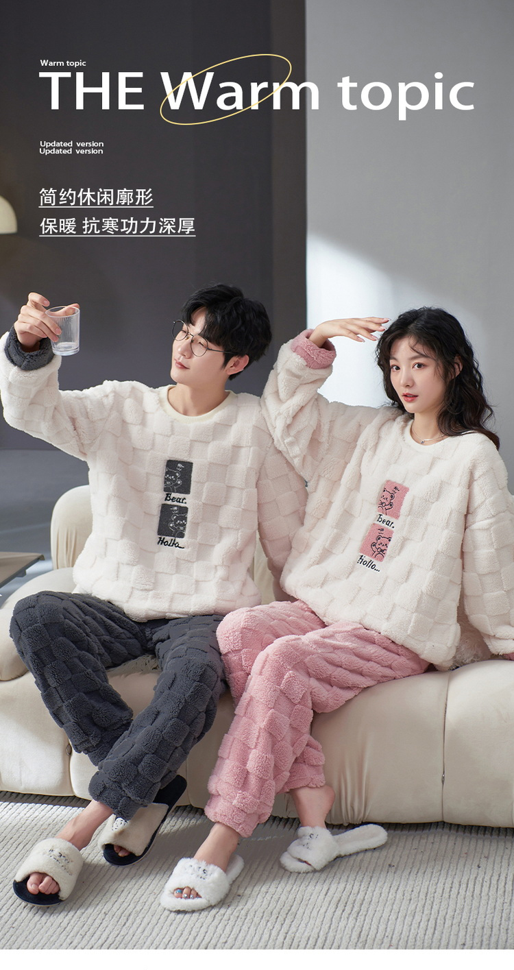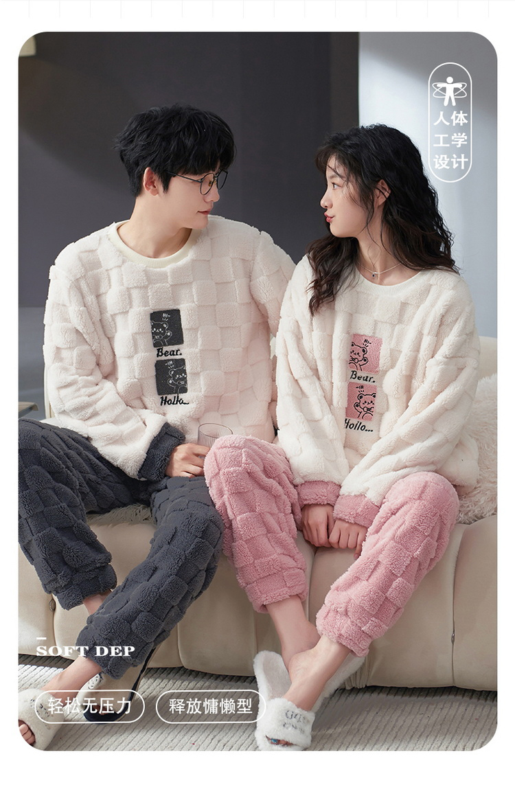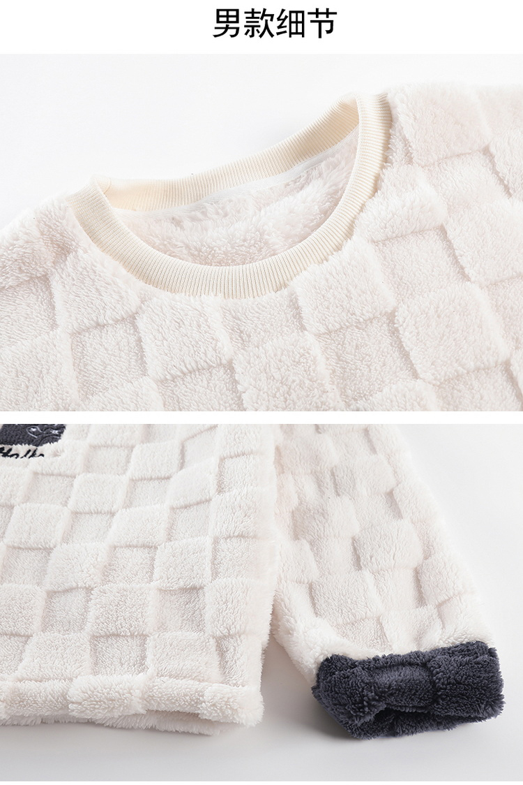 秋冬男女加绒睡衣裤 可爱卡通圆领套头家居服加厚情侣装套装