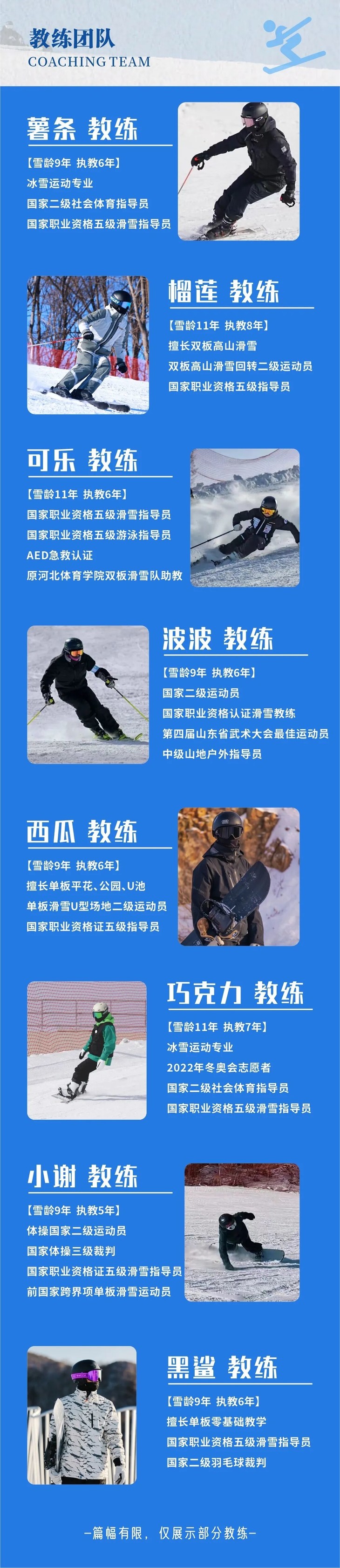 滑雪教练团队全员持证——均持有中国滑雪指导员职业资格证,更有多年儿童、青少年滑雪教学实战经验。他们既是严扣细节的专业教练,也是能和孩子玩到一起的活泼大男孩;历经层层选拔、严格筛选,每一位教员都「专业够硬,范儿够酷」!