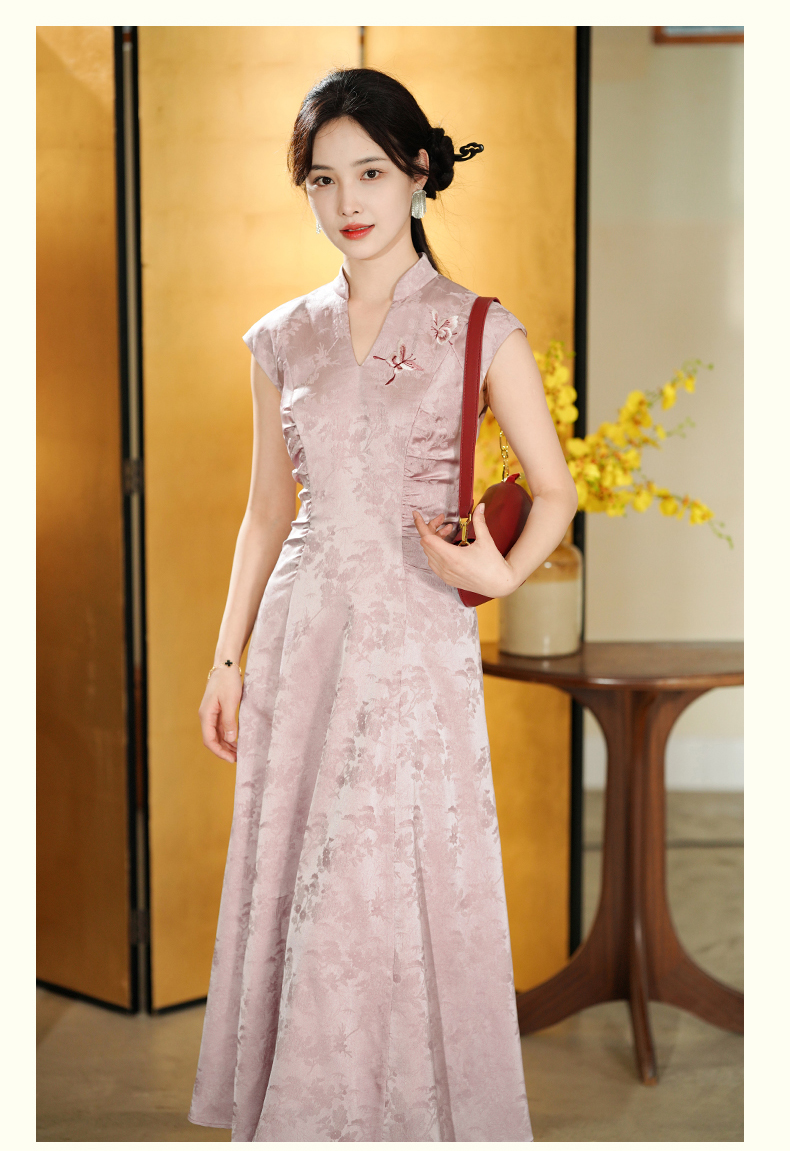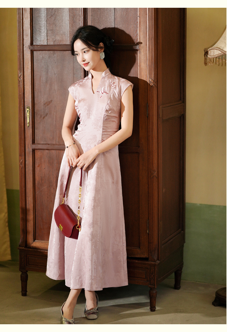 上海逸红颜若芙2025年夏季新款中式提花A摆刺绣小盖袖V领连衣裙女
