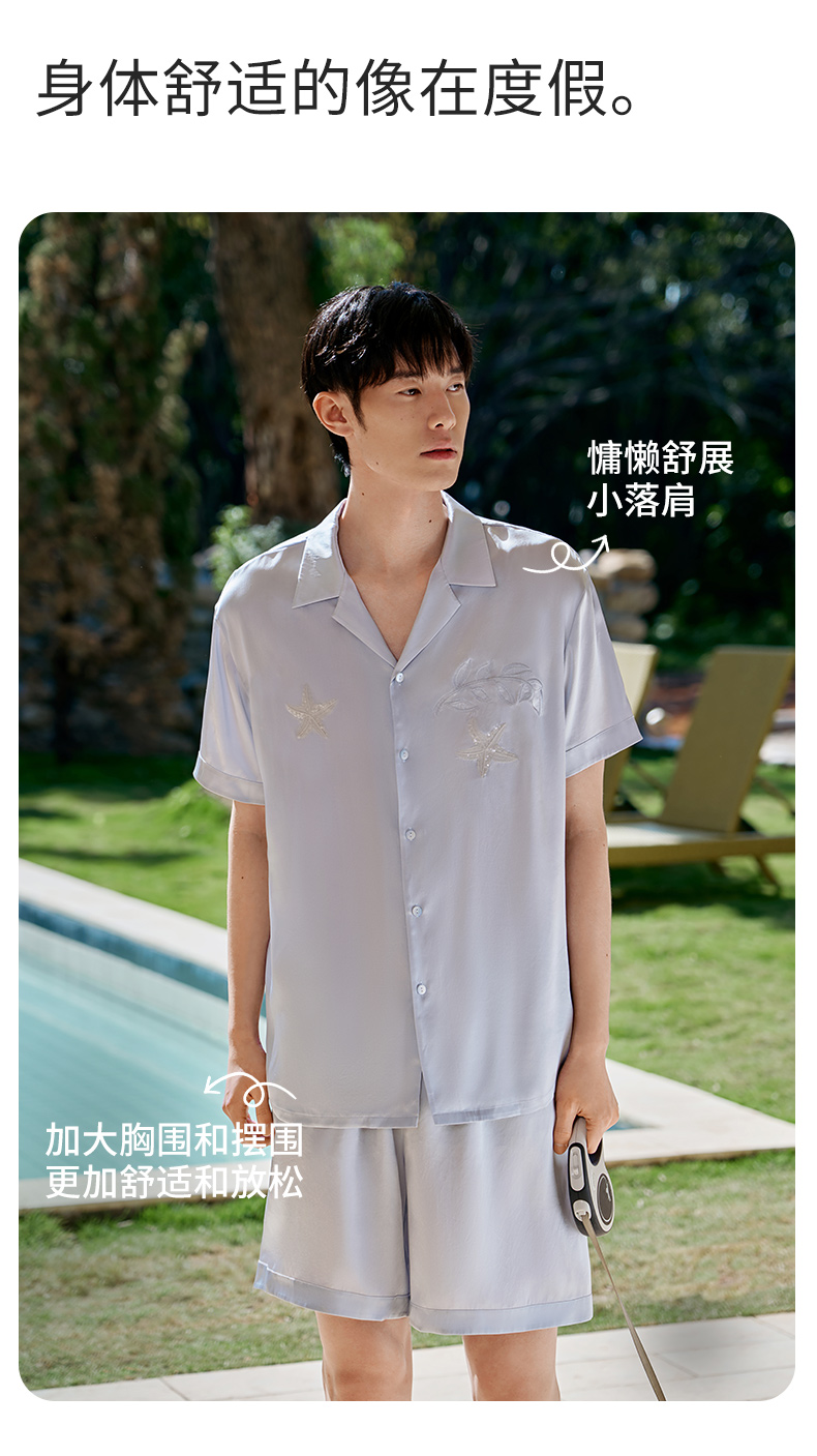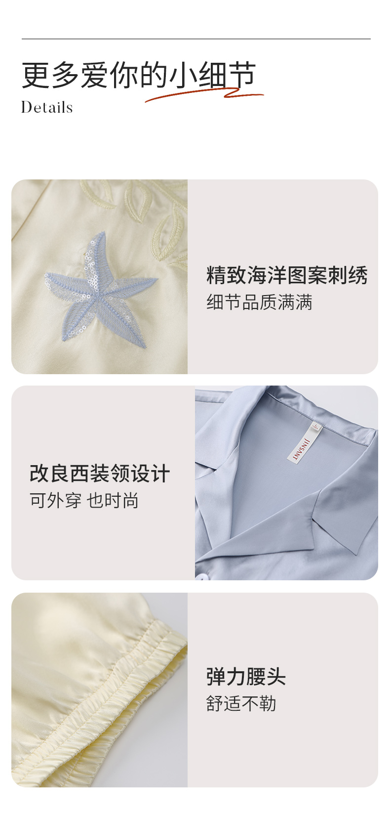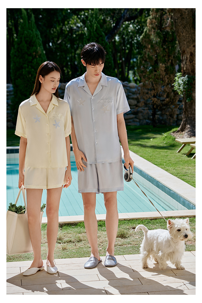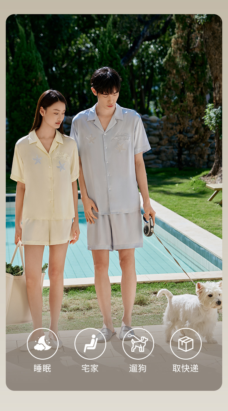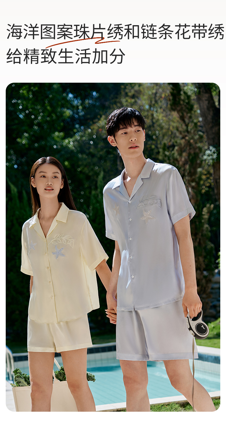 真丝睡衣女短袖短裤夏海洋系列情侣男可外穿100%桑蚕丝家居服套装 YSFFB408/YSMFB402
