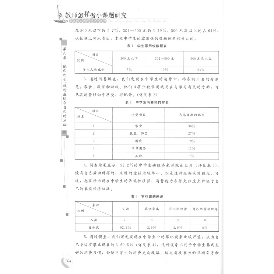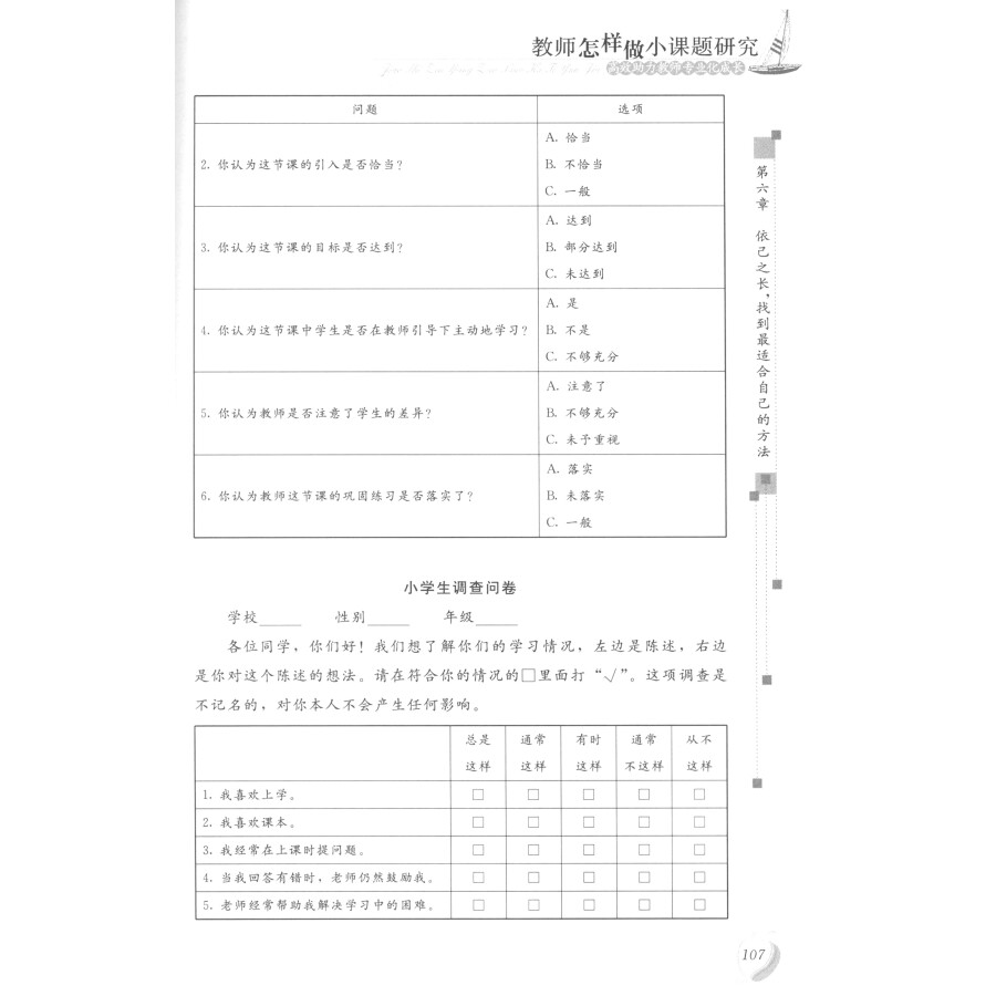序言:教师做有效研究的新突破章 好风凭借力,送我上青云唤起教师强烈的研究意识一、做研究型教师,做自己喜欢做的事二、做研究型教师能给自己带来什么第二章 不能走大路就走小路引导教师重视小课题研究一、对教师研究工作的思考二、小课题研究的基本策略第三章 从身边找到既平凡又有价值的课题对教师小课题研究的选题指导一、教师要有目标意识二、小课题研究中选题的误区三、小课题研究中的选题策略四、小课题研究的选题来源与角度第四章 想个好点子,让小课题研究少走弯路对教师小课题研究方案的设计指导一、为什么要设计研究方案二、小课题研究方案的基本框架三、设计研究方案时出现困难怎么办四、小课题研究要注重平时读书积累第五章 重在行动,关键在过程对教师小课题研究过程的指导一、小课题研究的过程二、小课题研究中要处理好的八种关系三、小课题研究中的常见问题与解决对策第六章 依己之长,找到适合自己的方法对教师小课题研究方法的指导一、模仿法移植经验二、总结法发现规律三、实验法探索规律四、叙事研究法讲述自己的故事五、案例法描述规律六、调查法研究规律第七章 观念决定思路,思路决定出路对教师小课题研究思路的拓展一、运用发散法,突破框框二、运用改变法,平中见奇三、运用逆向法,出奇制胜四、运用替代法,独辟蹊径五、运用移植法,锦上添花六、运用体验法,唤醒自主七、运用添加法,凸显本质八、运用缩减法,以简驭繁第八章 一边研究一边回头看对教师小课题研究教学反思的指导一、反思总结是教师成长之桥二、怎样理解教学反思三、怎样写教学后记四、教育叙事研究第九章 集腋成裘,点石成金对教师小课题研究成果表述的指导一、怎样撰写陈述性的小课题研究报告二、怎样撰写叙述式的小课题研究报告三、怎样撰写教育调查报告四、怎样撰写教学模式五、怎样撰写教育叙事六、怎样撰写教学案例第十章 让成果转化为生产力对教师小课题研究成果交流推广的指导一、怎样交流和发表论文二、怎样推广应用小课题研究成果第十一章 小课题研究怎样才能笑到后对教师小课题研究激情的指导一、如何将小课题研究进行到底二、克服职业倦怠心理三、相信自己一定能成功四、怎样科学利用时间五、勇于面对挫折和失败第十二章 抓小课题研究,引领教师专业成长对教师小课题研究的组织指导一、对教师小课题研究工作的组织二、对教师小课题研究的指导三、小课题研究成果的推广应用第十三章 把住考核验收关,保证小课题研究质量对教师小课题研究成果评价标准的指导一、小课题研究成果考核评价方案二、小课题研究成果的考核评价标准附录 课题研究要;浅入;深出听徐世贵校长报告有感后记
