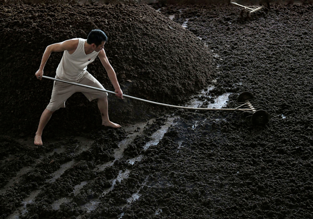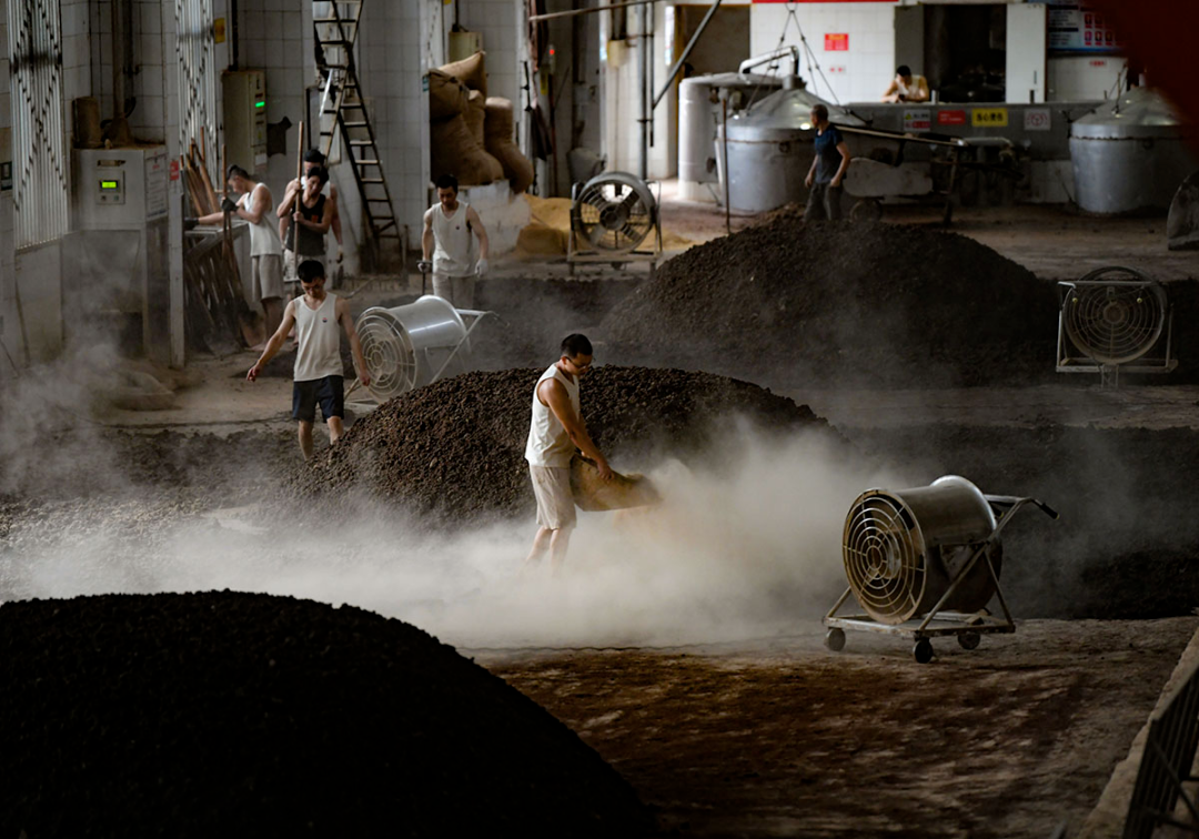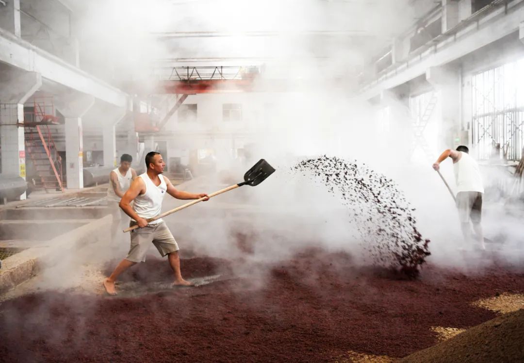 取酒之后的酒糟,继续摊凉、加曲、收堆、下窖、蒸煮和取酒,如此周而复始,每月一次,直至第七次酒取完。