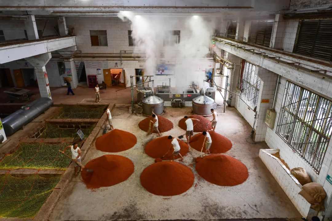 每年端午,茅台镇入夏伊始,封闭的制曲车间气温高达40°C,非常利于微生物生长。