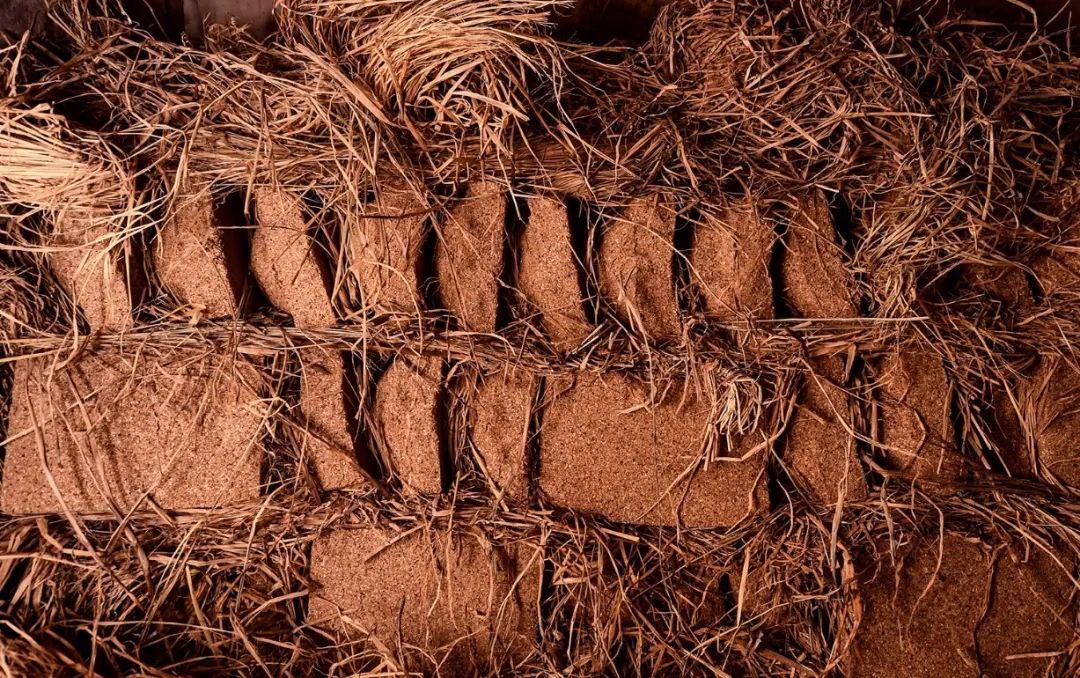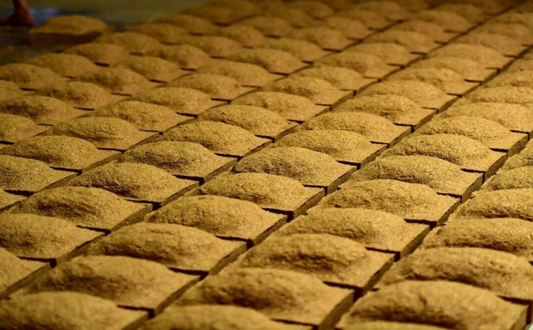 制曲师将小麦粉碎后,做成块状,用谷草包起来装仓发酵。