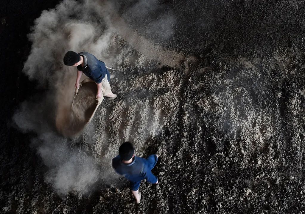 “沙”即高粱,高粱蒸熟70%左右,出甑摊凉至35度左右,加入酒曲,搅拌均匀,进行“高温堆积”。