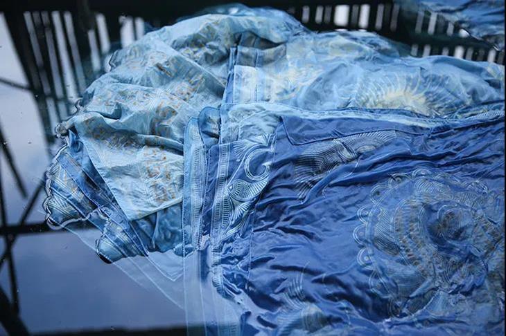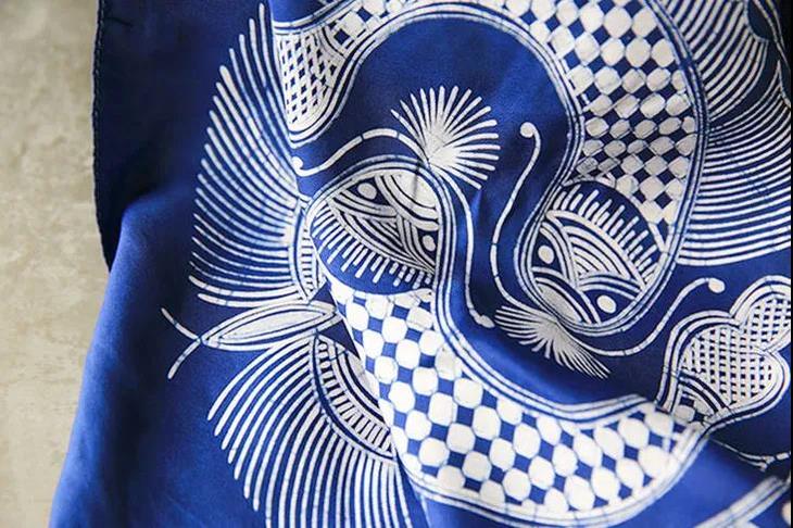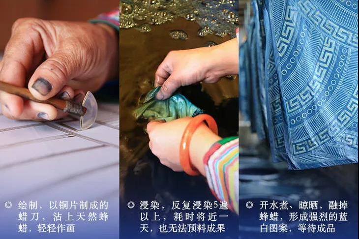 她们采用非遗蜡染手艺先以蜡刀为笔、天然蜂蜡为墨,在丝绸上手工作画,然后反复用天然板蓝根染色,方可得到这抹人间绝色。一撇一捺、一笔一划,即使再富有经验的匠人,也无法画出两个相同的图案。
