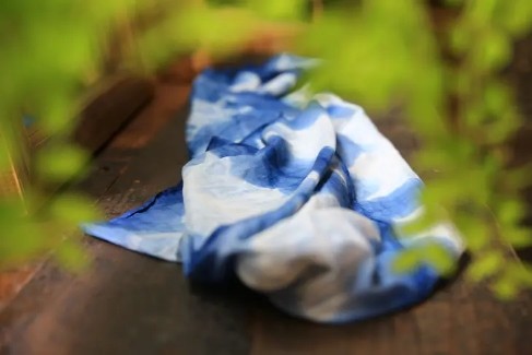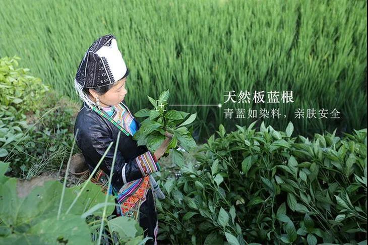 板蓝根,色泽青蓝如染料,所以常被用来染色。而且本是一味中药,所以比化学染料更亲肤安全,还可以缓解痱子的生长。但是长得粗壮、汁液丰腴的板蓝根只可见于澄净的深山,不可多得,成本很高,因此市面上采用板蓝根手染的作坊寥寥无几。