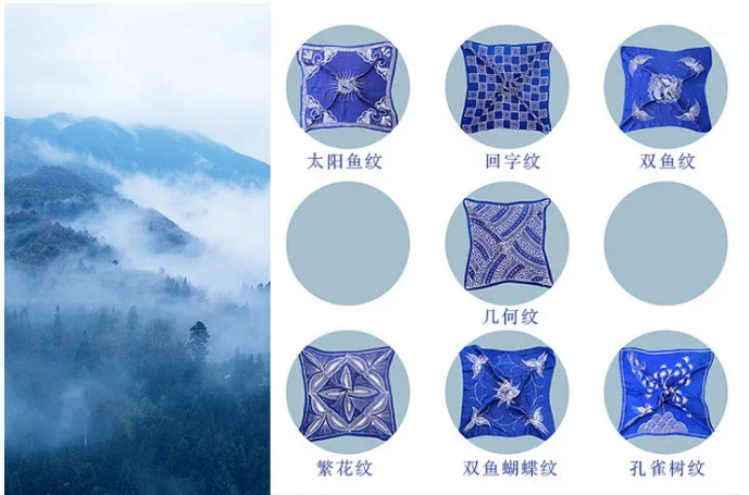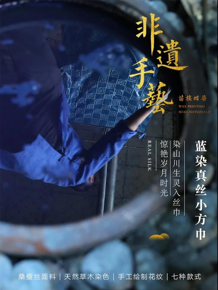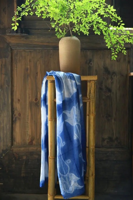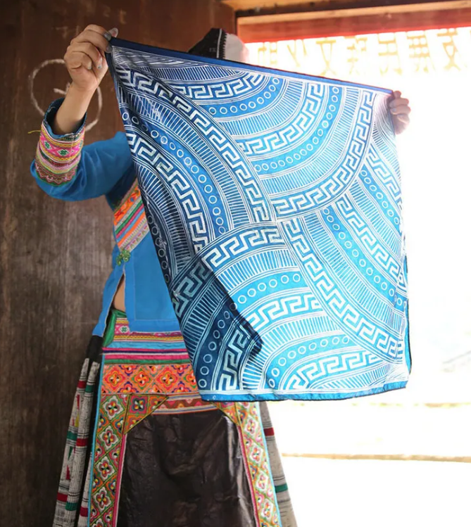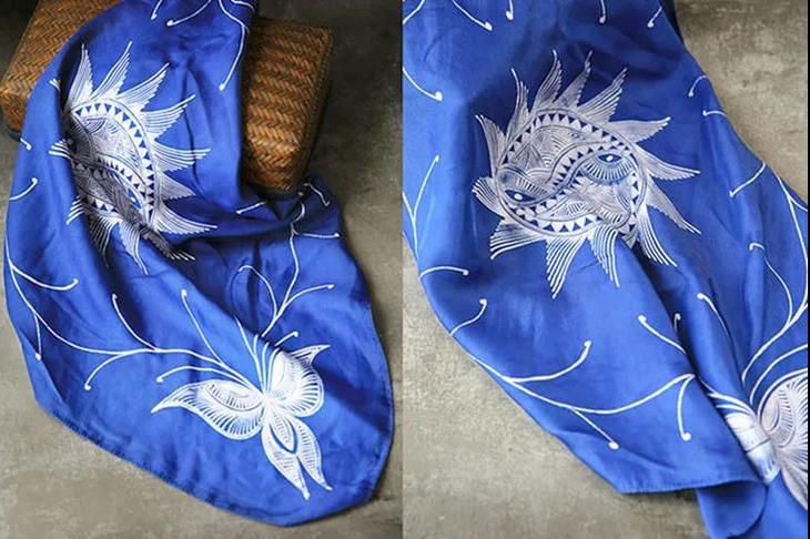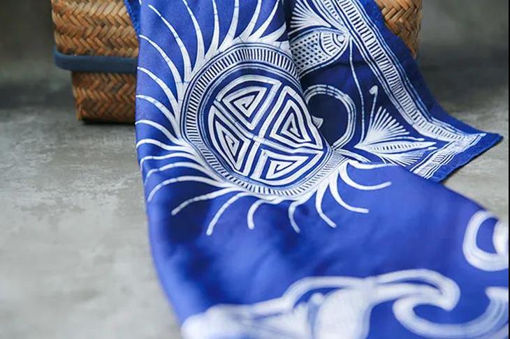 每一条丝巾,蓝与白交织,皆是苗族妇女对山川生灵的刻画、对文化印记的传承。