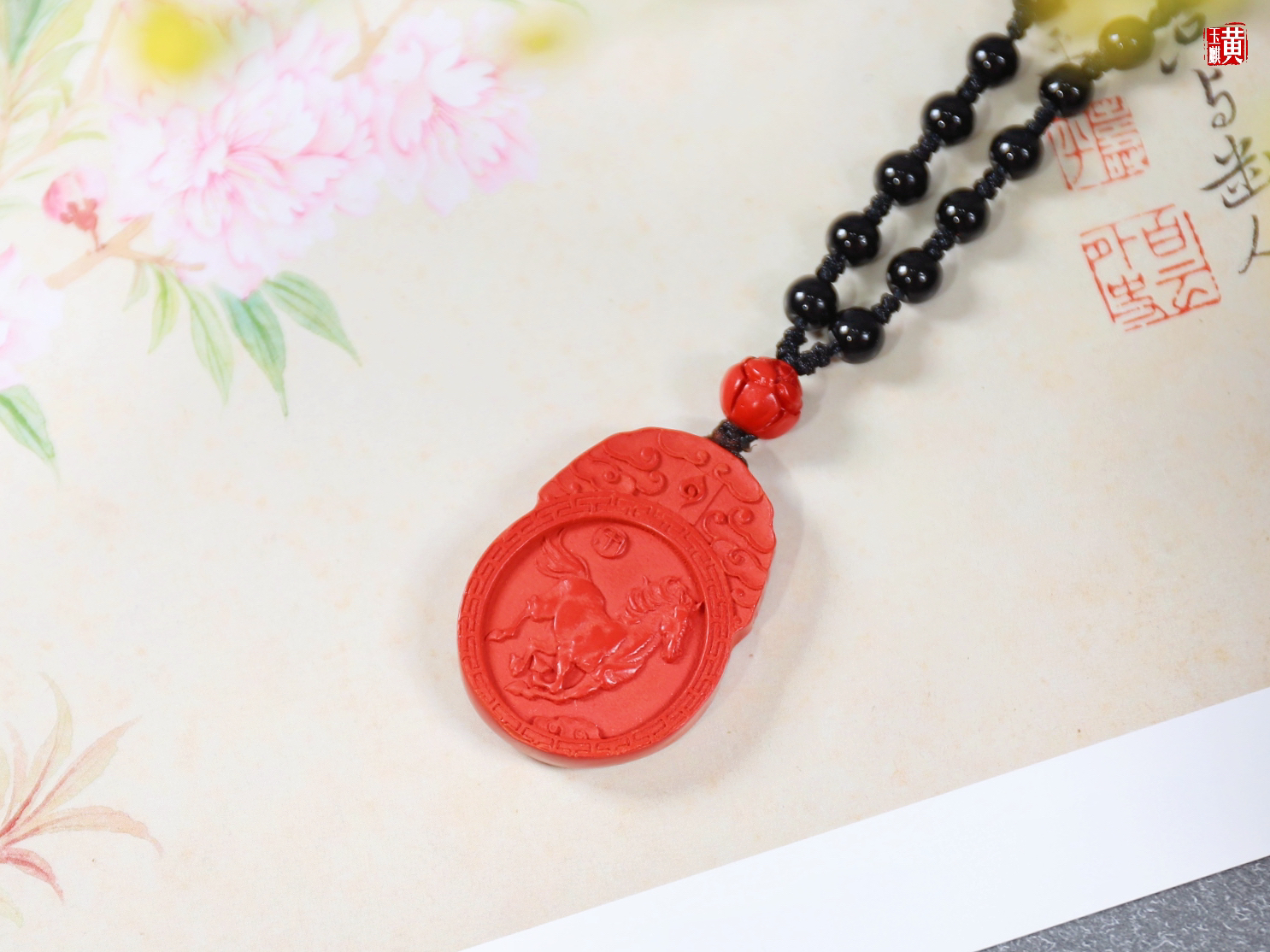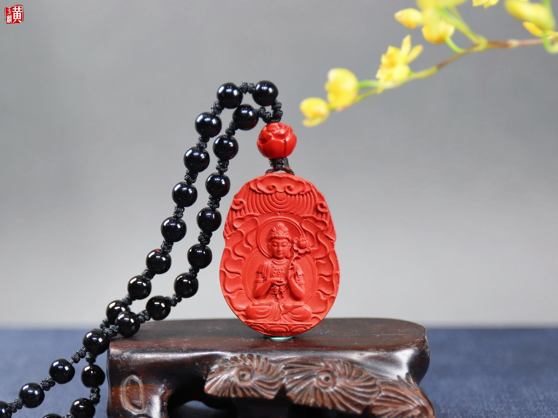 配黑玛瑙挂绳、朱砂莲花顶珠