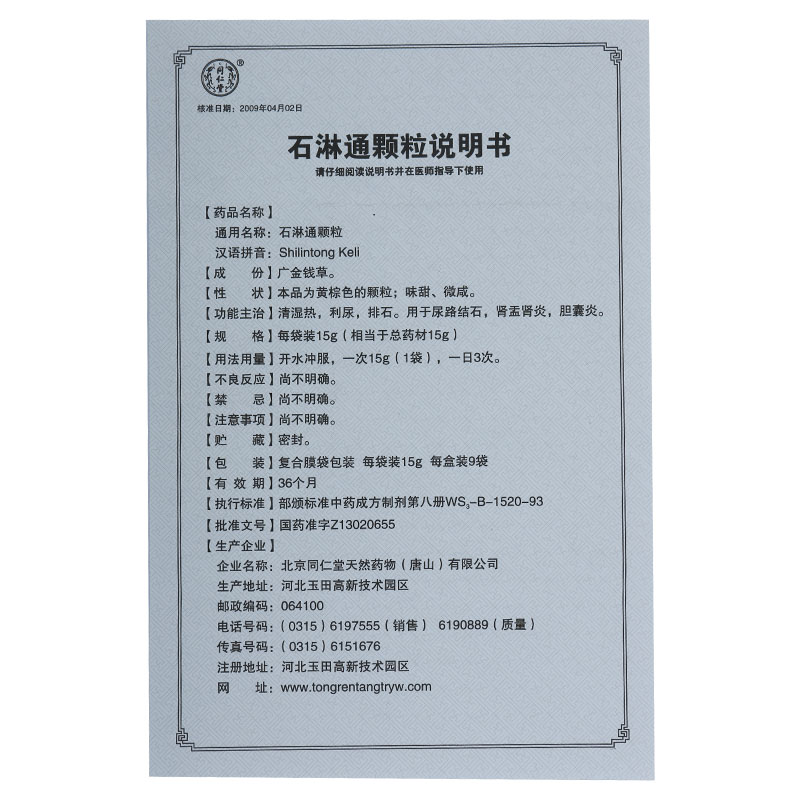 1盒包邮】同仁堂 石淋通颗粒 15g*9袋/盒 排石利尿清湿热 用于胆囊炎 尿路结石肾盂肾炎搭配(如 黄藤素软胶囊,左氧氟)