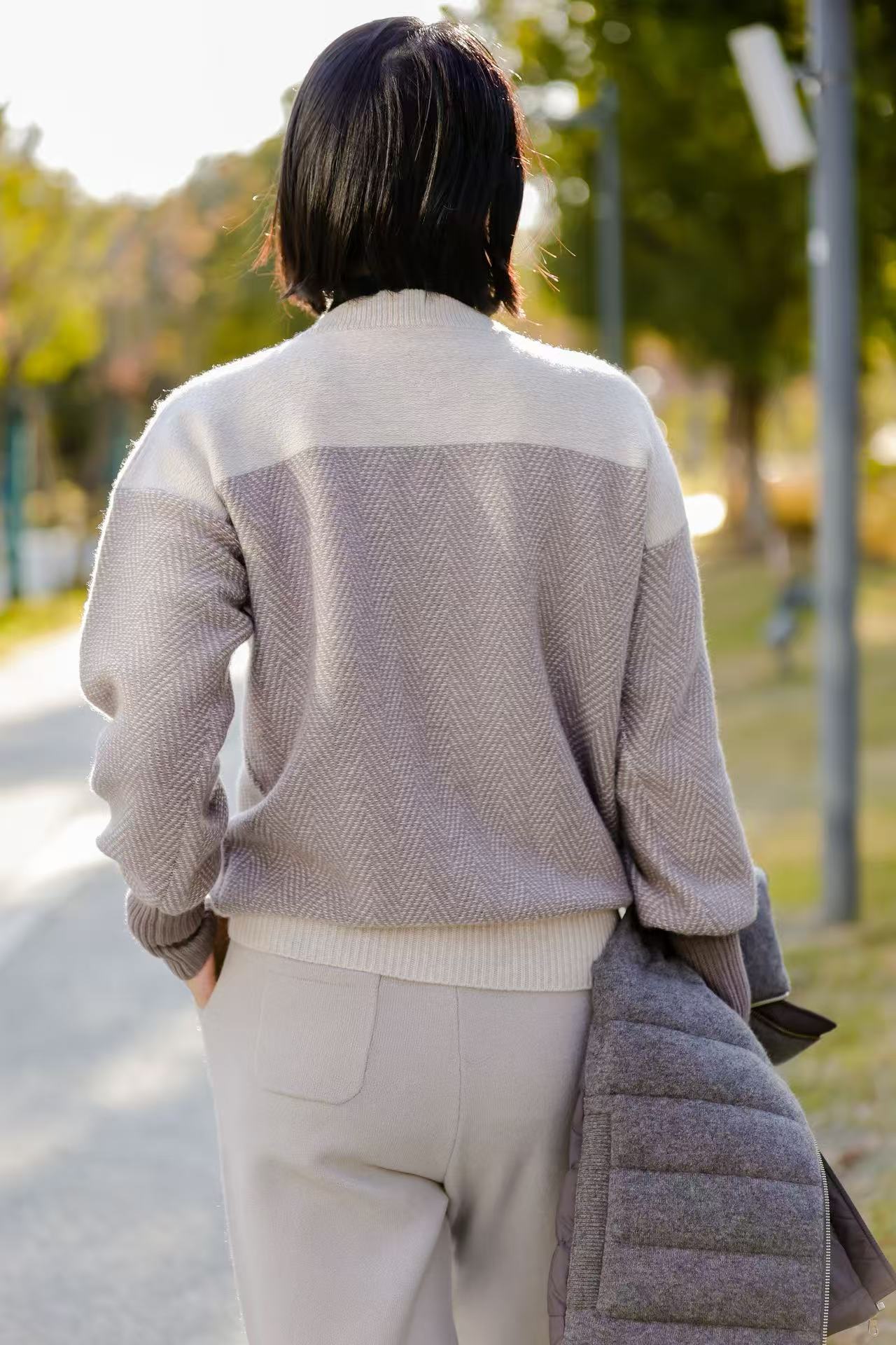 此款圆领上衣采用提花编织工艺