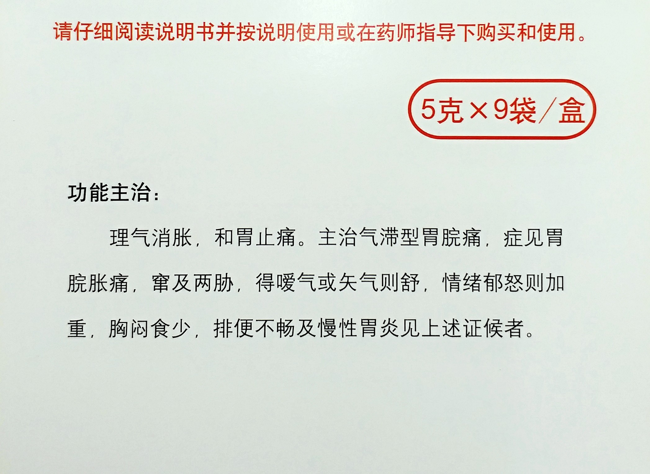 理气消胀,和胃止痛。主治气滞型胃脘痛,症见胃脘胀痛,窜及两胁,得嗳气或矢气则舒,情绪郁怒则加重,胸闷食少,排便不畅及慢性胃炎见上述证候者。