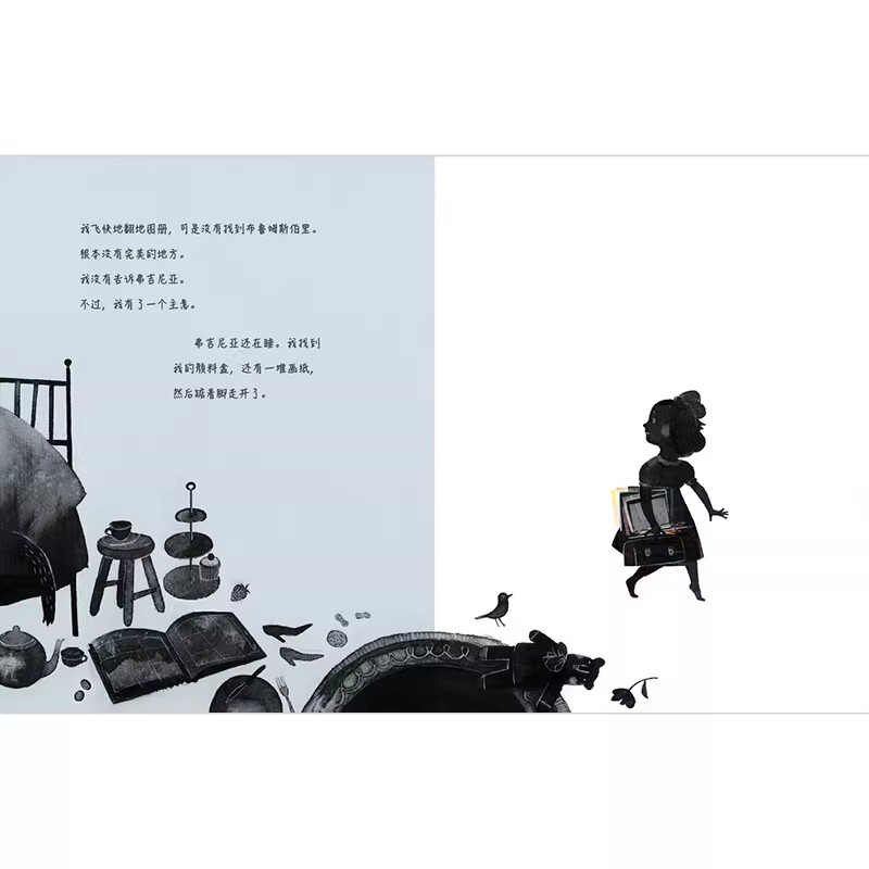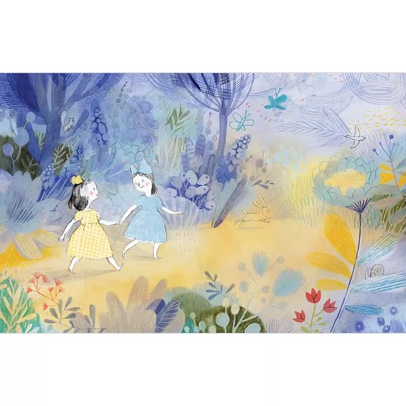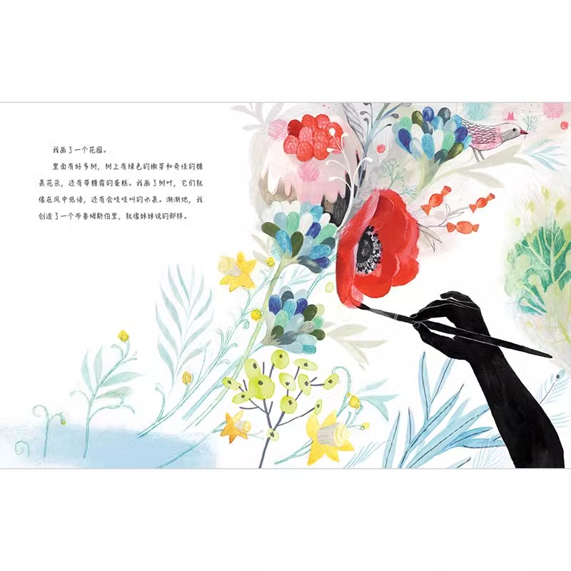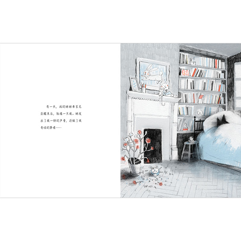 这是一个关于两姐妹的故事,一个郁郁寡欢,一个喜气洋洋,两人的想象力都非常丰富。图书从姐姐温内莎的视角出发,描述了妹妹弗吉尼亚*近的反常——她像一只暴躁的狼,不停地咆哮、嚎叫,怪模怪样的,闹得全家人都心慌慌。温内莎用尽办法帮妹妹打起精神,但毫无用处,直到弗吉尼亚告诉温内莎一个秘密,一个她想象中的世外桃源。温内莎受这个想法的启发,开始在卧室的墙上画妹妹心中美丽的桃源,还添上了秋千和梯子直通窗子。花园在她们的想象中鲜花盛开,鸟语花香。弗吉尼亚看到这些,终于从“狼”变回了自己,和姐姐一起开开心心地到室外玩耍了。