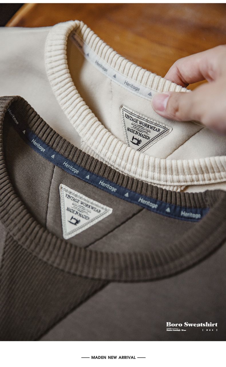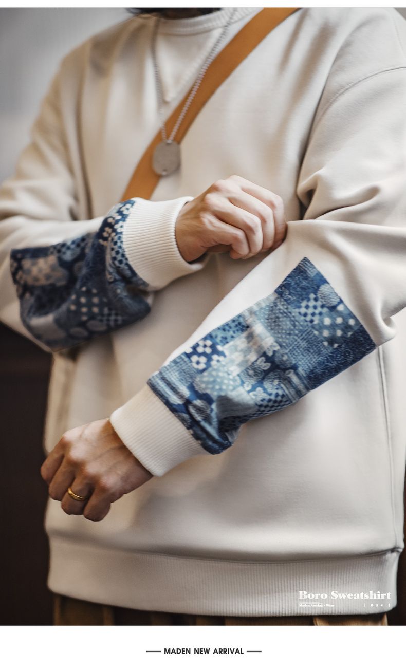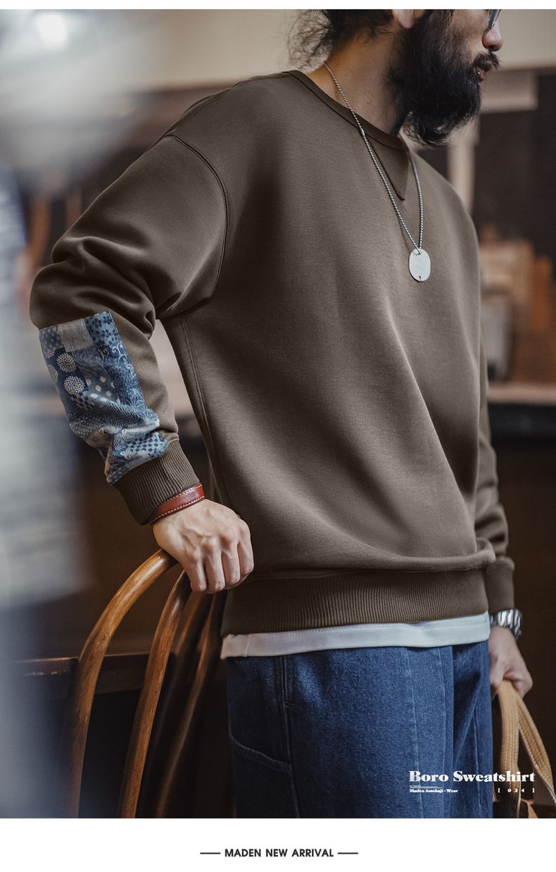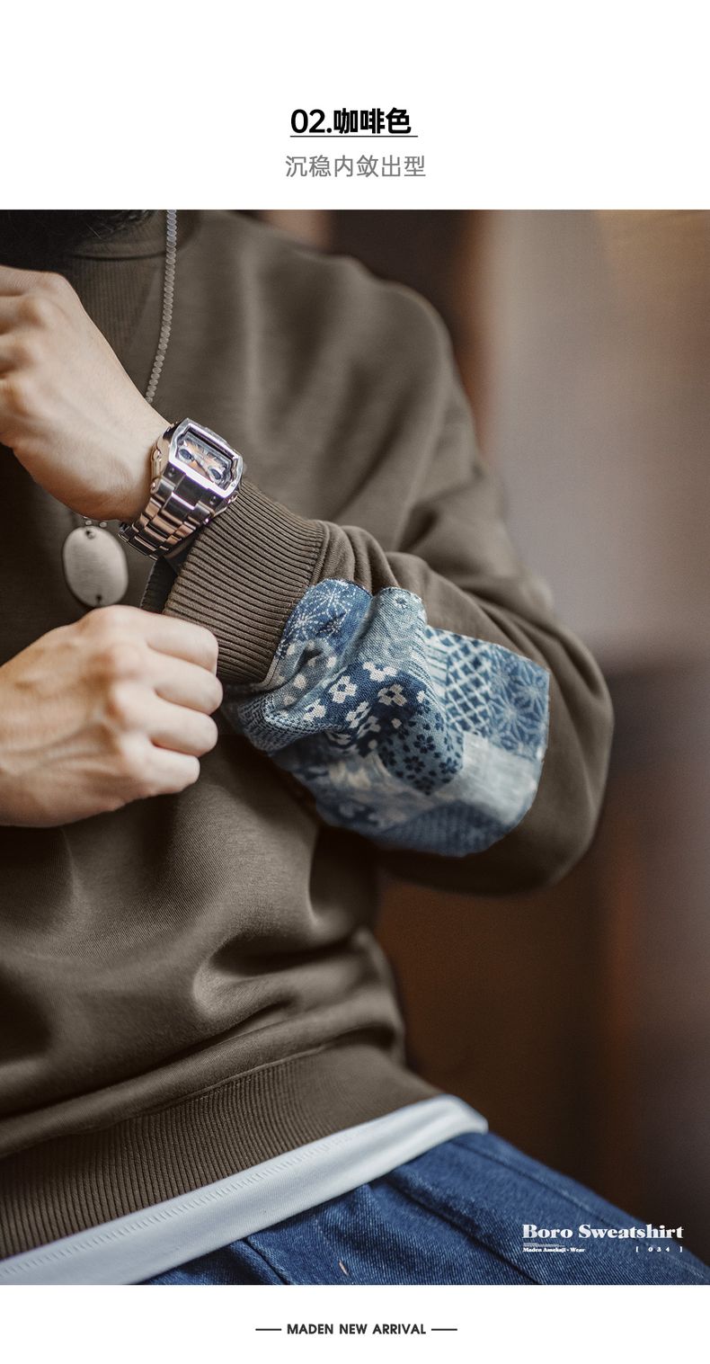 工装优选日系复古百家布拼接卫衣boro风休闲上衣圆领套头衫男春季