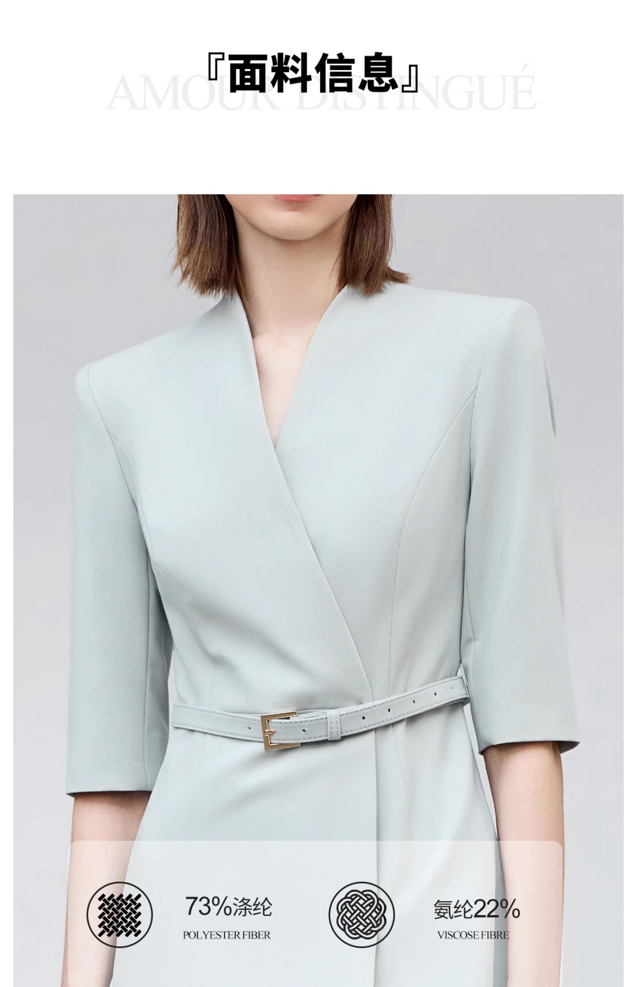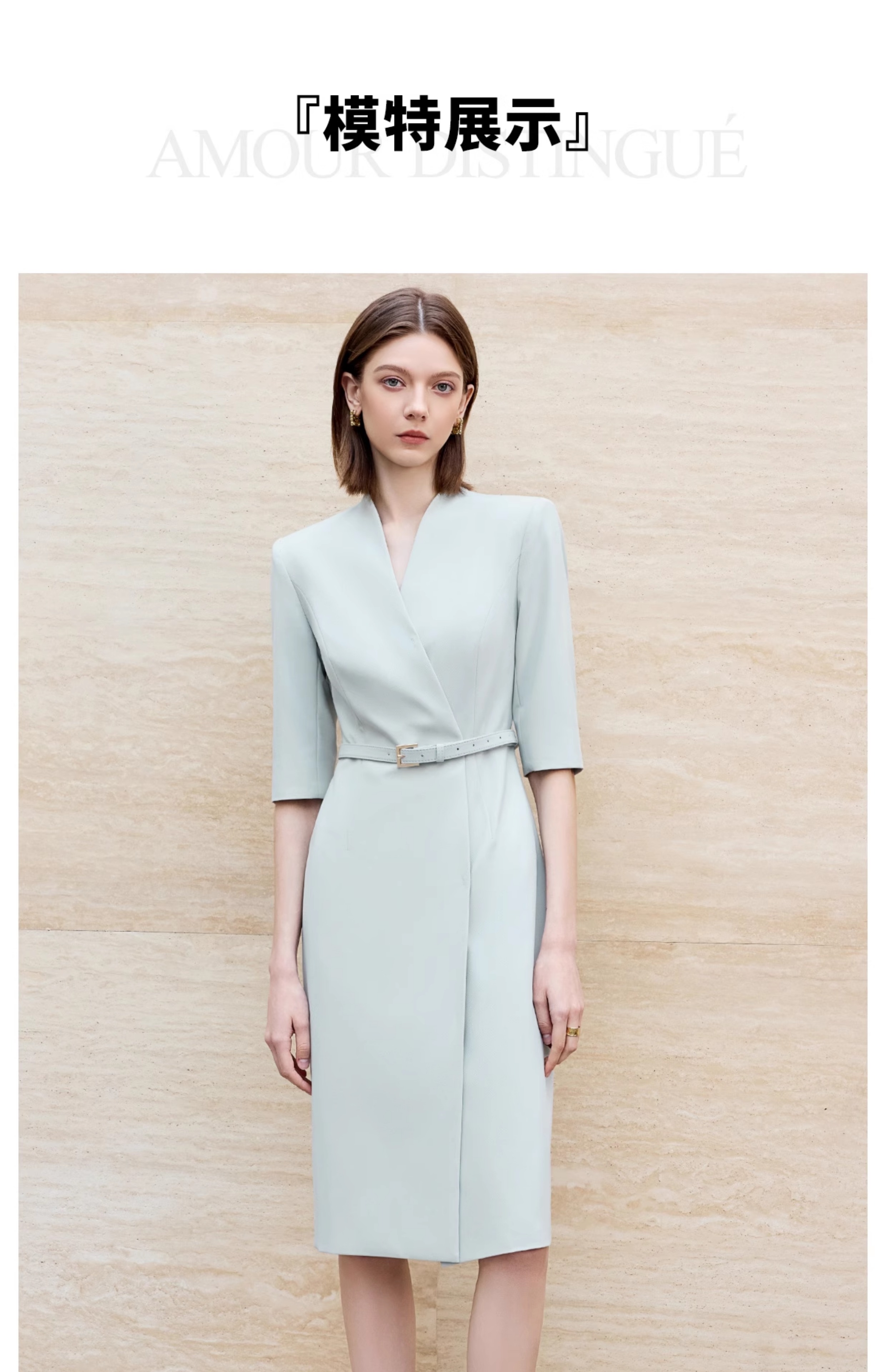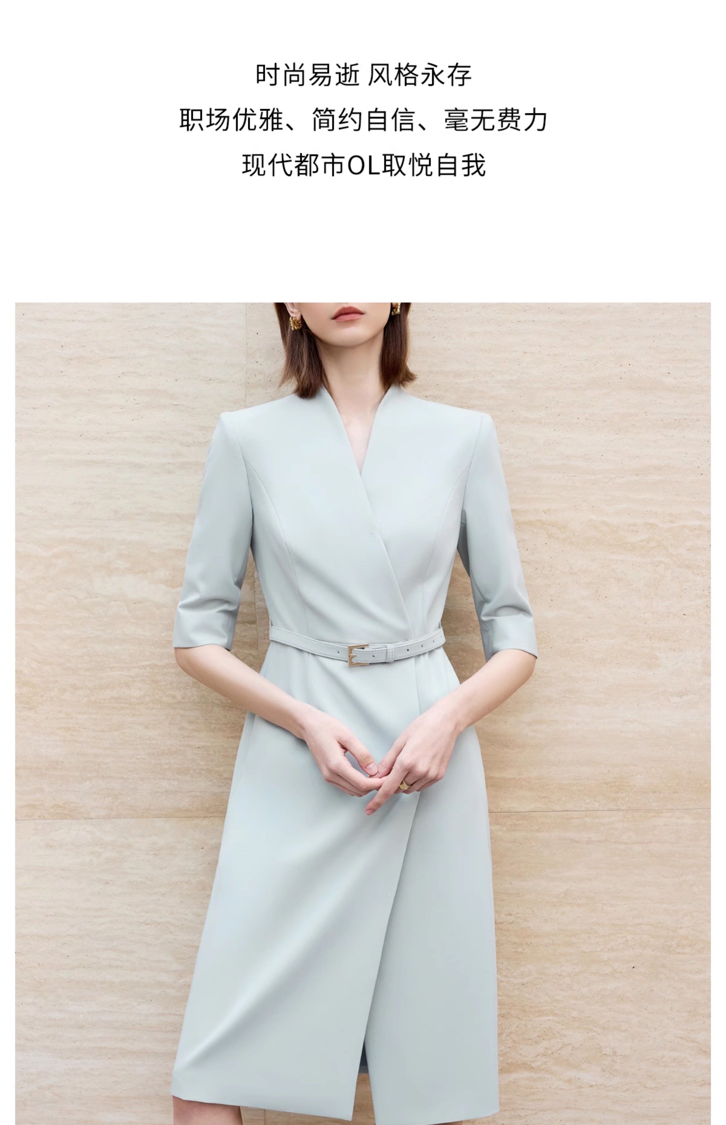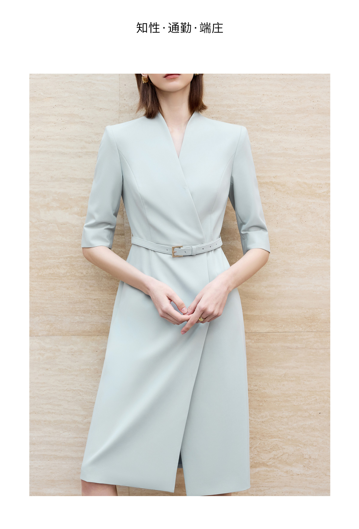 浅蓝色V领轻职业连衣裙高端大气上档次
